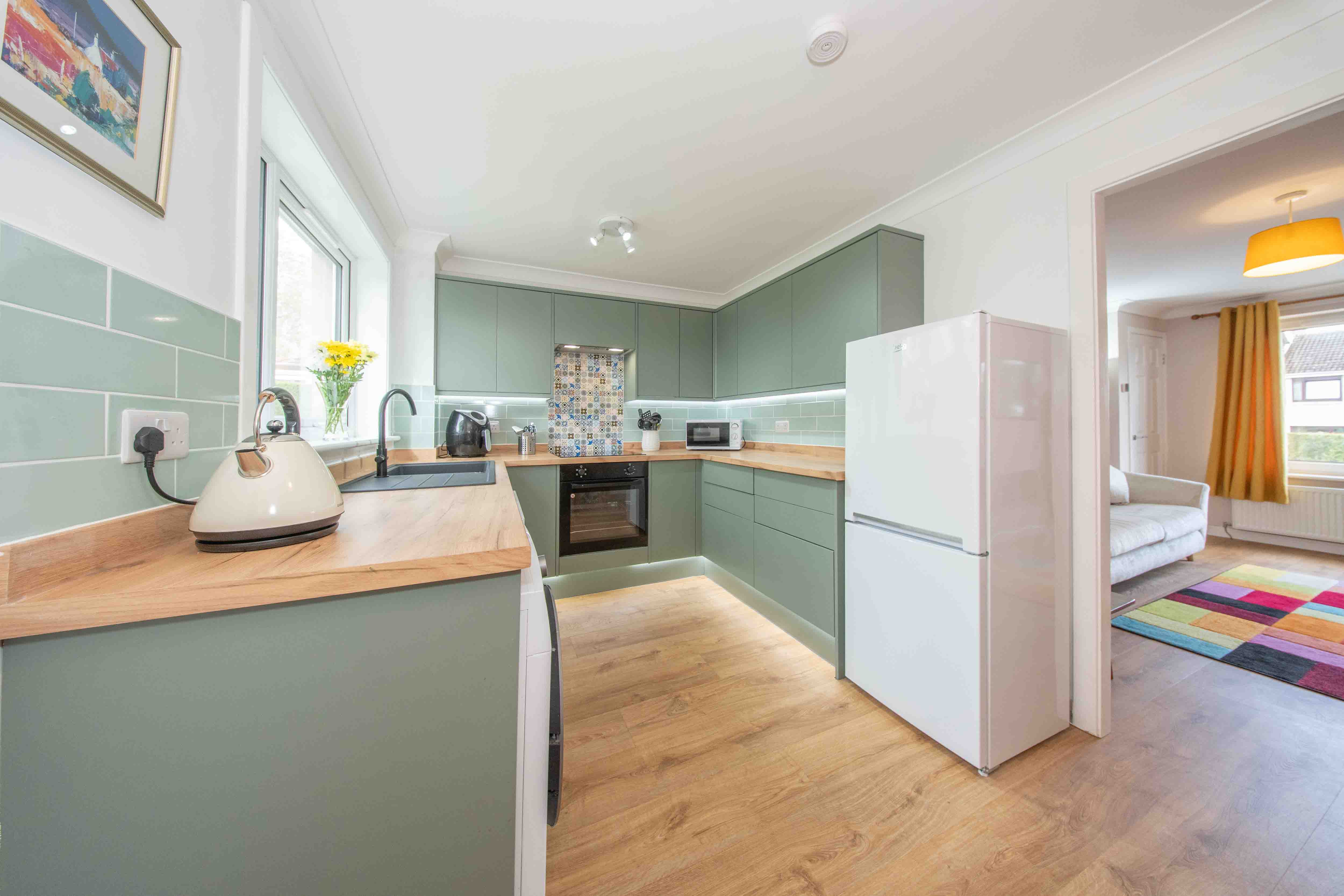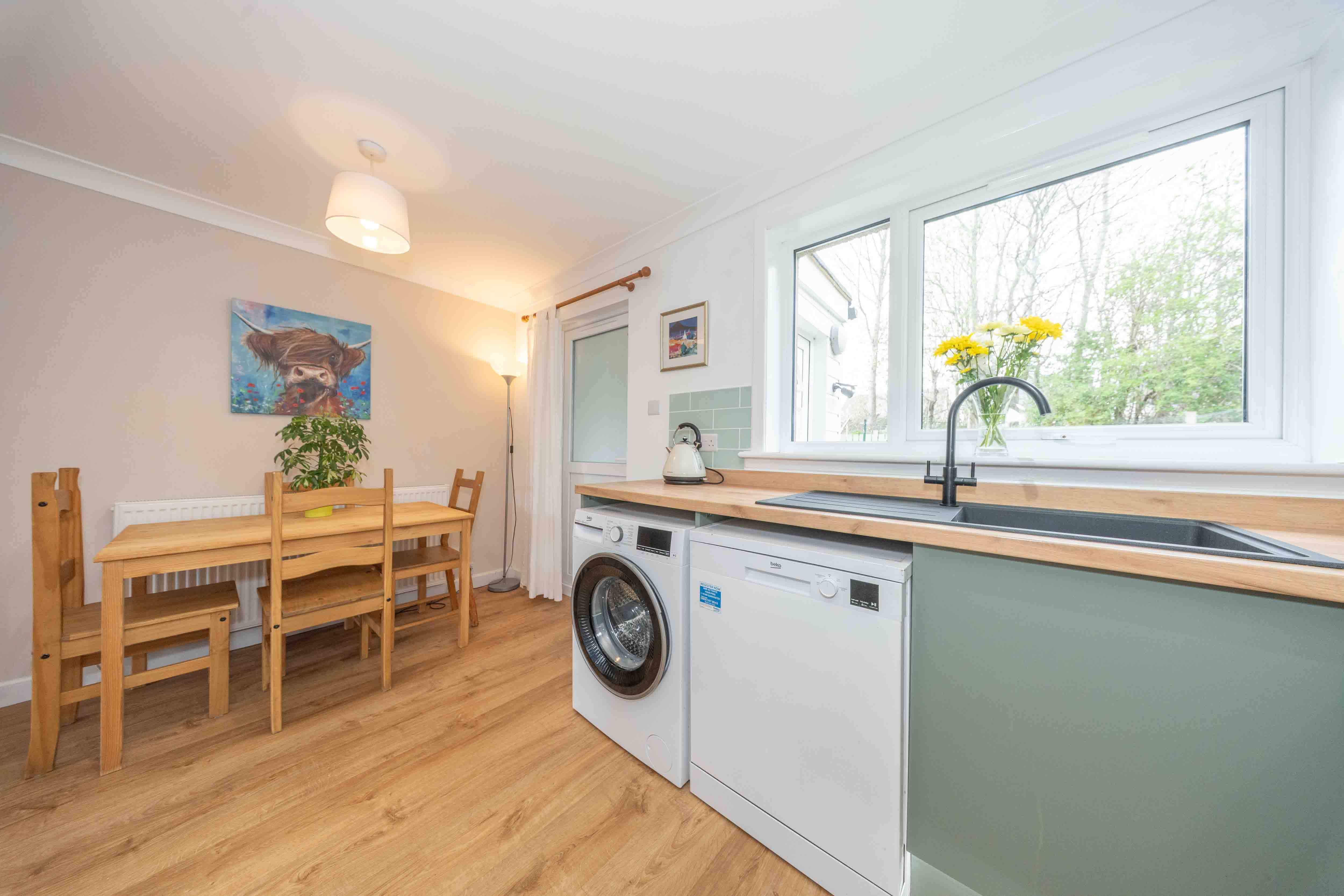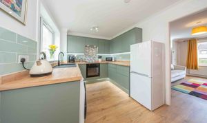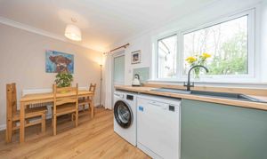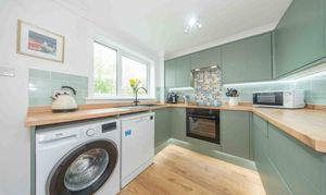 This new, thoughtfully designed kitchen perfectly balances style and practicality, featuring a range of sleek wall and base units with green frontages, complemented by a wood laminate worktop and a metro tiled splashback. White and neutral tones to the walls, and continued wood laminate flooring create a cohesive and contemporary finish. Fully equipped for modern living, the kitchen includes an under counter oven, four ring electric hob, built in extractor hood, washing machine, dishwasher, and a tall fridge freezer. A black sink with drainer and mixer tap is ideally positioned beneath the rear facing window. Natural light floods the space through the rear window, while two ceiling lights and under unit lighting provide additional illumination. There is ample room for a dedicated dining area, making it perfect for both everyday family meals and entertaining. Completing the space are power points, a radiator, and a heat detector.