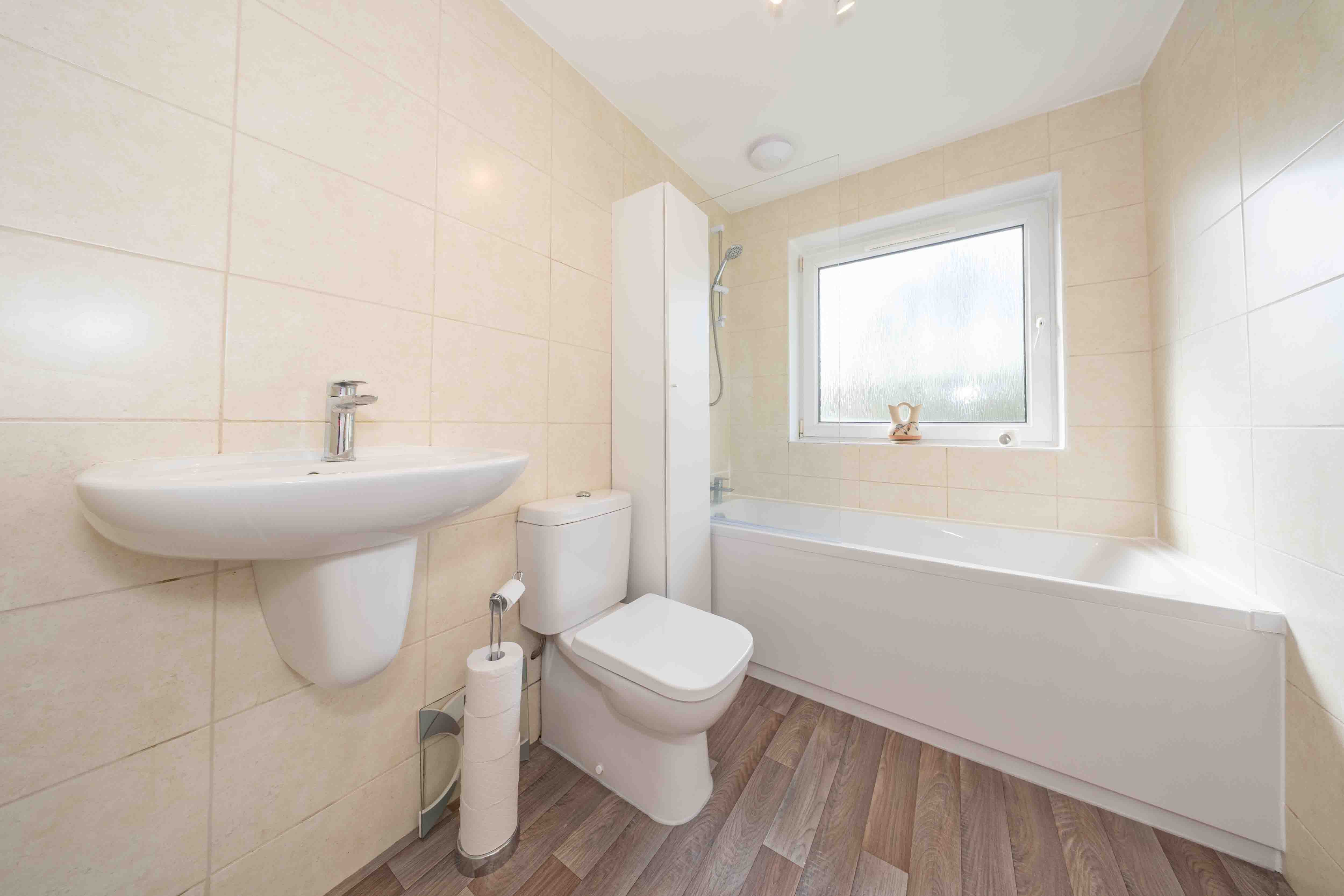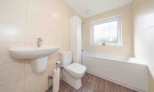 This modern family bathroom combines everyday practicality with contemporary elegance. Durable wood effect vinyl flooring is paired with cream tiled walls, creating a fresh, low maintenance finish, while a ceiling light enhance the bright and welcoming feel. The suite includes a bath with an electric shower overhead, along with a wall hung sink and close coupled toilet for a streamlined look. A rear facing window provides natural light, while a chrome towel radiator completes the space.