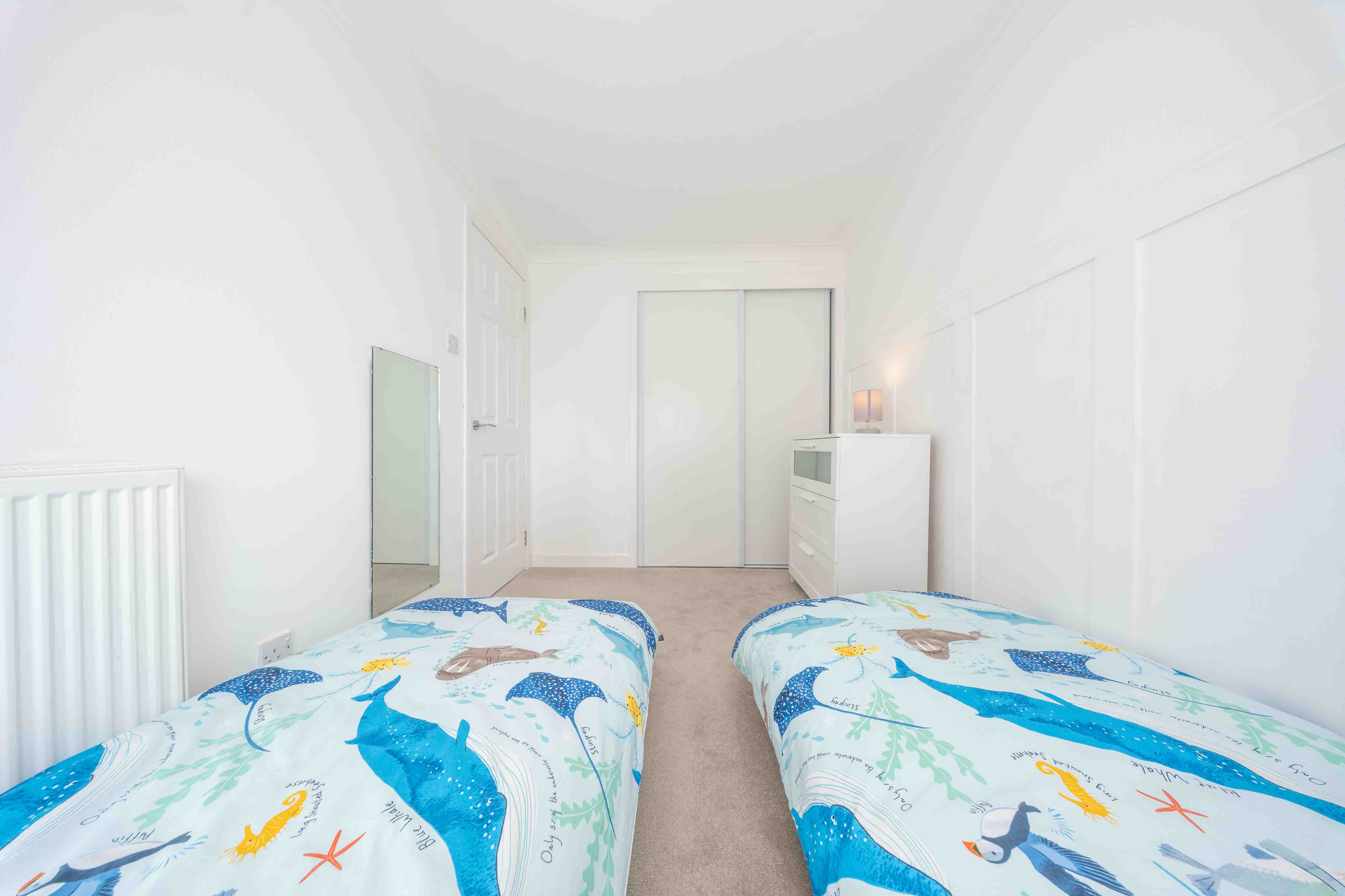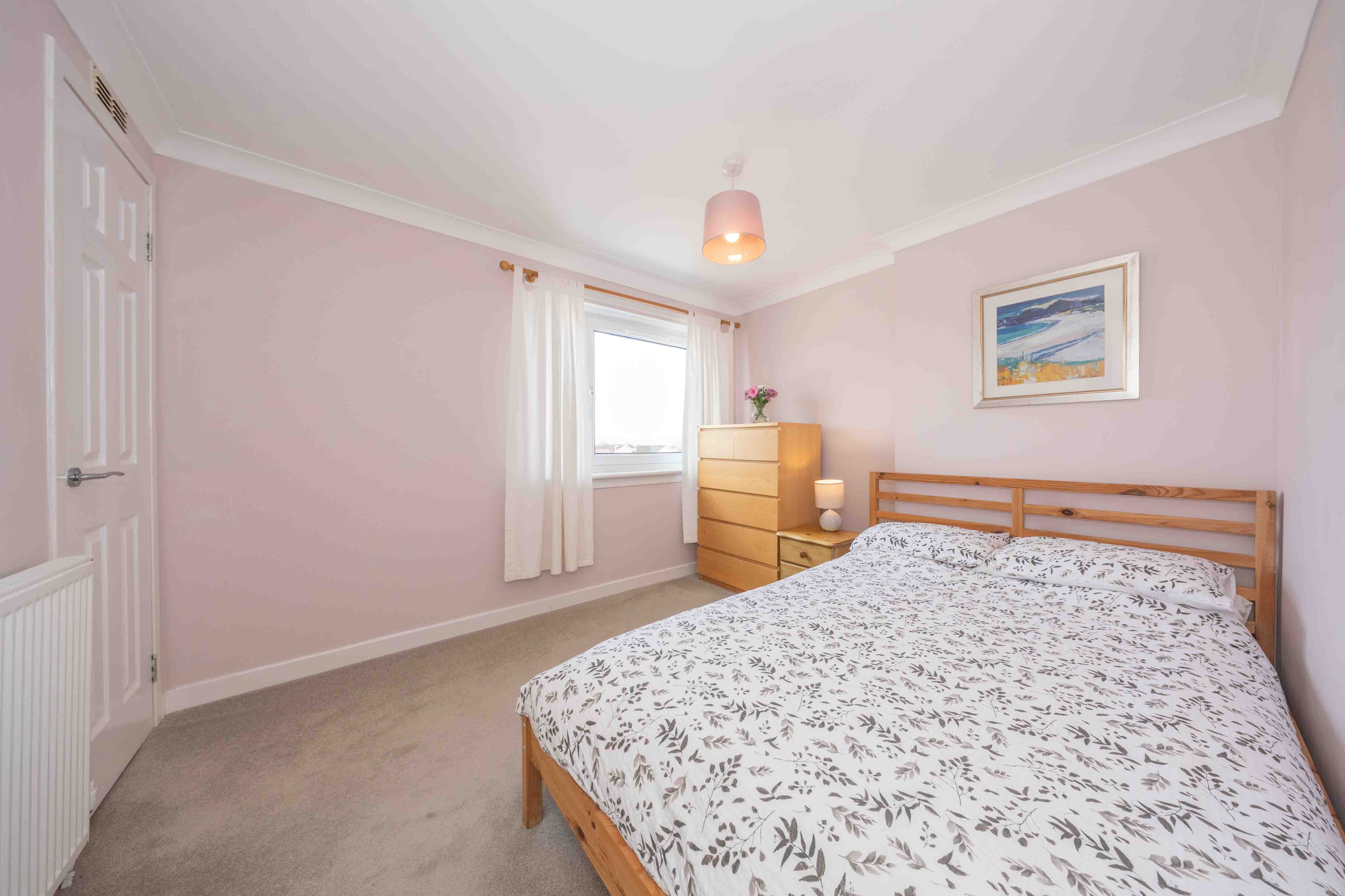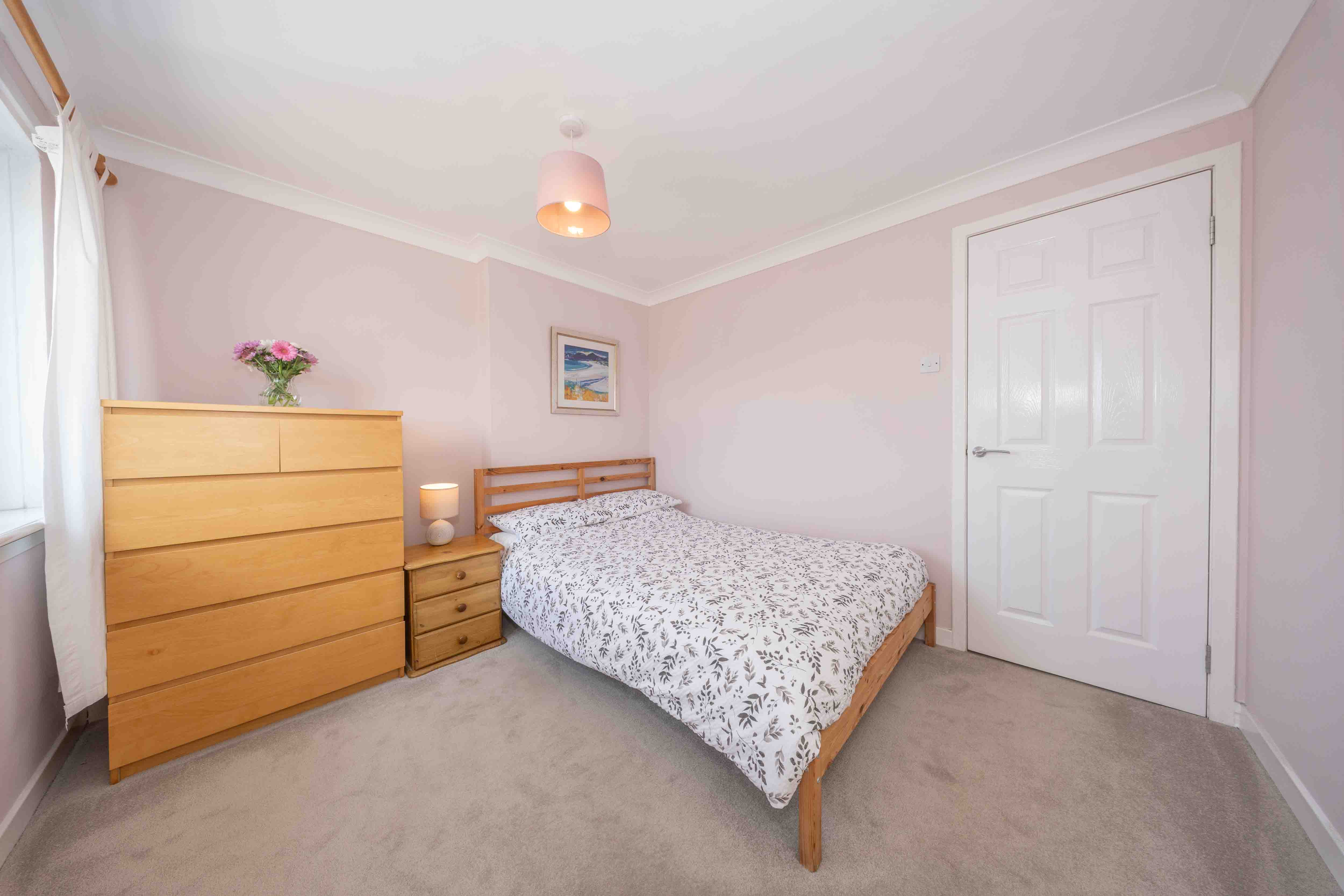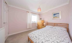 This great second double bedroom is tastefully finished with white painted walls and carpeted flooring, creating a warm and inviting ambiance. A rear facing window allows natural light to flood the room, complemented by a ceiling light for a bright and airy feel. There is a wardrobe with hanging and shelving storage space. The room is finished with power points and a radiator.