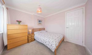 This charming room features light pink painted walls and cosy carpeted flooring. A built in wardrobe provides hanging and shelving space, with a further cupboard providing additional storage space, enhancing the room's practicality. A front facing window fills the space with natural light, complemented by a ceiling light for additional illumination. The room is equipped with a radiator and power points for comfort and convenience.