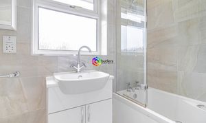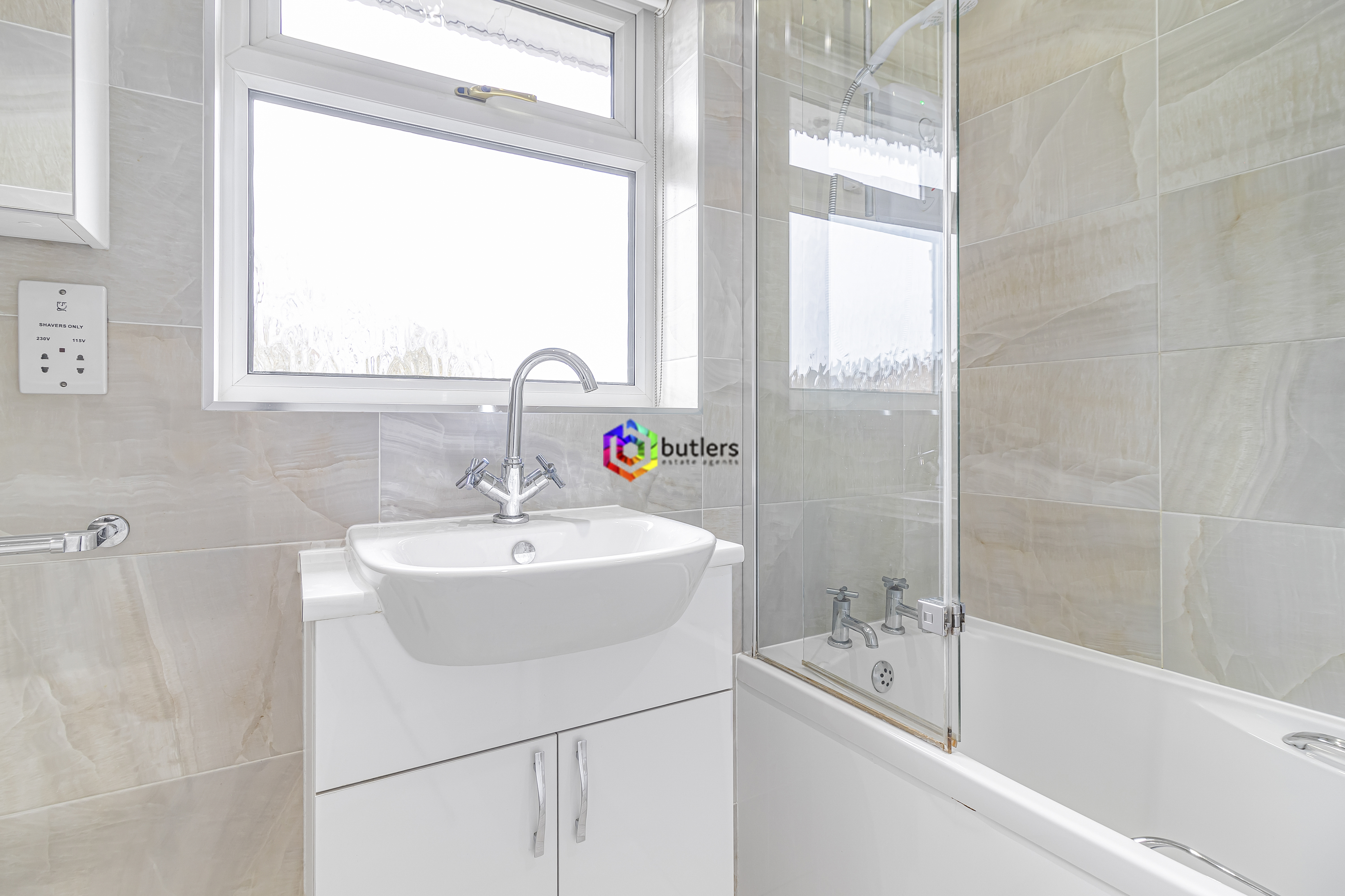 The bathroom has a white bath with shower over and glass screen. A white wash hand basin sits on top of a two door vanity unit beneath the side facing window. There is a white WC and the room is fully tiled.