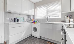 A modern white gloss kitchen with complementary work surfaces. There is space to accommodate a freestanding gas or electric oven and space for a washing machine and further under counter appliances. A cupboard houses the warm air boiler then doors lead to the hall and externally to the side garden.