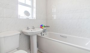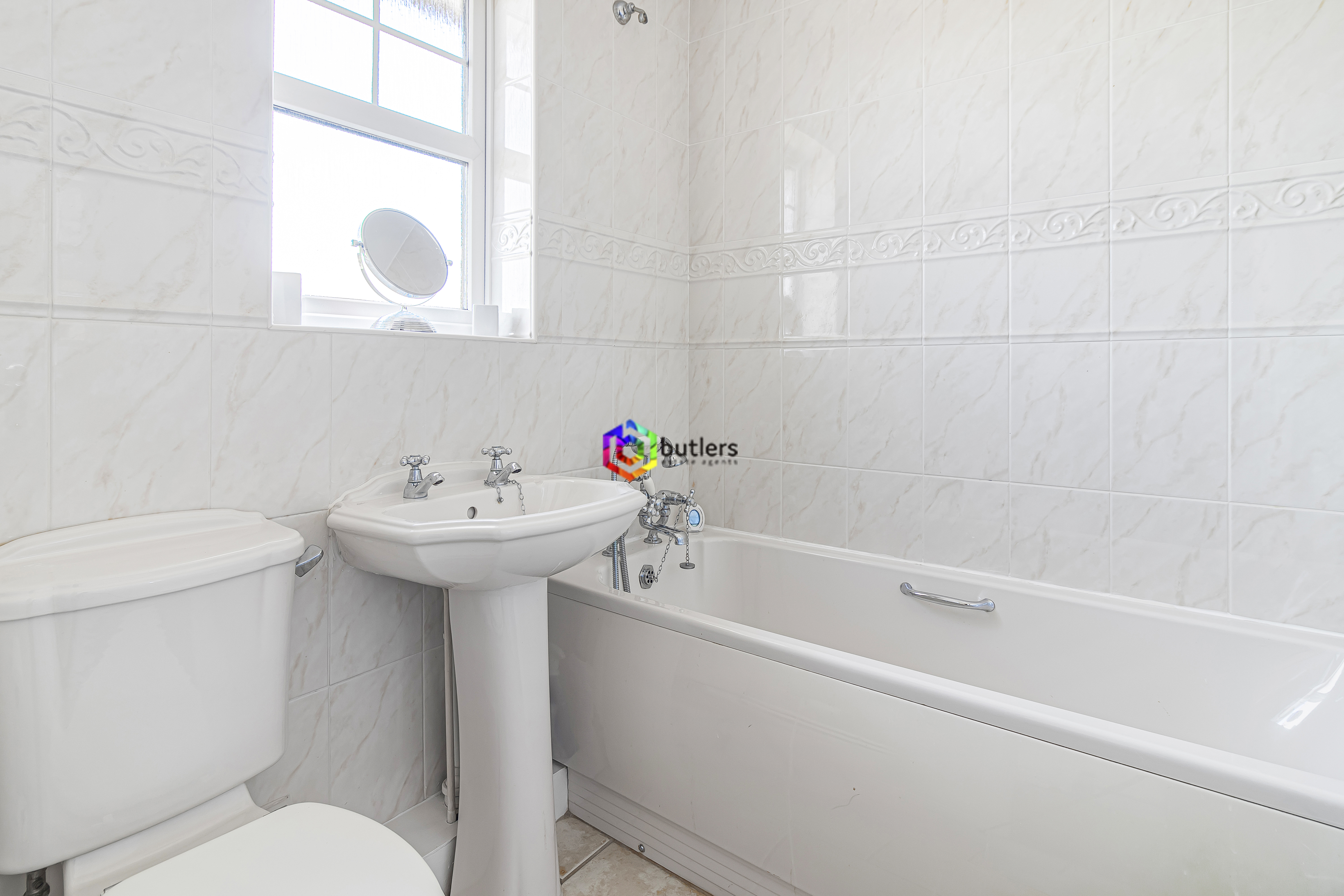 This En-Suite has a white bath, white wash hand basin on a pedestal and and a White WC. There is a window to the front.