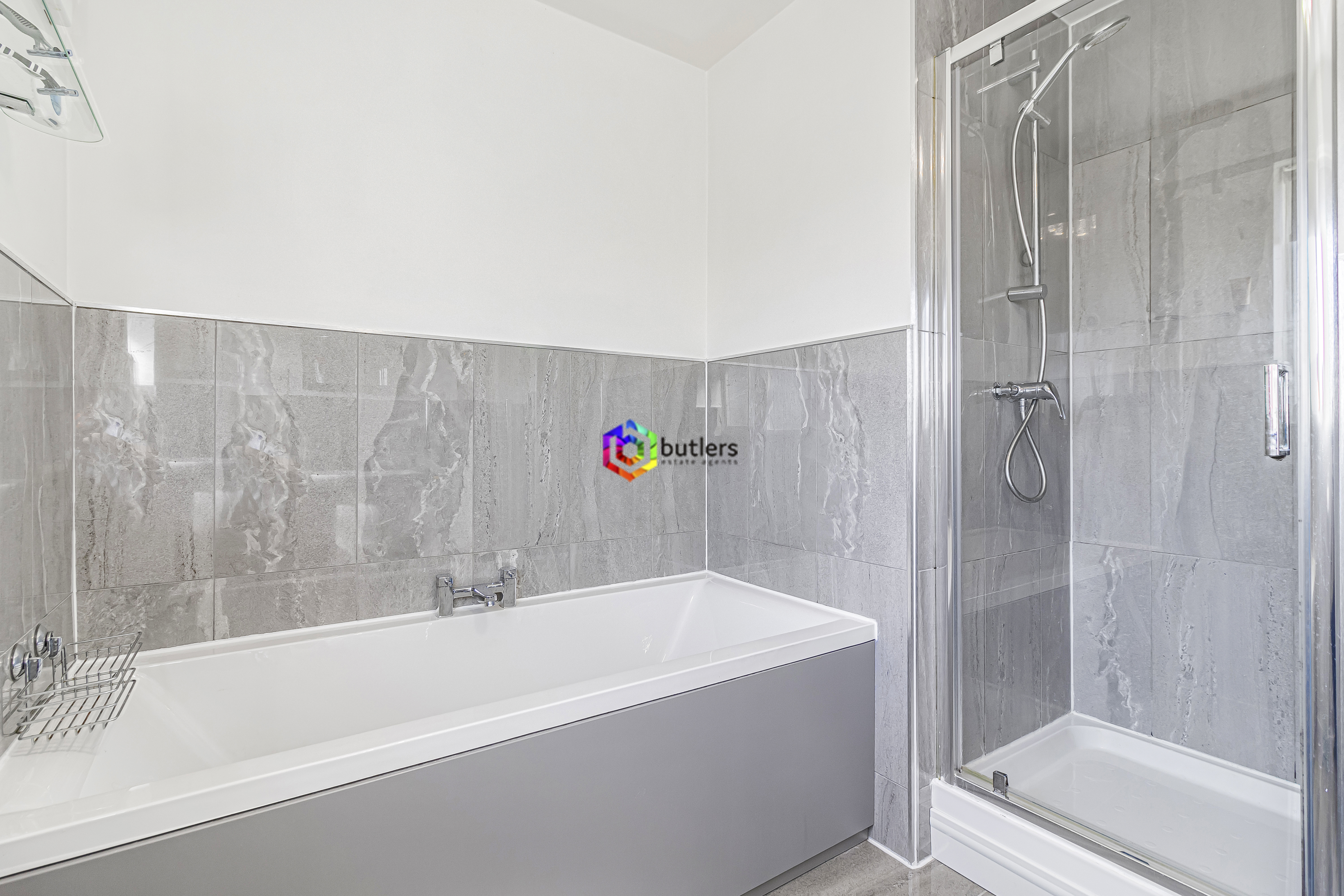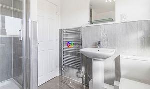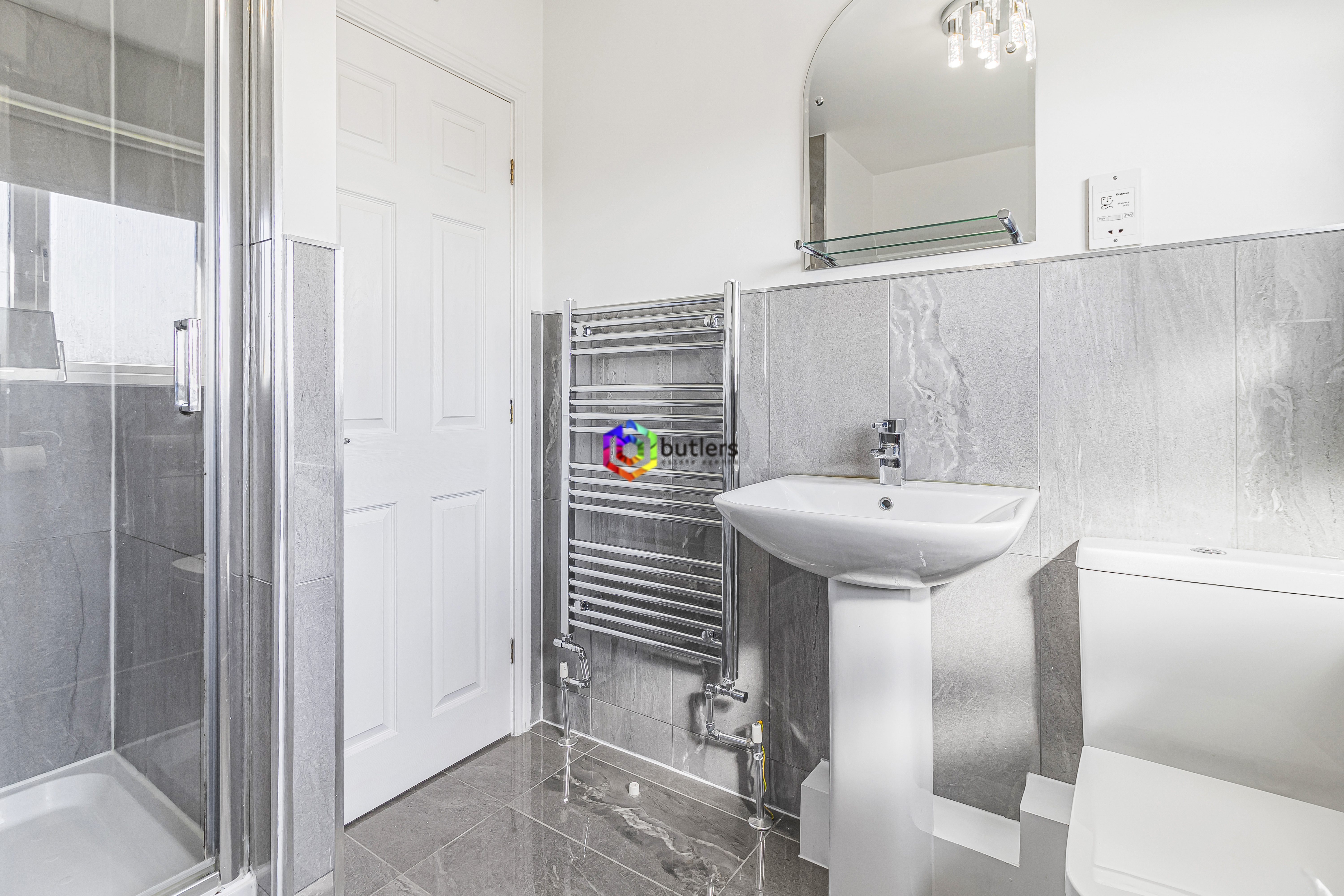 Recently upgraded into modern greys and whites the room has a shower cubicle with a glass door and a thermostatic shower control, a white bath, white wash hand basin on a pedestal and a white WC. Everything required for family living.