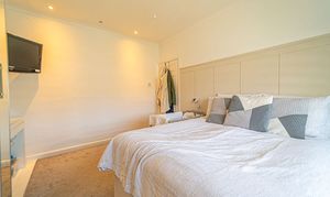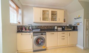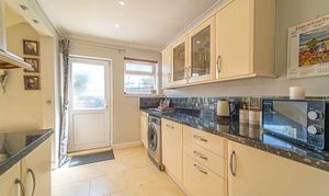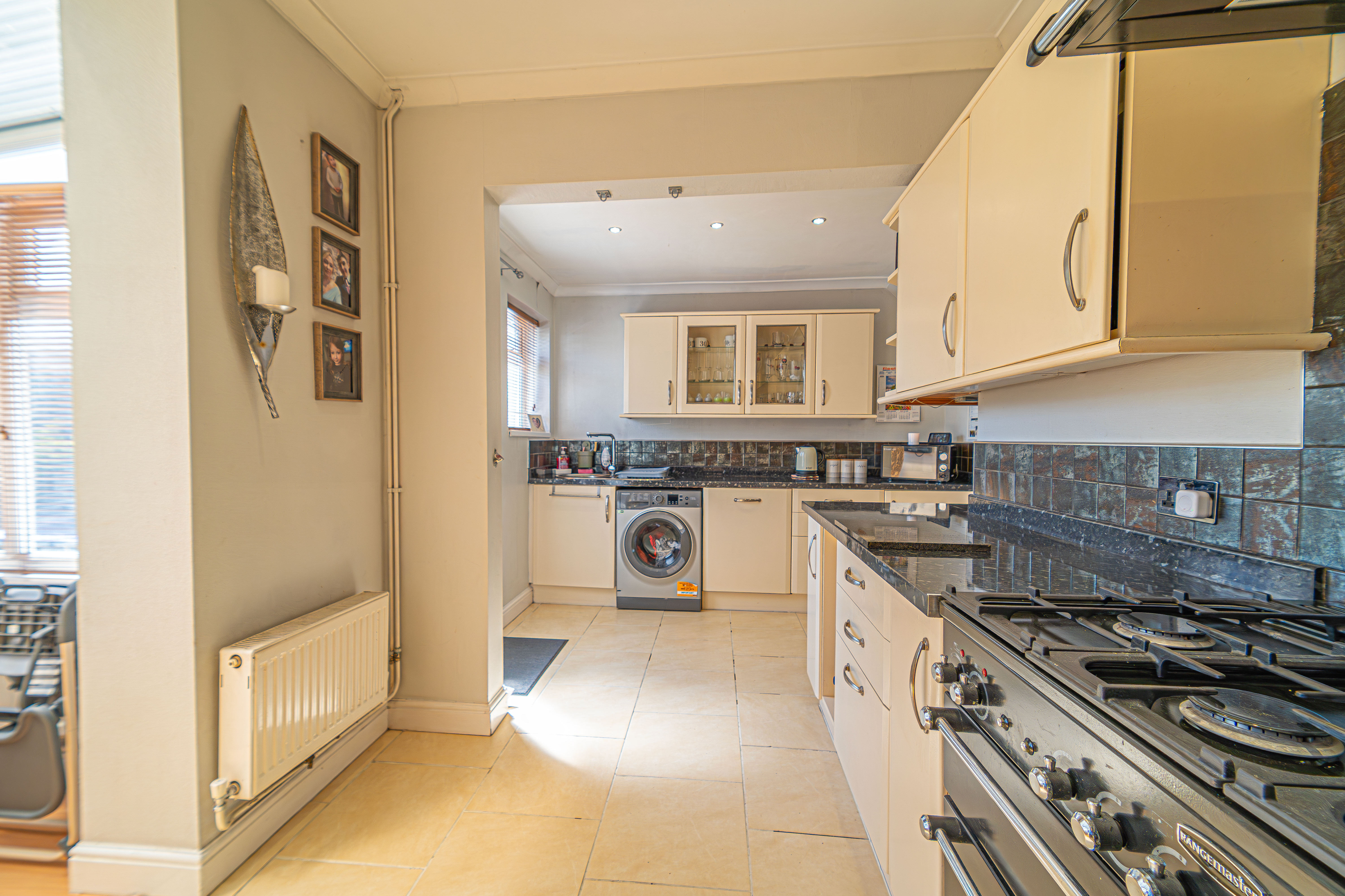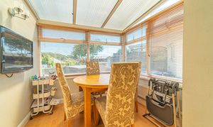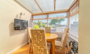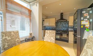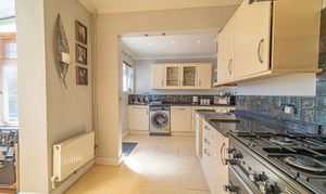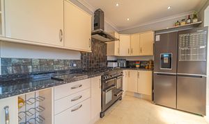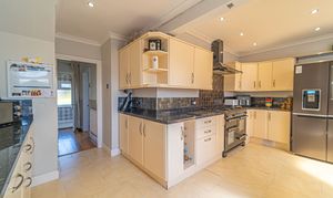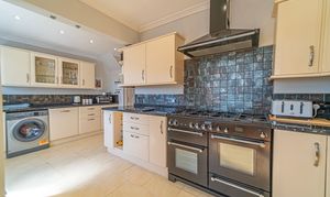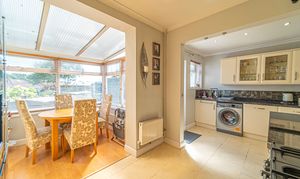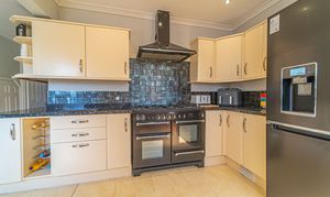 Beautifully presented throughout, we are welcomed into this marvellous property through the spacious living room at the front of the house, lit up from a large front window and featuring a charming wood burner fireplace. At the rear of the house sits the incredible kitchen, with a large size and benefitting from a large range of storage fittings, including a cupboard under the stairs, as well as space for additional appliances to join the integrated dishwasher and impressive range cooker with a 6-ring gas hob, double oven, grill and plate warmer. From the kitchen we can find a door to the garden, and an open plan access to the grand conservatory that is currently being used as a bright and tranquil dining area.