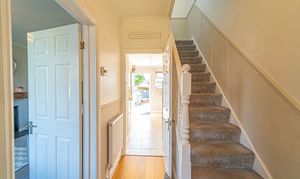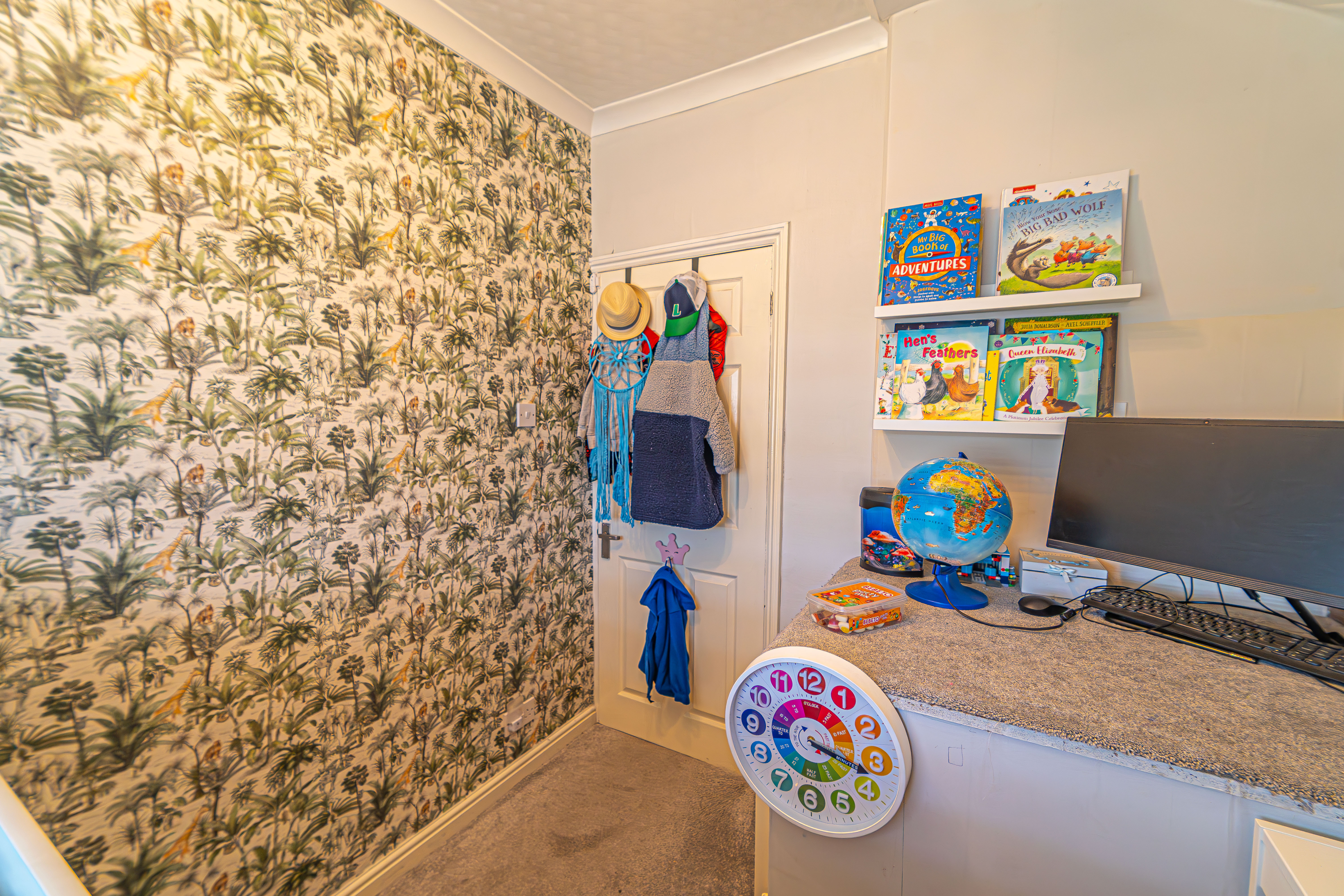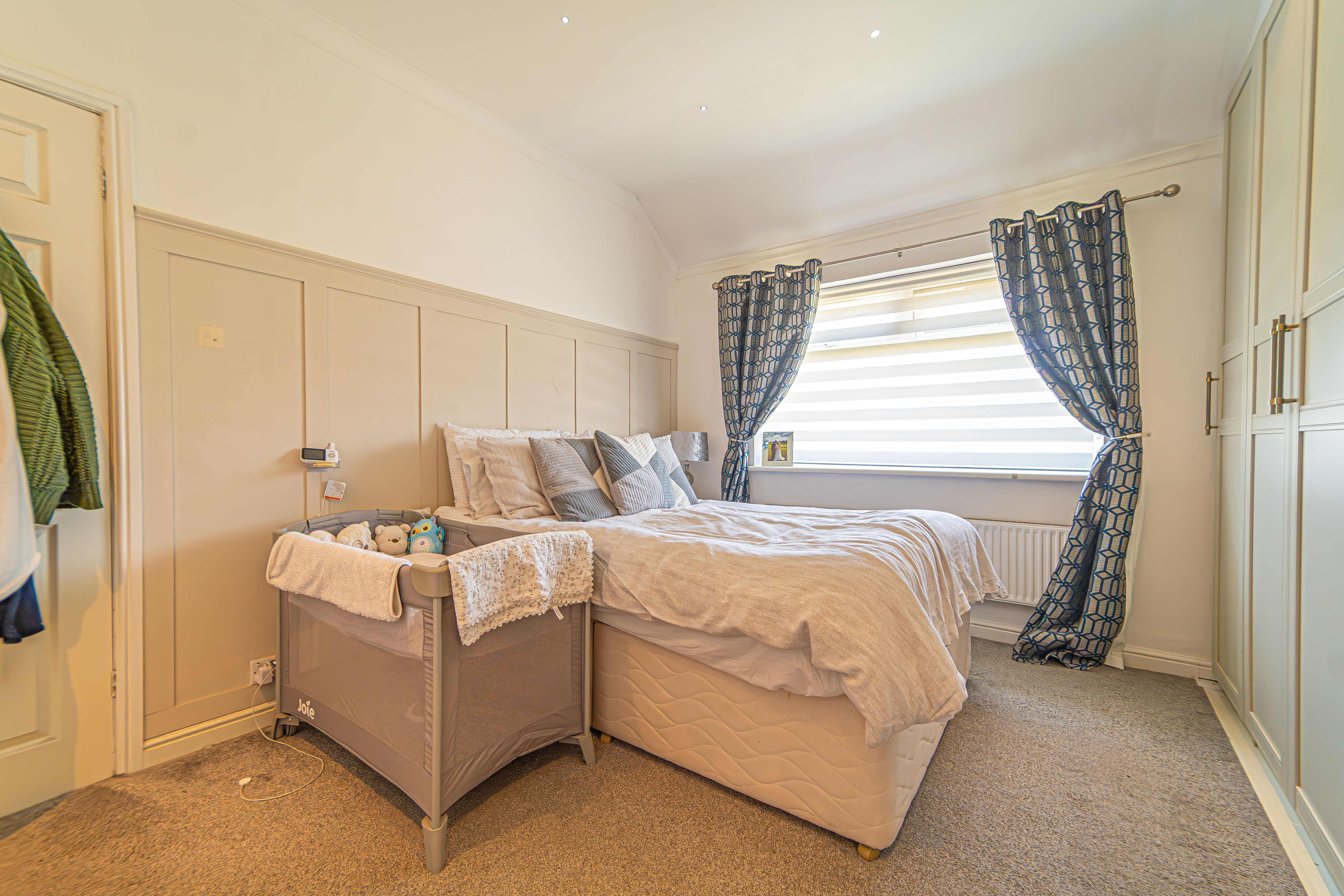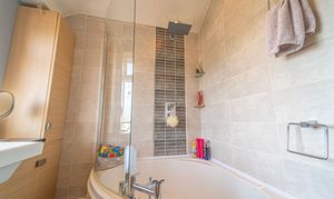 To the first floor there are three bedrooms, two of which are spacious double rooms that both enjoy fitted storage wardrobes, great for maximising space. The third bedroom is a comfortable single, that would also suit very well as a home office, giving flexibility to those who work from home. The family bathroom can be found from the landing, featuring a large bath suite with both a handheld shower and a mixer rainfall shower overhead.
