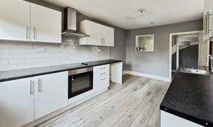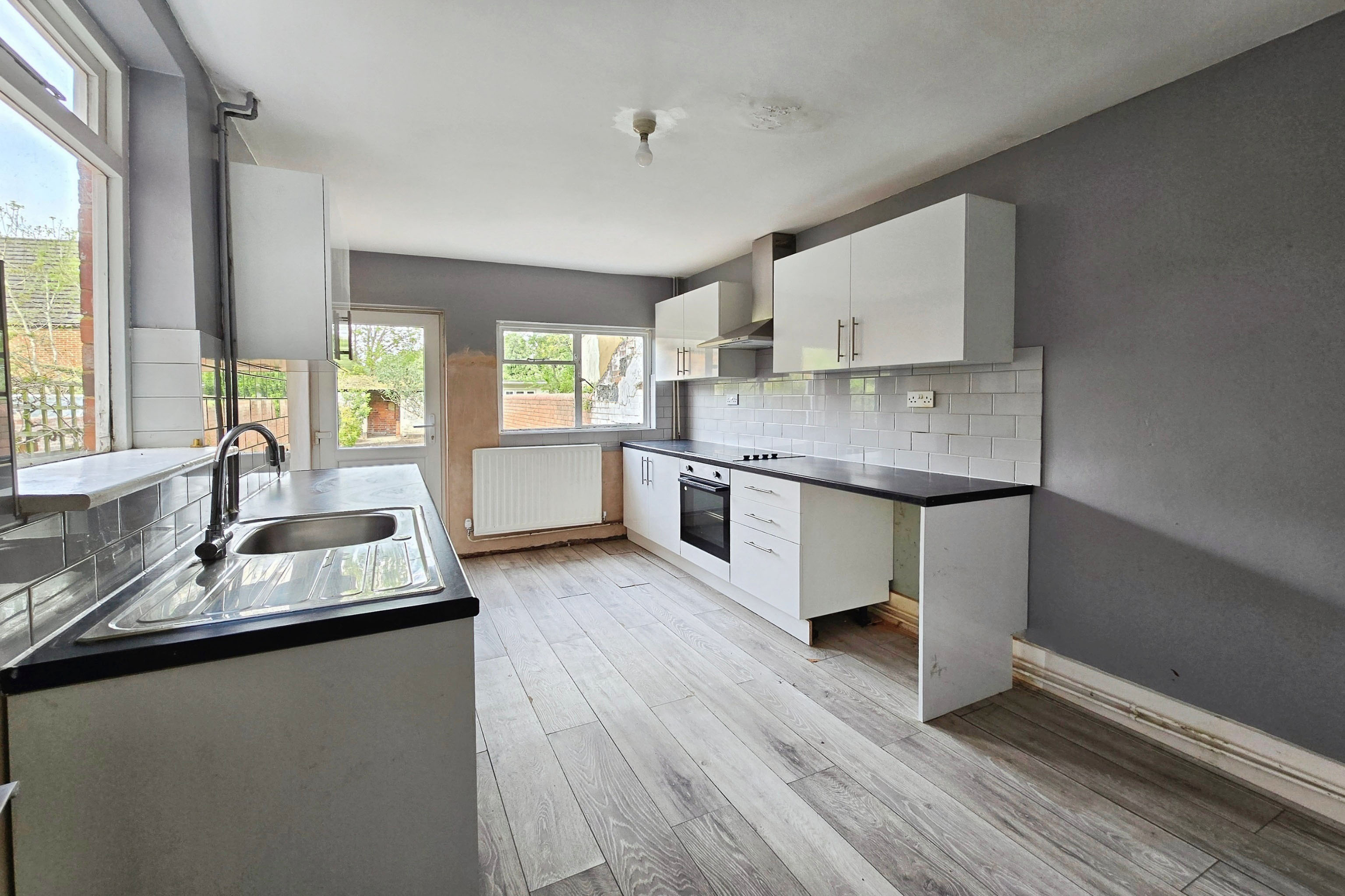 The kitchen offers a bright, practical space with a contemporary feel, featuring sleek white units, contrasting worktops, and classic metro-tile splashbacks. Large windows to the side and rear fill the room with natural light, while a door provides easy access to the garden — perfect for indoor-outdoor living. The layout is designed for functionality, with an integrated oven and hob, plenty of storage, and space for further appliances. With its neutral tones and modern touches, the kitchen is ready to enjoy while offering scope for personalisation.