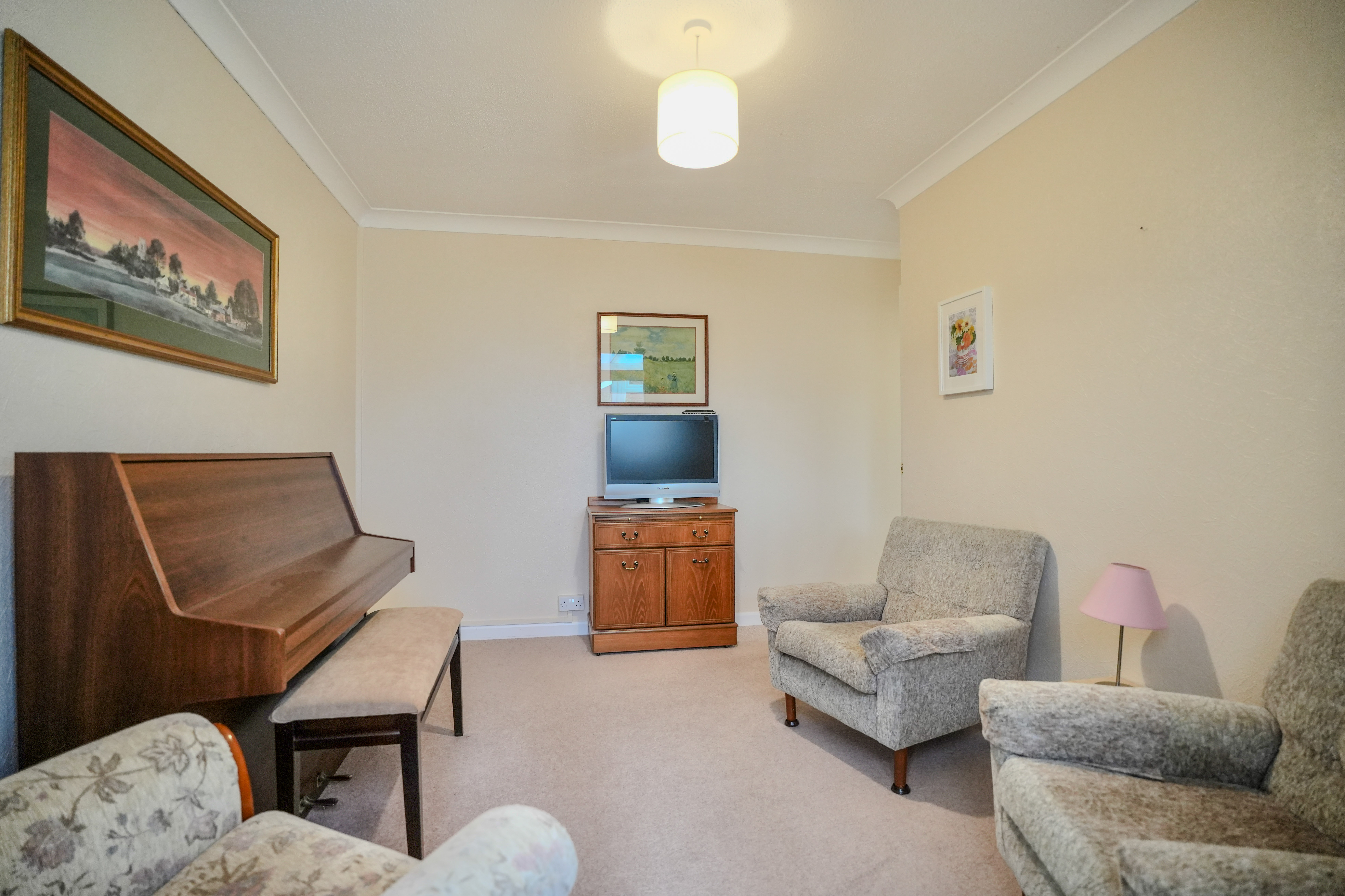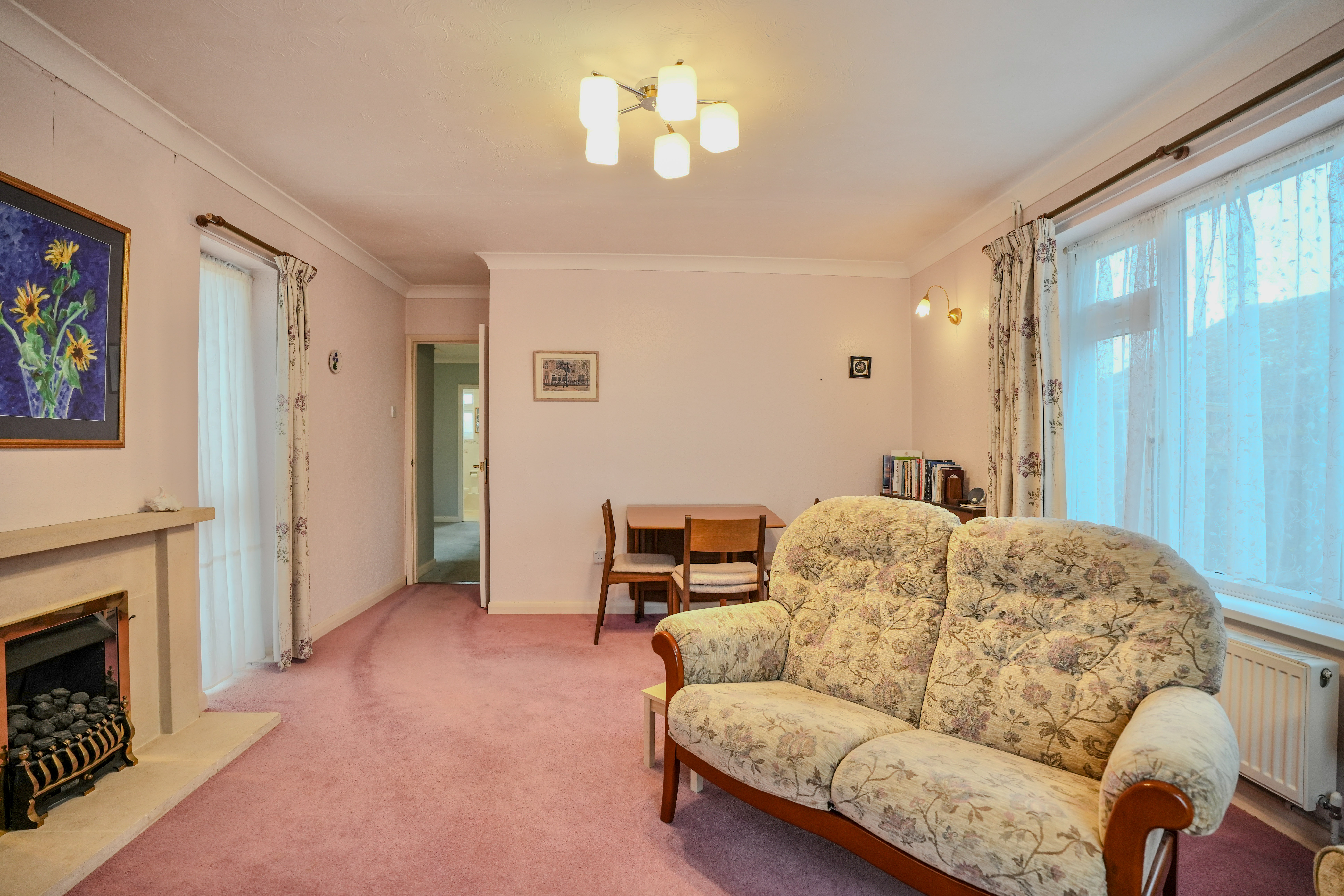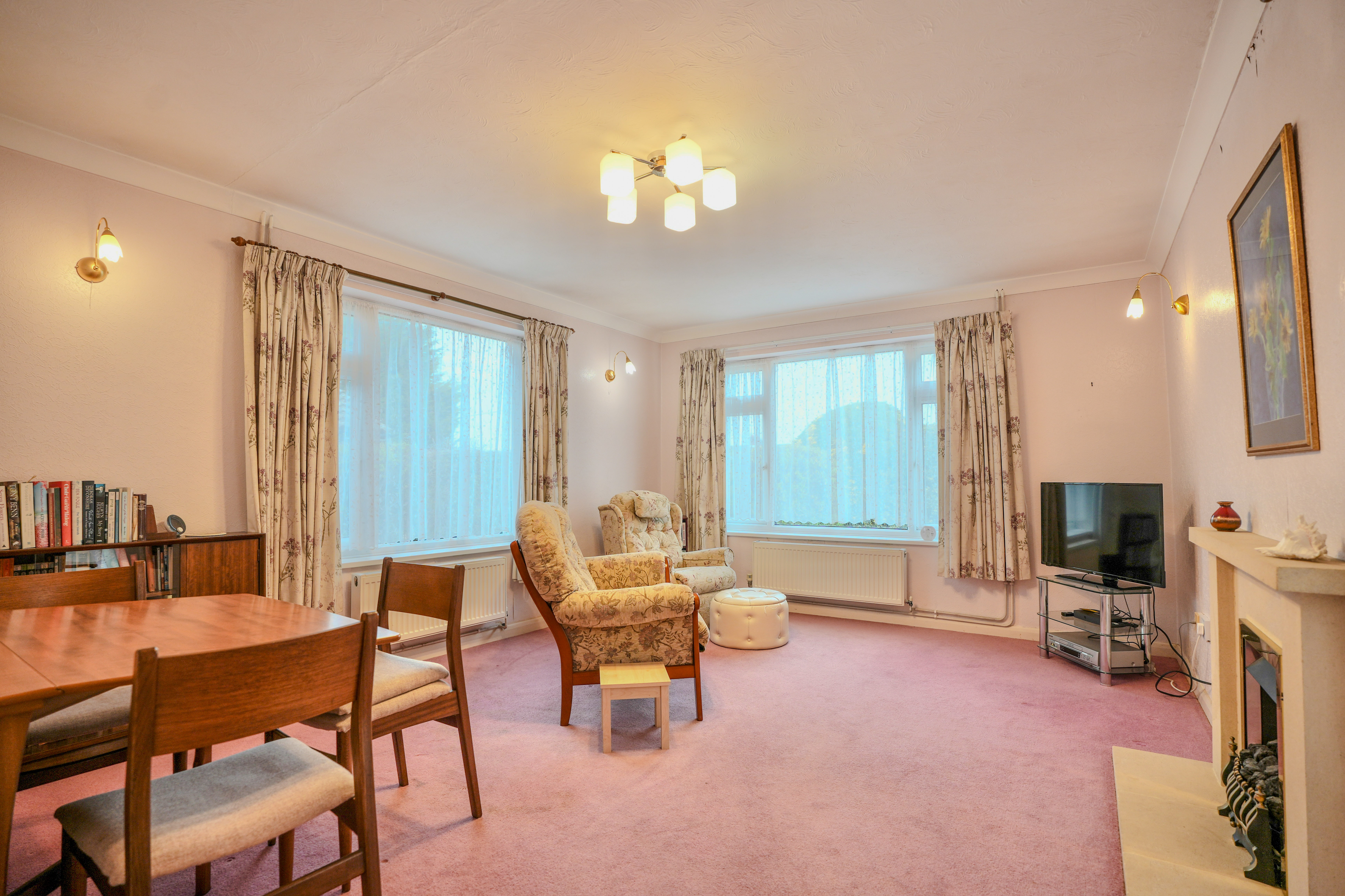 A wonderful light and airy triple aspect room with uPVC double glazed windows to the front and both side aspects, carpeted flooring, two wall mounted radiators, wall lights, gas fire with a marble surround, and space for a dining table and chairs.