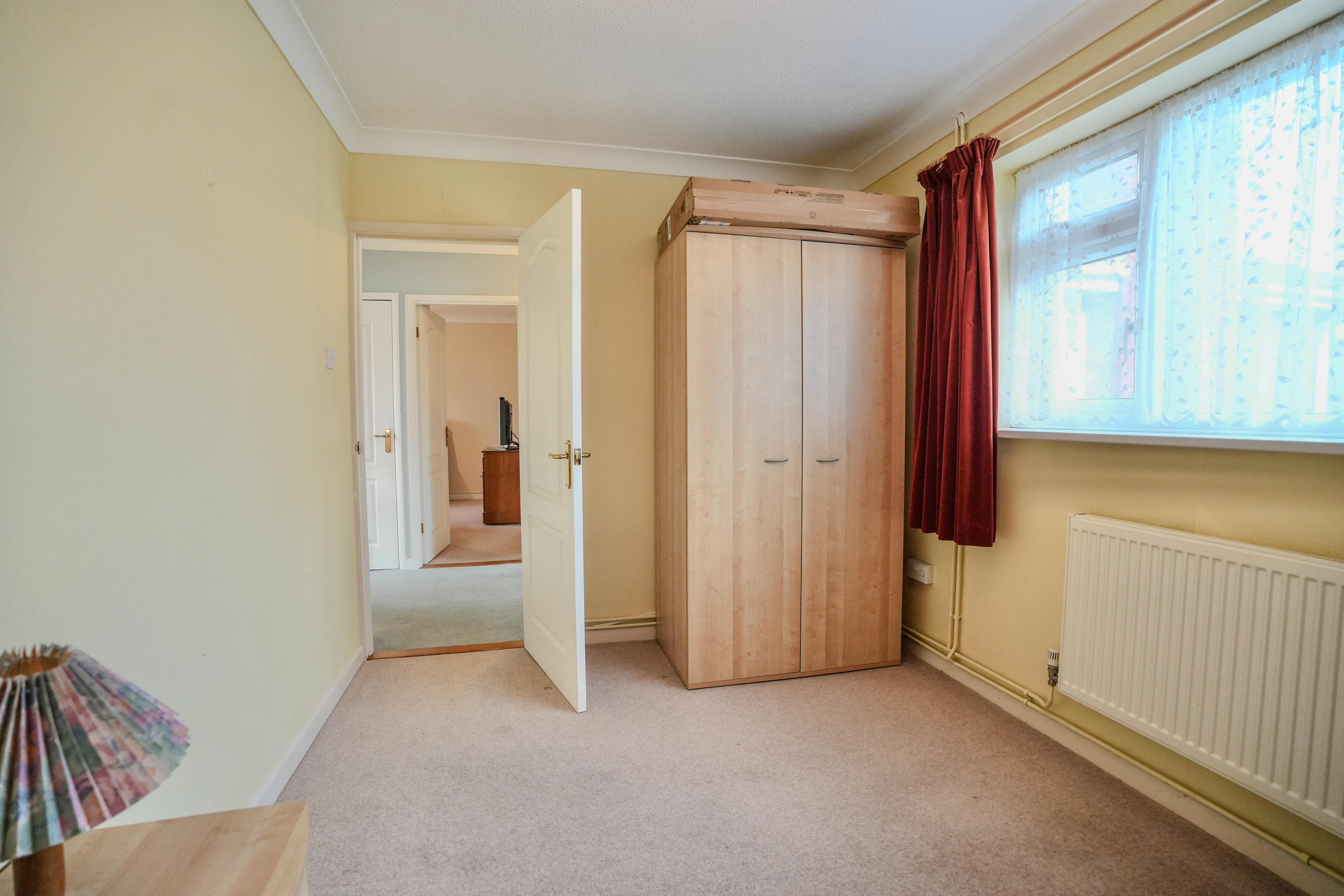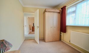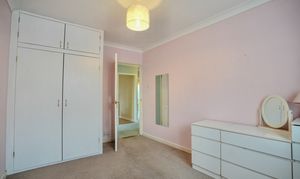 uPVC double glazed window to the side aspect, carpeted flooring, wall mounted radiator and built-in wardrobe with double-opening doors and cupboards above.