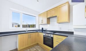 The modern kitchen is thoughtfully designed with a range of wall and base units, complemented by stylish work surfaces. It features an integrated oven and space for additional appliances, catering to all your culinary needs. The kitchen’s layout ensures efficient use of space while maintaining a contemporary aesthetic.