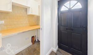 Once inside, tiled flooring can be found underfoot for ease of maintenance. A door takes you to a useful utility cupboard with space for appliances, wood effect work surface, built-in storage cupboards and tiled splash-backs. The adjacent dining room enjoys garden views with French doors leading out and continued tiled flooring underfoot - with an opening taking you to the main sitting room complete with fitted carpet and a range of built-in storage under the stairs. A further opening takes you to the kitchen, complete with an L-shaped arrangement of modern wall and base level units. The kitchen enjoys an inset electric hob and built-in electric oven with an extractor fan and tiled splash-backs, wood effect flooring underfoot, space for fridge freezer, and further built-in storage cupboard to one side.