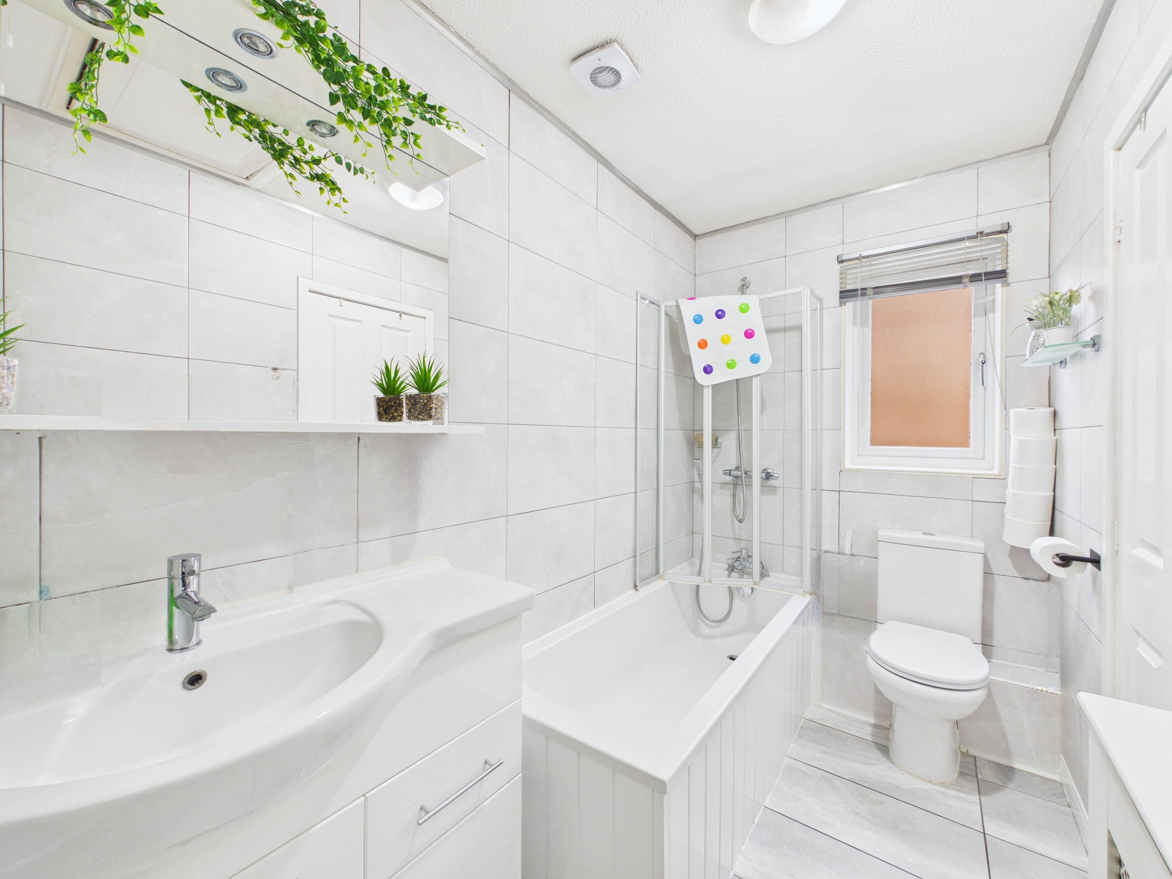 The large, fully enclosed rear garden is a true sanctuary, with mature palm trees and lush greenery creating a private oasis for summer BBQs, family fun, or quiet reflection. Parking is a breeze thanks to the generous driveway at the side, accommodating up to three cars — a rare and practical feature.