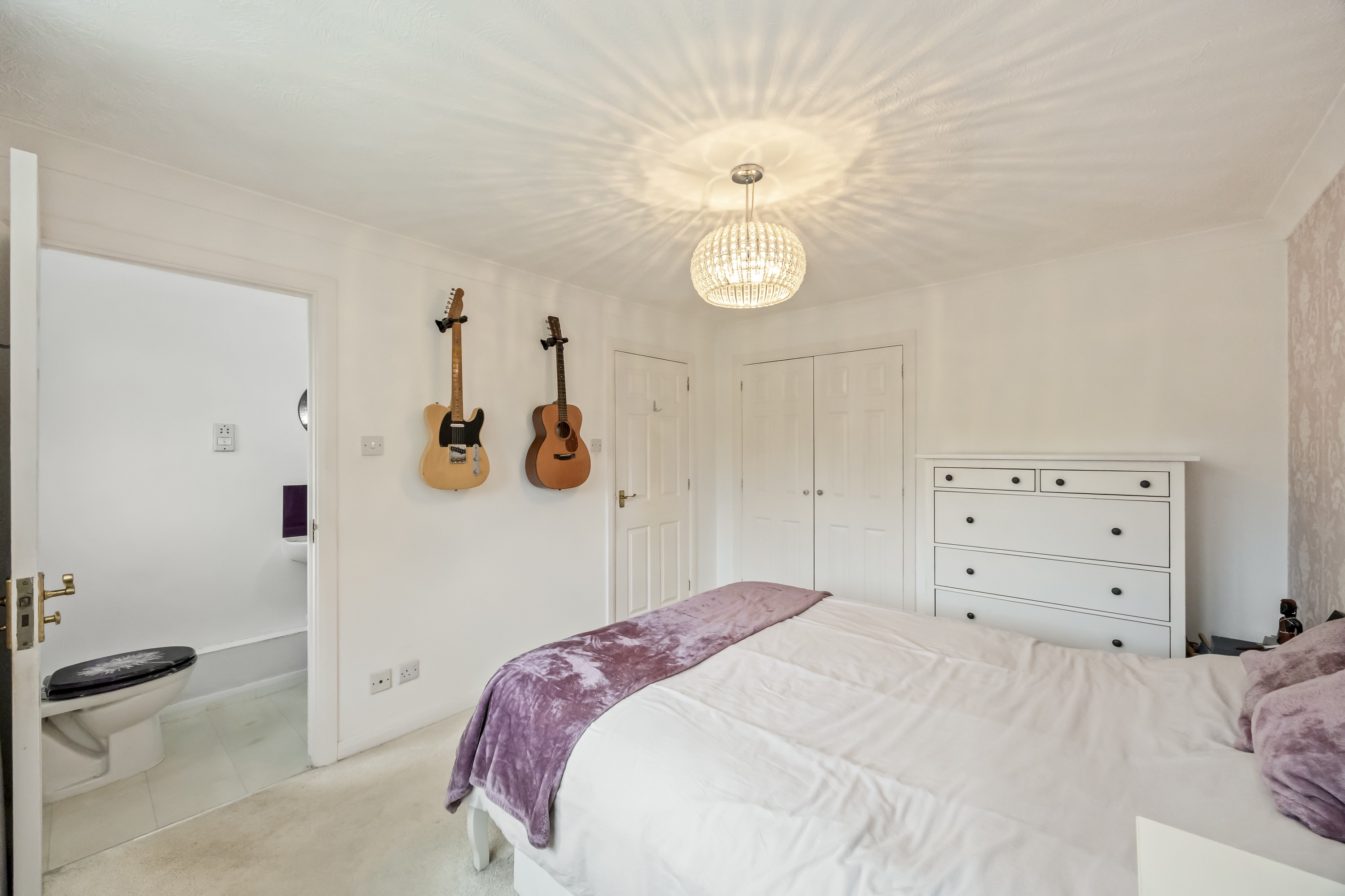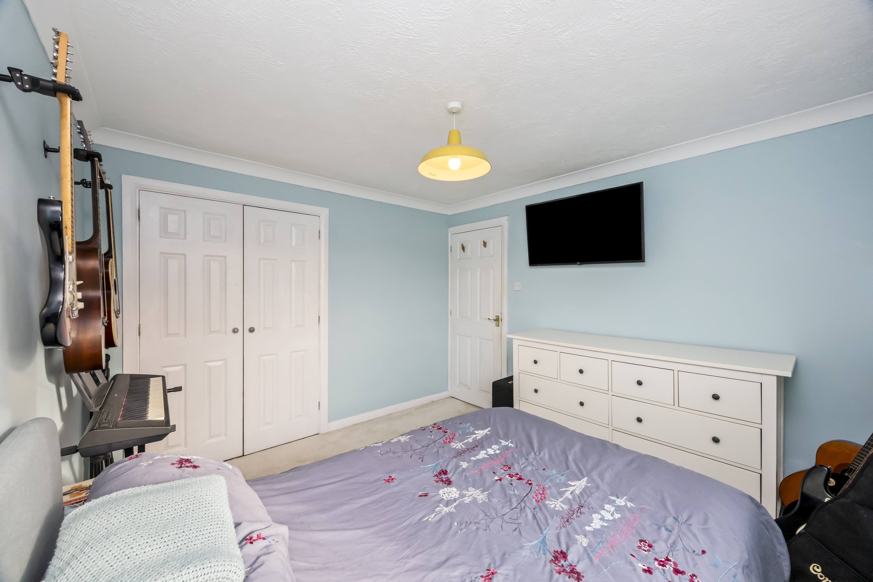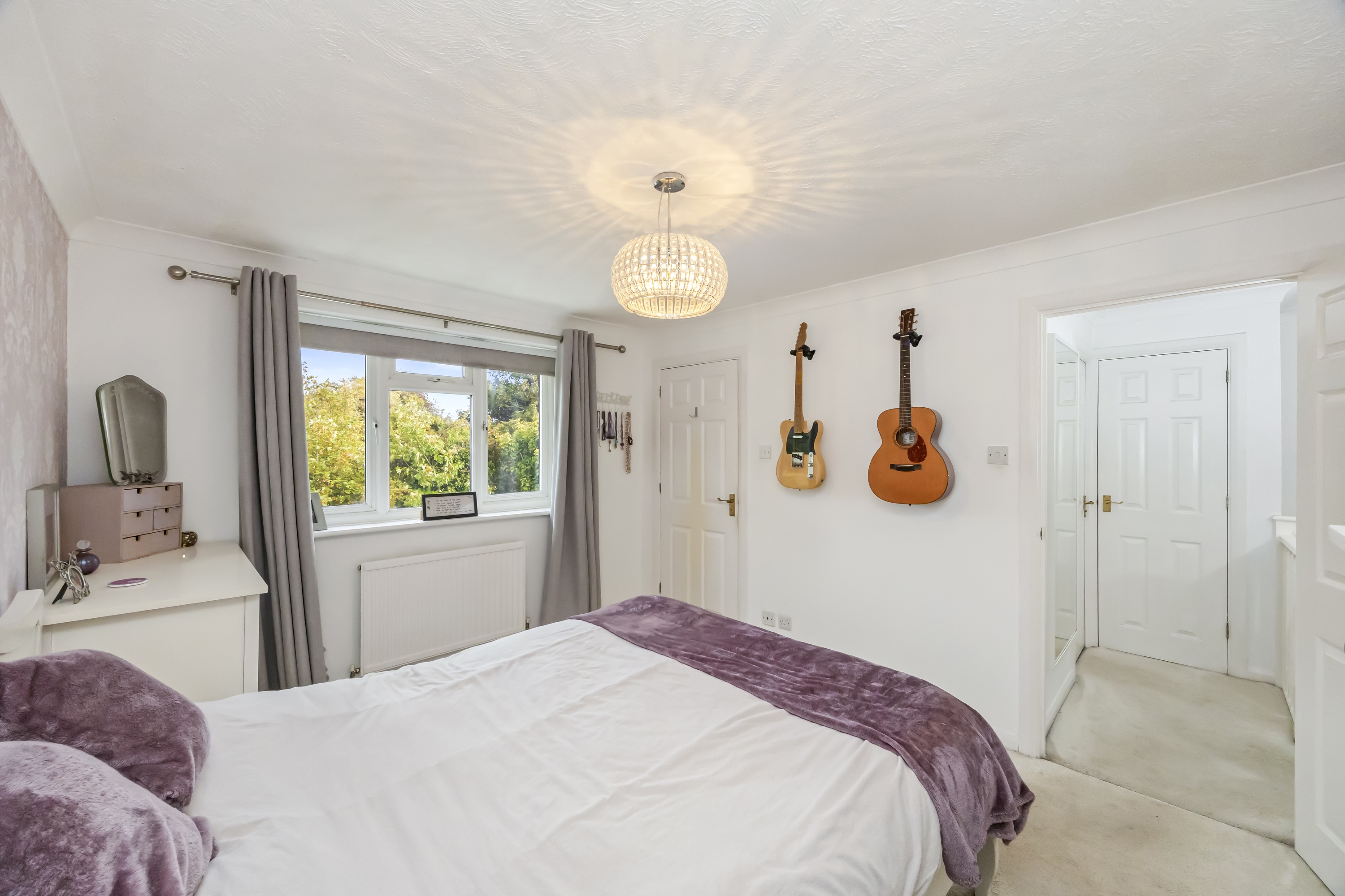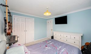 Upstairs, the accommodation boasts three further inviting bedrooms, each thoughtfully designed with built-in storage and contemporary decor. The principal bedrooms benefit from private en-suite bathroom, offering convenience and privacy, while the main modern bathroom is finished with elegant tiling and high-quality fixtures. Additional features include modern lighting throughout, a wall-mounted TV in one bedroom, and unique decorative touches such as chic wallpaper accents and wall-mounted guitar holders. The beautifully landscaped rear garden features a lush lawn, mature trees, a decked patio area, and a practical garden shed, providing abundant space for relaxation and outdoor activities. This detached home combines style, functionality, and generous outdoor living, making it a truly outstanding opportunity.