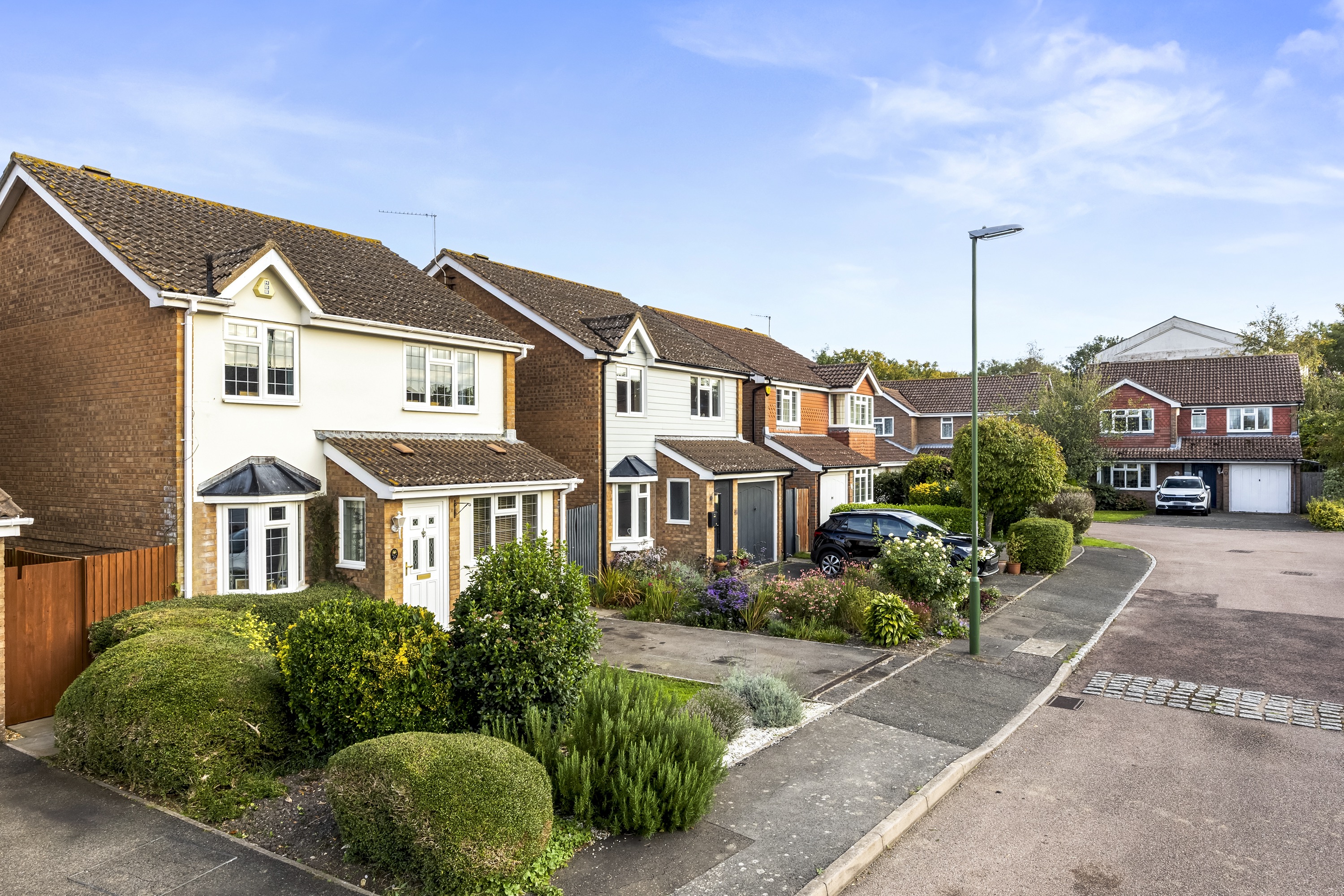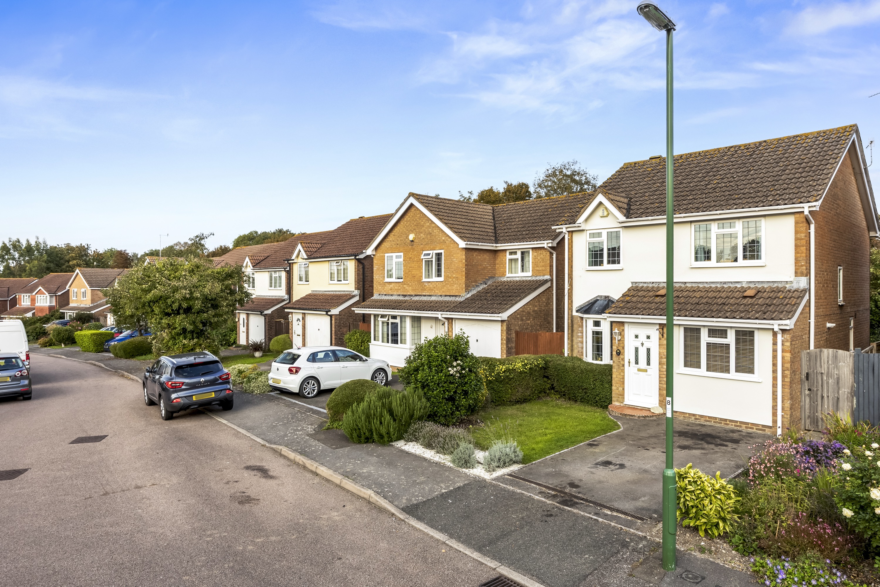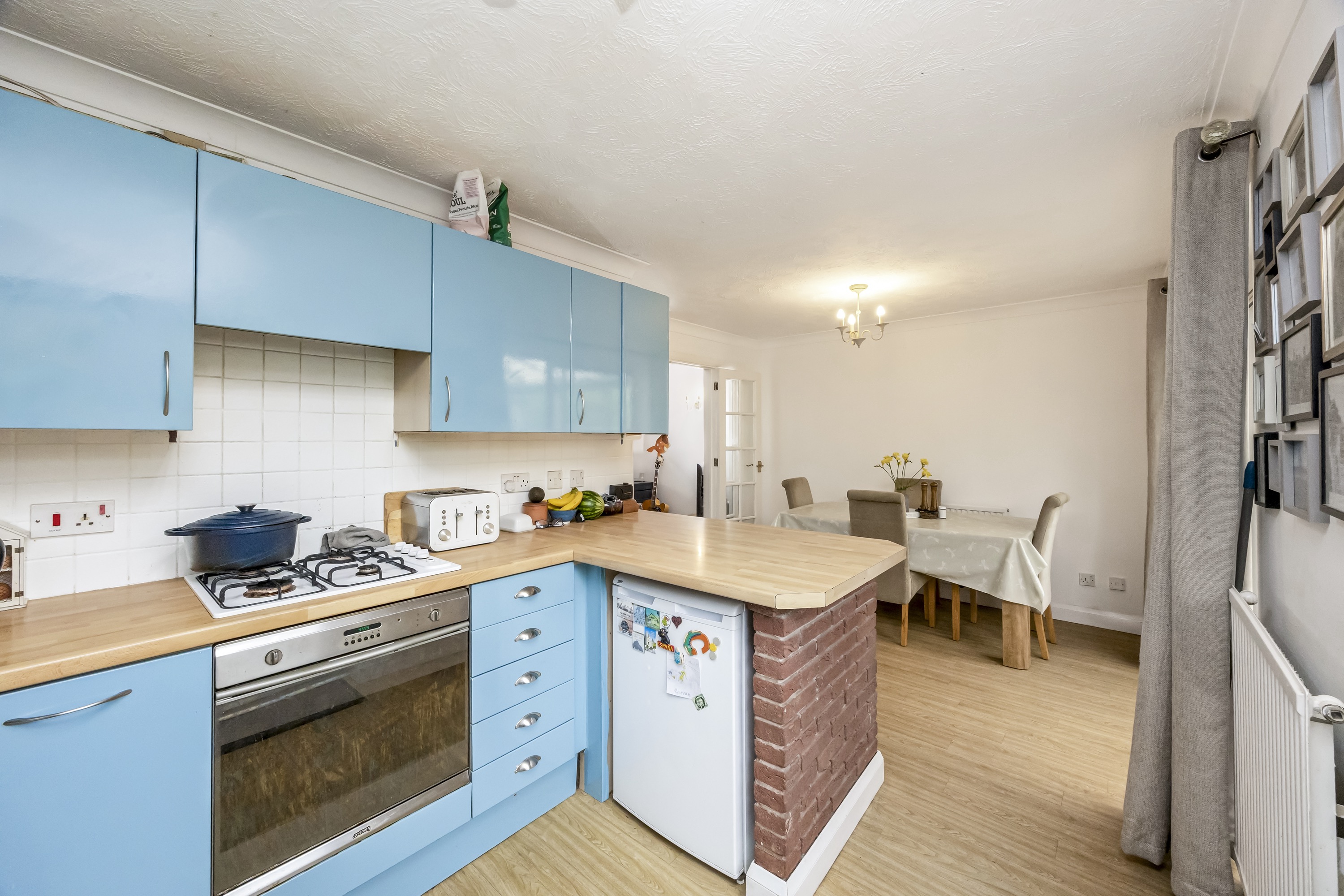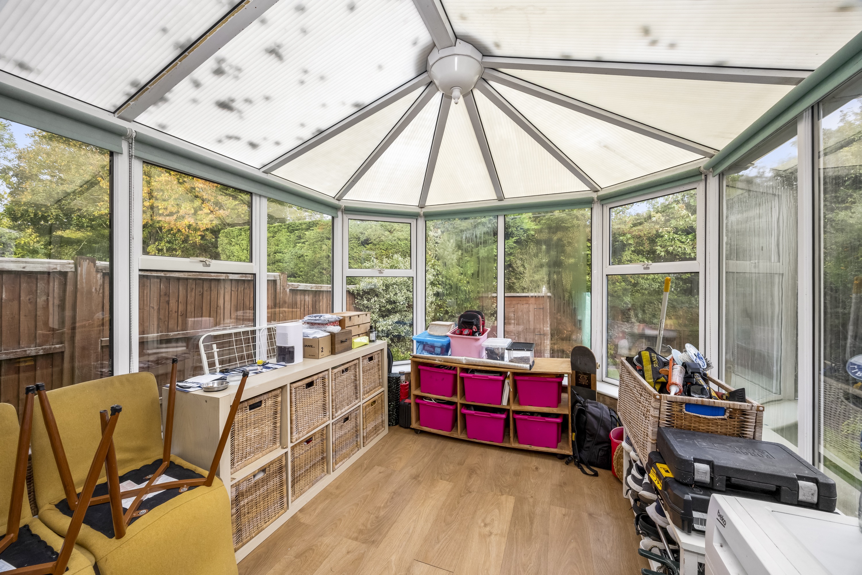 This impressive four-bedroom, three-bathroom detached house offers an exceptional blend of modern comfort and elegant design, ideal for families and discerning buyers alike. The property welcomes you with a well-maintained front garden and off-road parking, enhancing kerb appeal and every-day convenience. Step inside to discover two spacious reception rooms, including a bright living area with a bay window, modern wood-effect LTV flooring and a calming neutral palette. The open plan kitchen and dining area is a true highlight, featuring sleek blue cabinetry, integrated appliances, and a stylish breakfast bar - perfect for entertaining or family gatherings. French doors connect the living space seamlessly to the garden, while a charming conservatory provides a sunlit retreat to enjoy tranquil garden views year-round. The ground floor is completed by a double bedroom with en-suite shower room, perfect for when guests come to stay or for someone who may struggle with stairs!