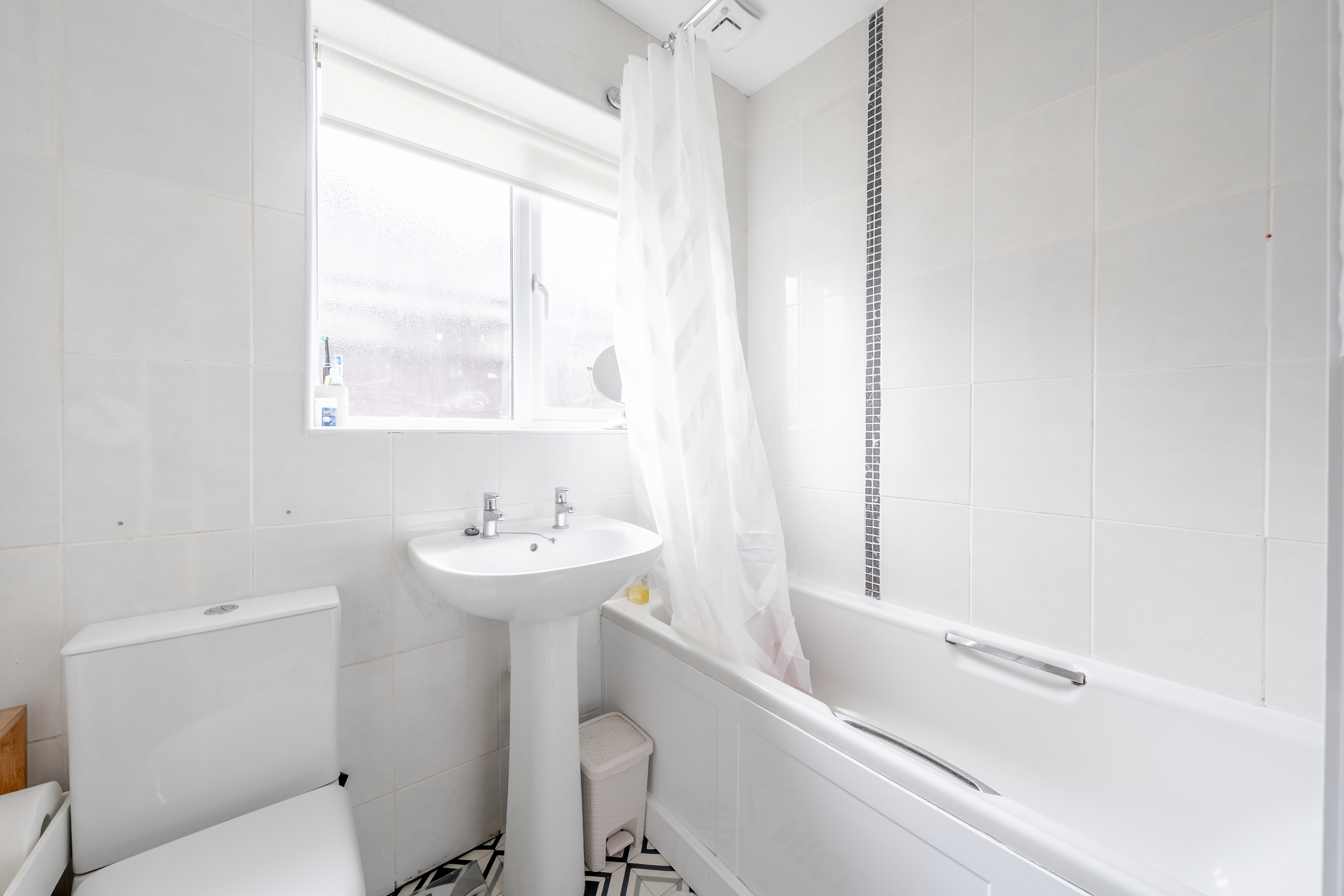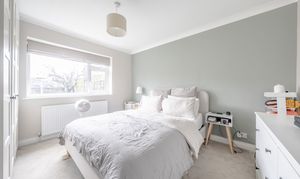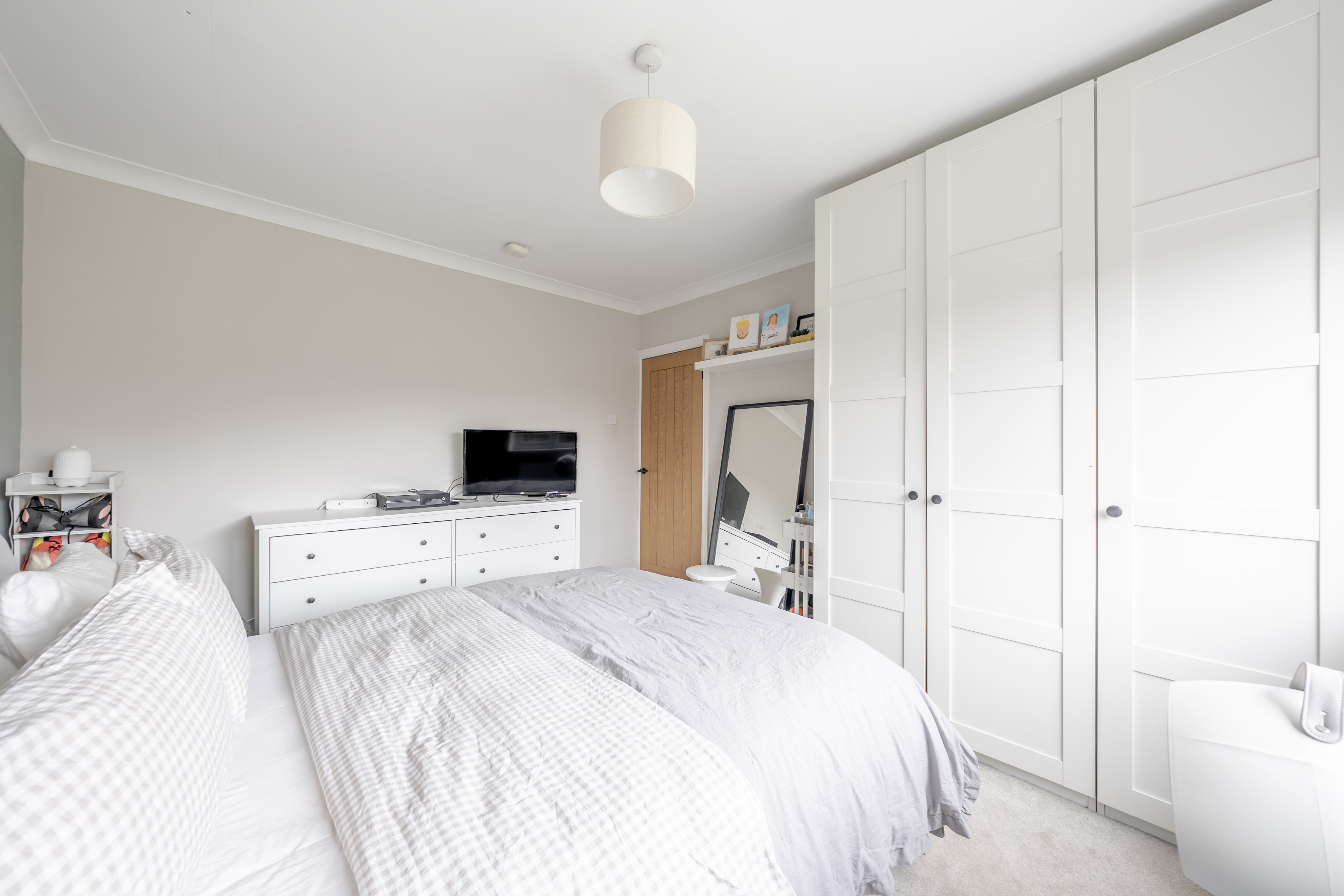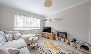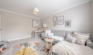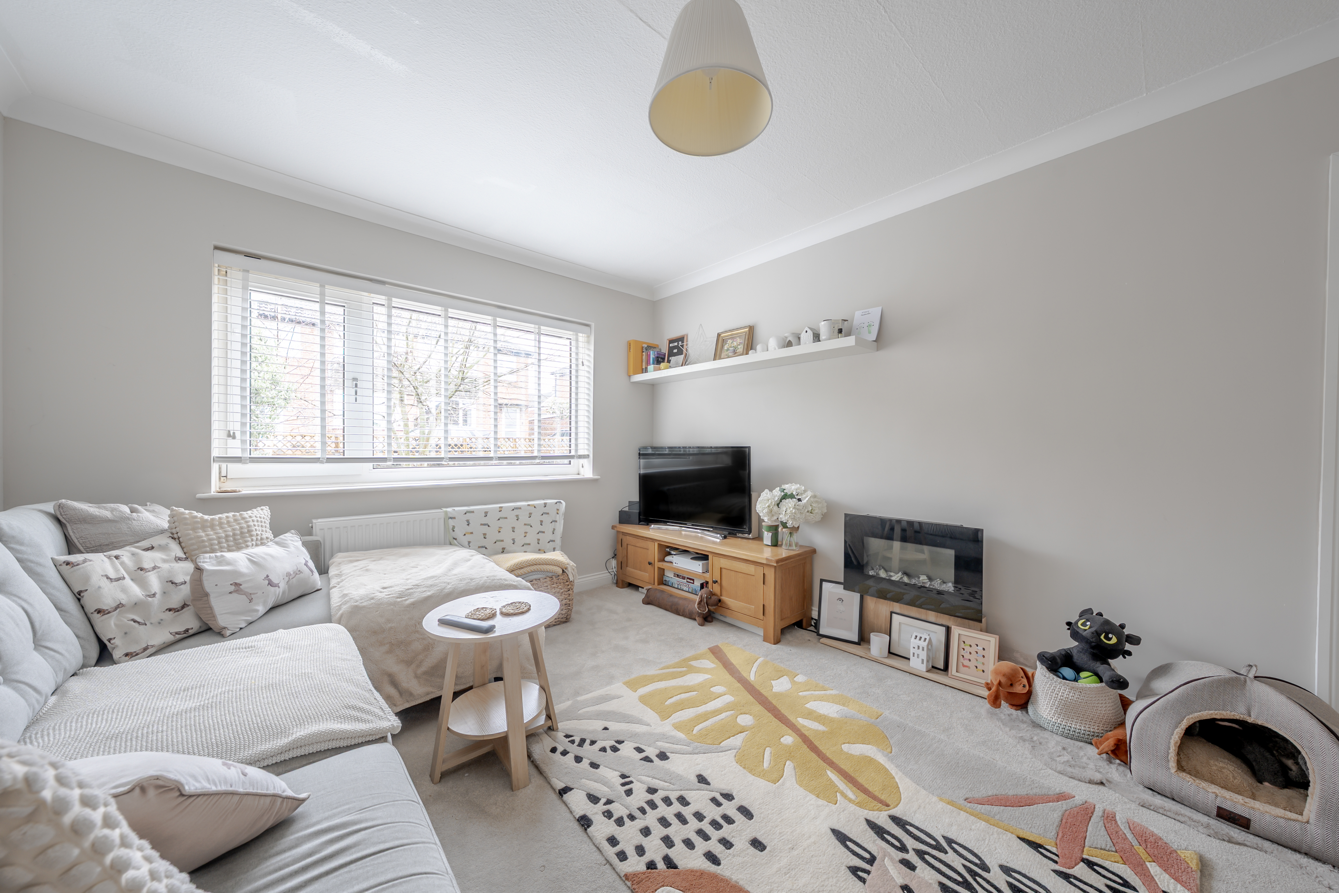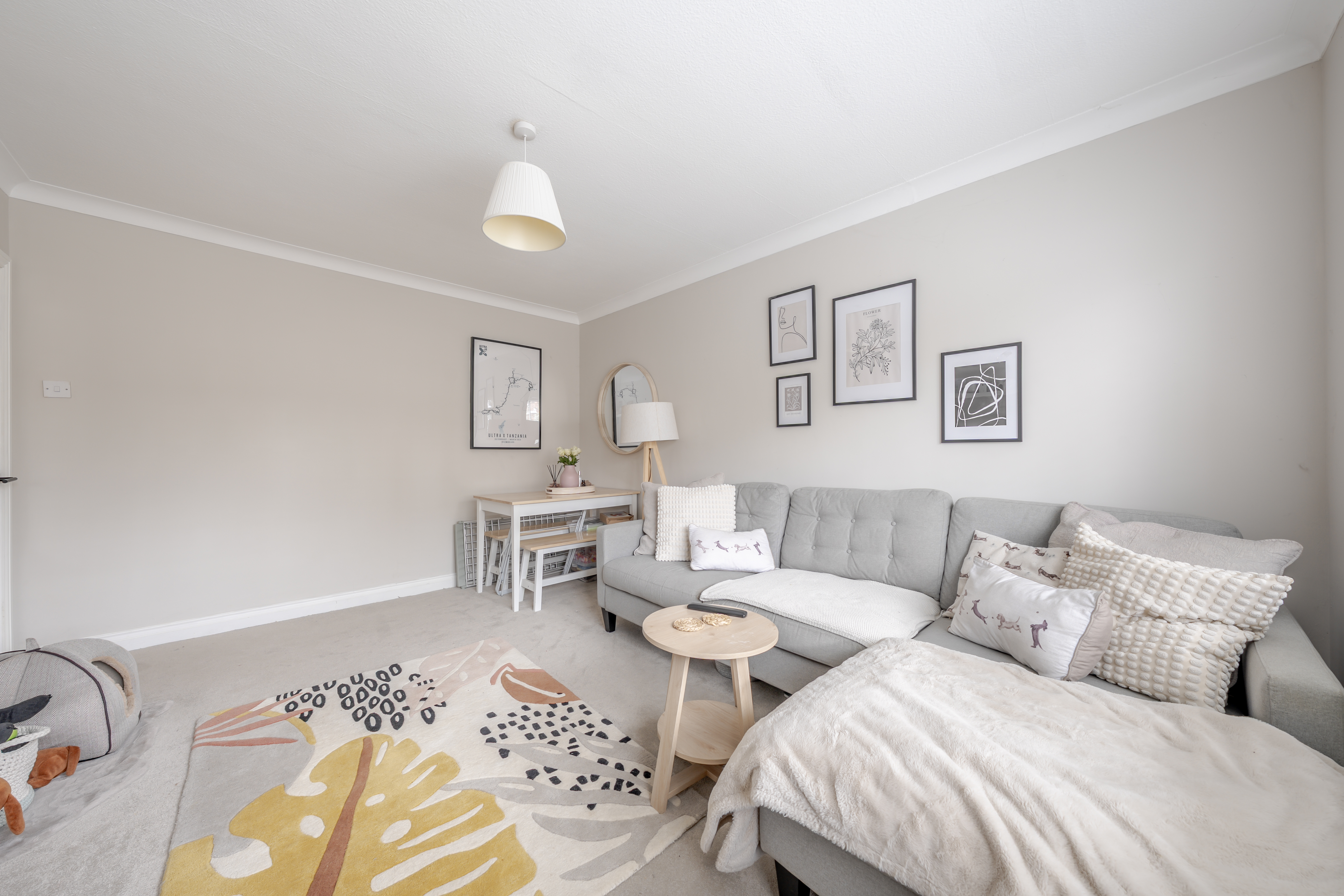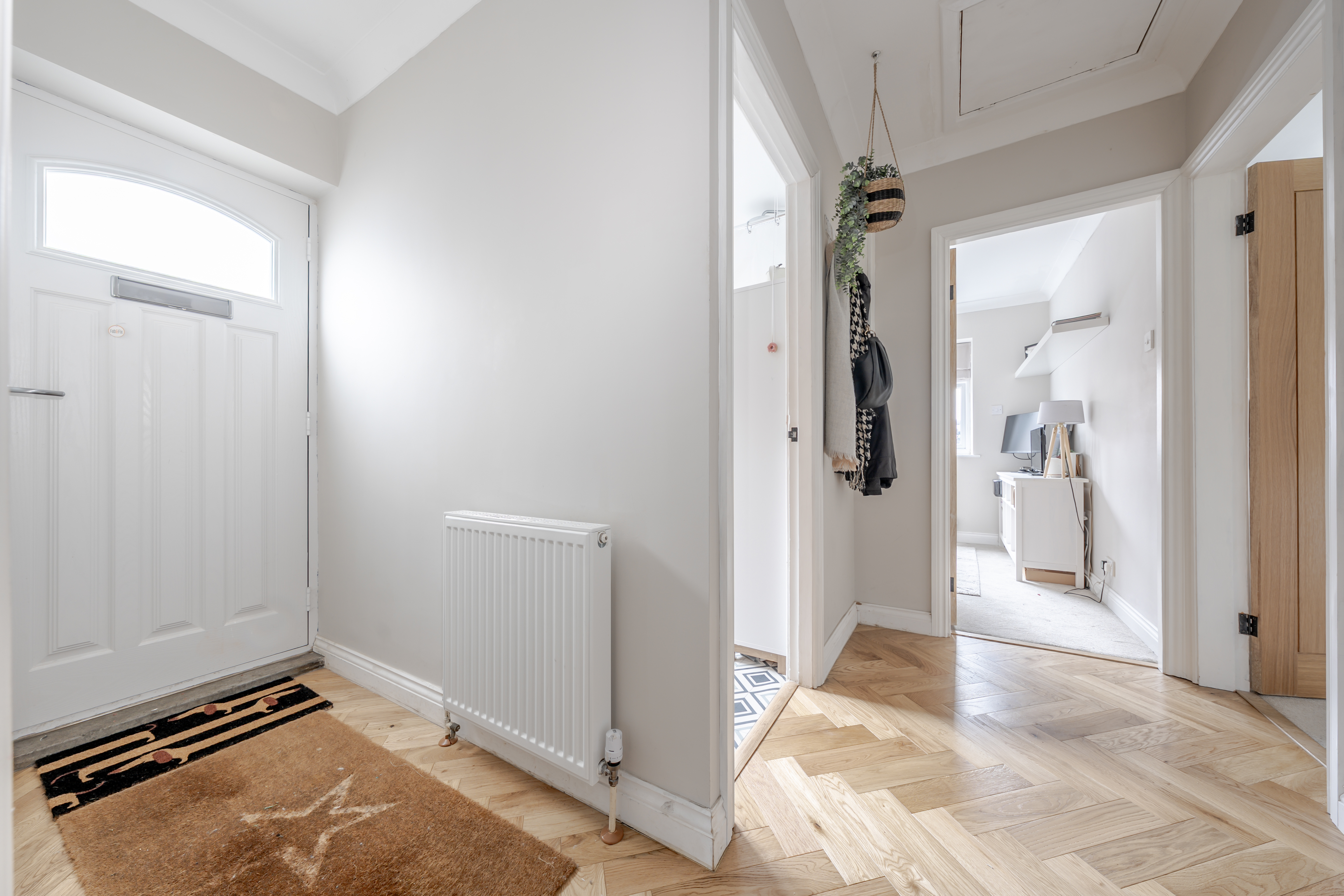 To the right is the contemporary kitchen, complete with attractive wooden flooring, integrated appliances and ample cabinetry. To the rear, the spacious and light-filled living room enjoys a large window and electric fire, creating a comfortable and inviting space to relax. Elegant ceiling cornicing extends from the living area into both bedrooms — one a generously sized double and the other a large single, ideal as a home office if required. The bedrooms are served by a modern family bathroom with an over-bath shower.