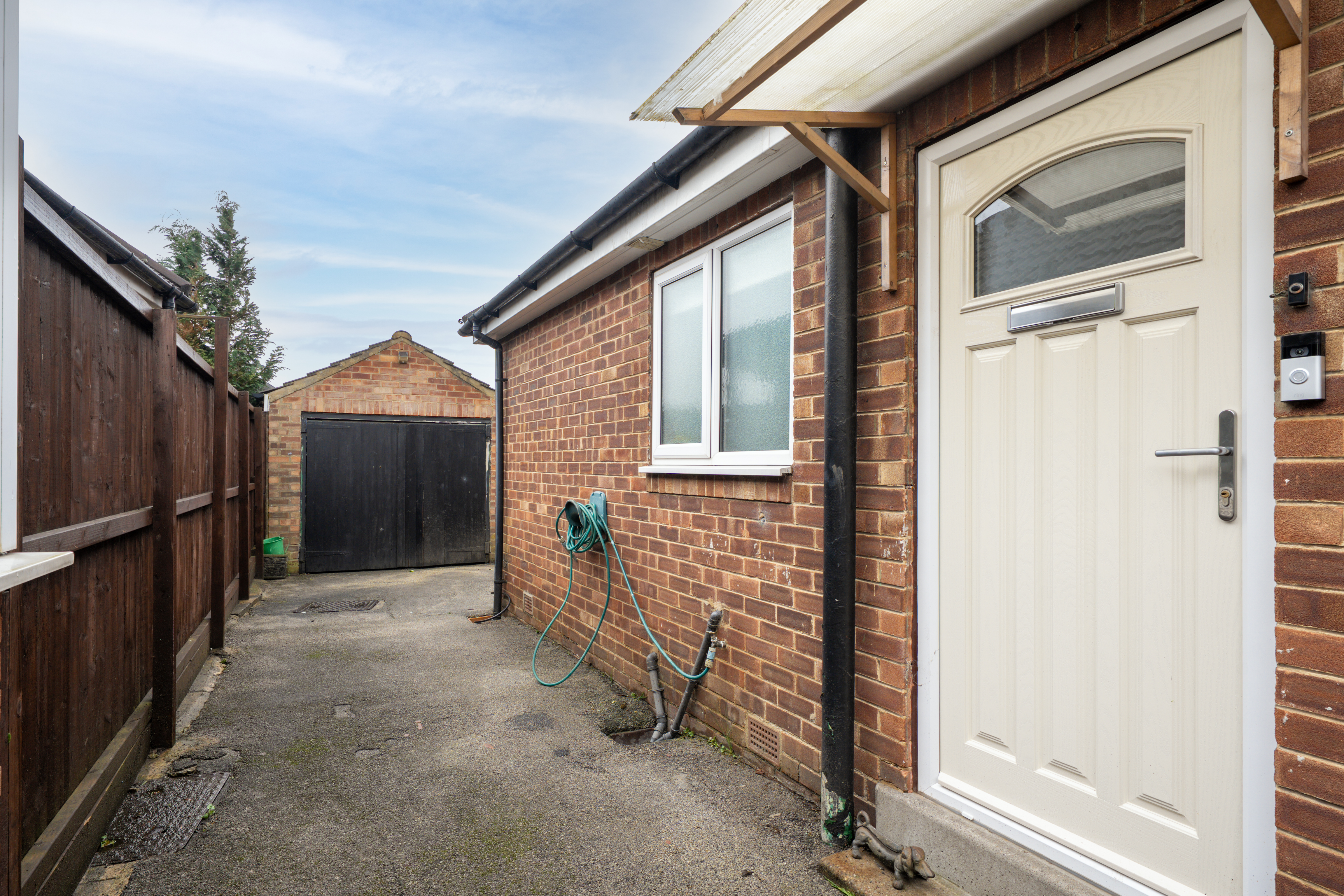To the front, the property features a single-car driveway and a neatly landscaped garden, which wraps around to the left-hand side via wooden double gates leading to the private single garage. The front door, positioned to the left of the house, opens into a welcoming entrance hall providing access to all rooms.