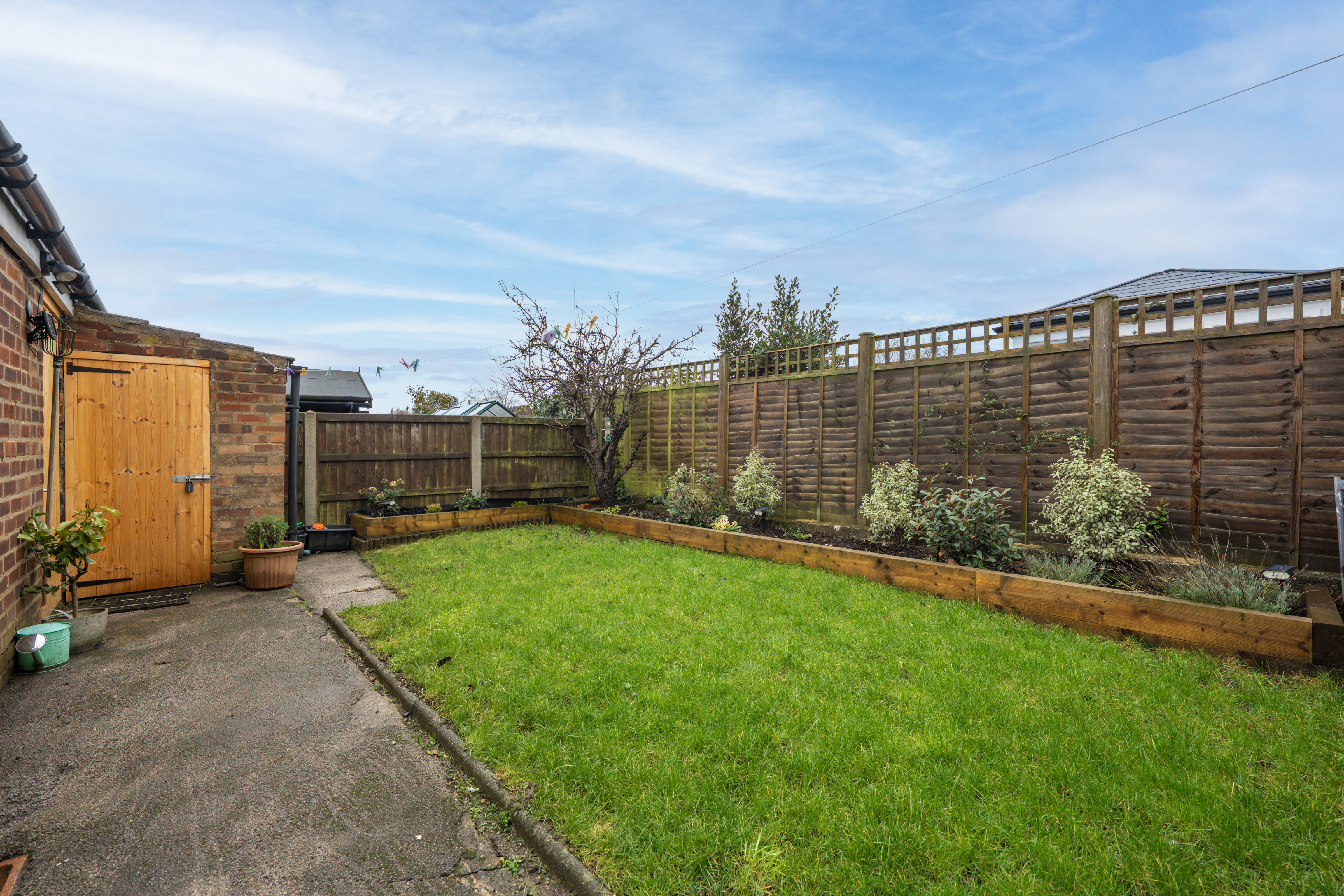 Enclosed rear garden laid to lawn, with bordered planting beds, driveway access, shed and garage.