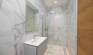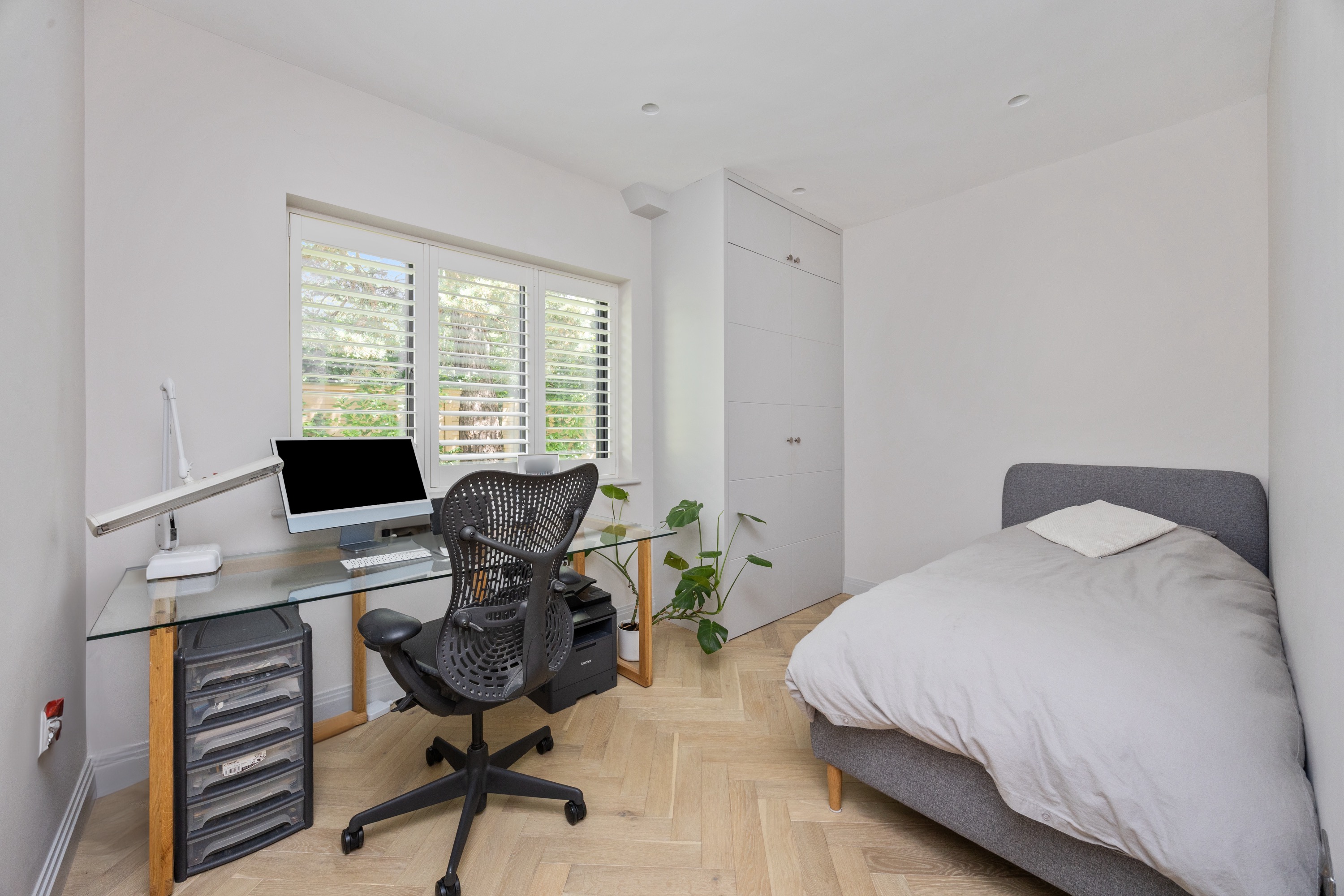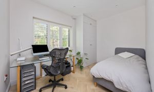 The German built kitchen has a selection of eye level and base units, a large island station which has seating for dining, a separate utility room with space for washing machine, tumble dryer and integrated wine cooler, a control cupboard with access to the Valliant combi boiler , meters and under floor heating controls and access to the rear garden. The kitchen and dining area also has two triple aluminum doors onto the south facing landscaped rear garden. Further rooms on the ground floor include two bedrooms, one of which is being used as an office with storage, a fully tiled walk in shower room with WC, wash hand basin with vanity unit. All of the ground floor is under floor heated.