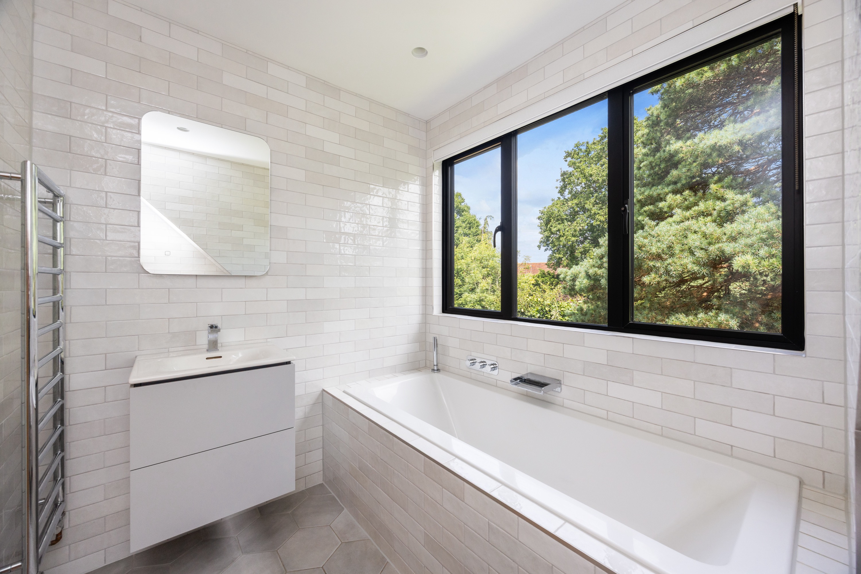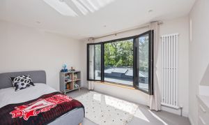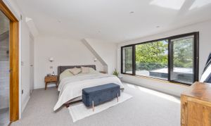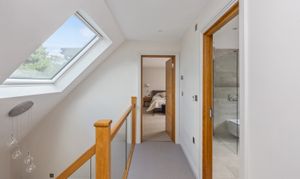 On the first floor the landing has a glass balustrade leading to three further bedrooms, the master has a Juliette balcony with views over the rear garden, good built-in cupboards and an ensuite bathroom with bath and shower attachment, WC, wash hand basin and vanity units, one of the two additional bedrooms also has an a Juliette balcony and the other bedroom has floor to ceiling feature window. The tiled family bathroom has a free standing bath, walk in shower, WC, and wash hand basin with vanity unit. Both bathrooms have under floor heating.