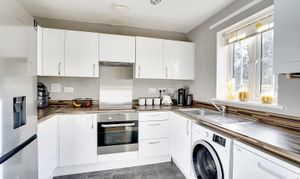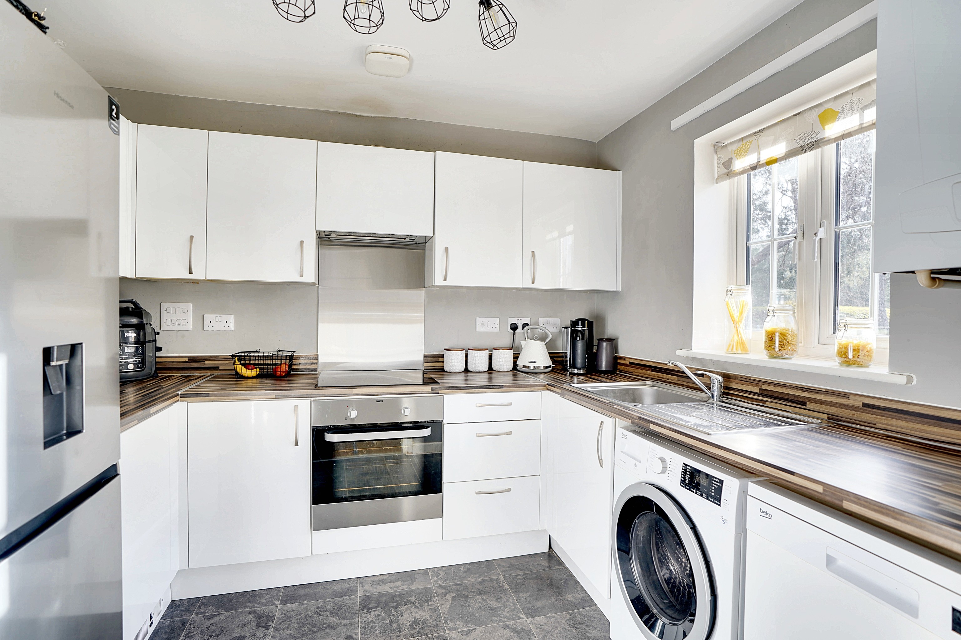 A truly stunning kitchen with a matching range of wall and base mounted units with rolltop worksurfaces over. stainless steel one and a half bowl sink with mixer taps over. Double oven with induction hob above. Integrated dishwasher, fridge/freezer and washing machine. Window to front aspect