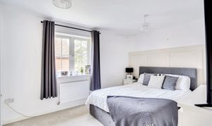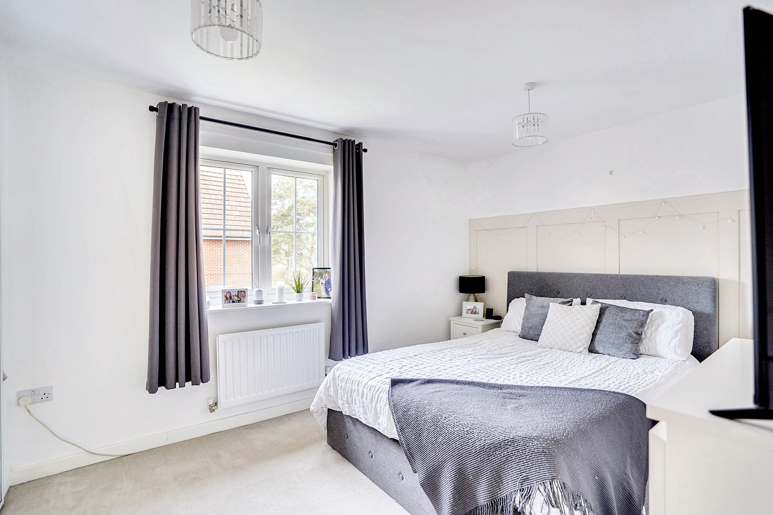 Large fitted sliding wardrobes. Windows to rear enjoying views over the rear garden space for a king size bed