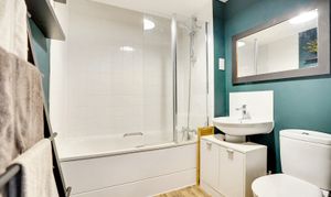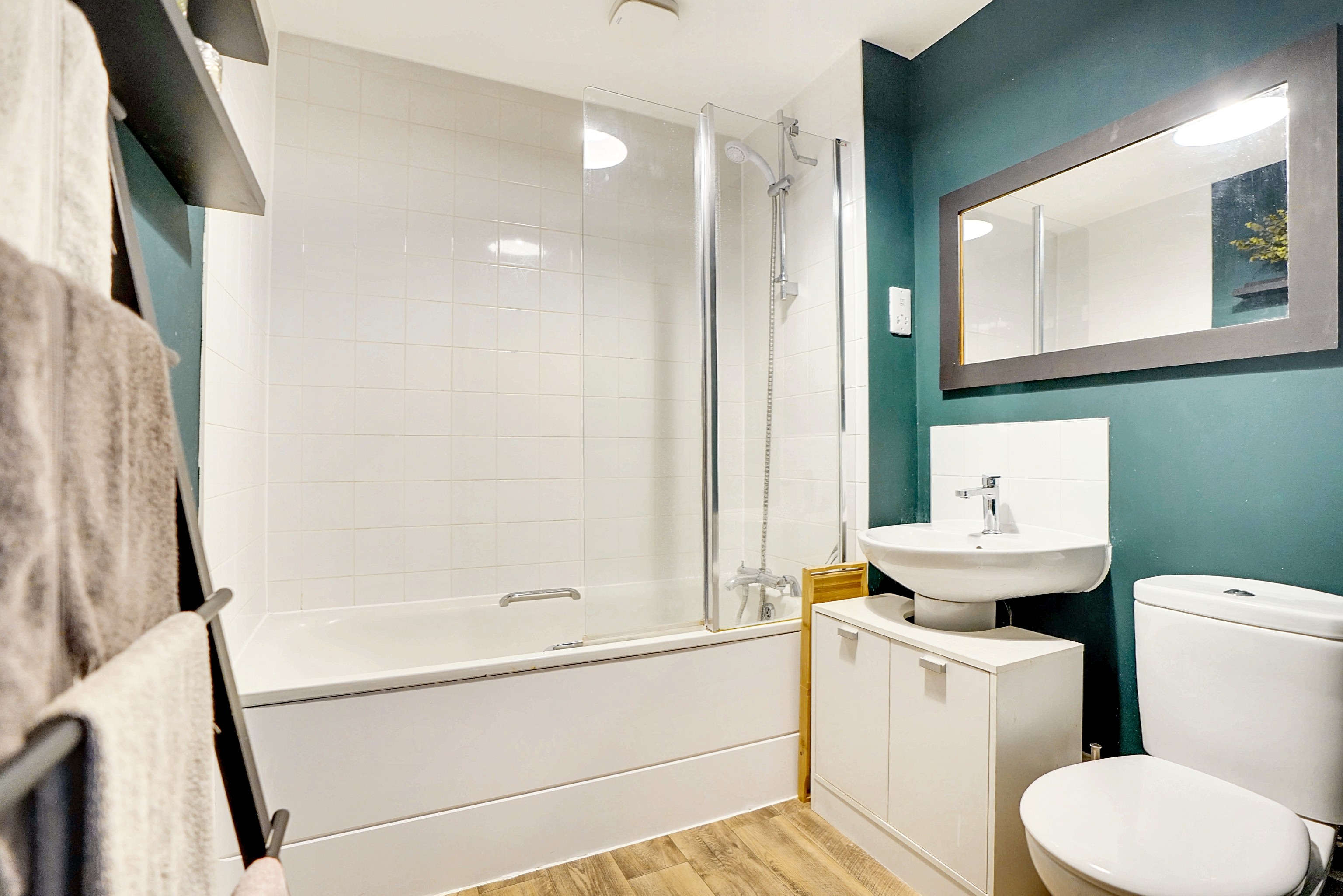Large panelled bathtub with shower and mixer taps over. WC, Wash hand basin with mixer taps over.