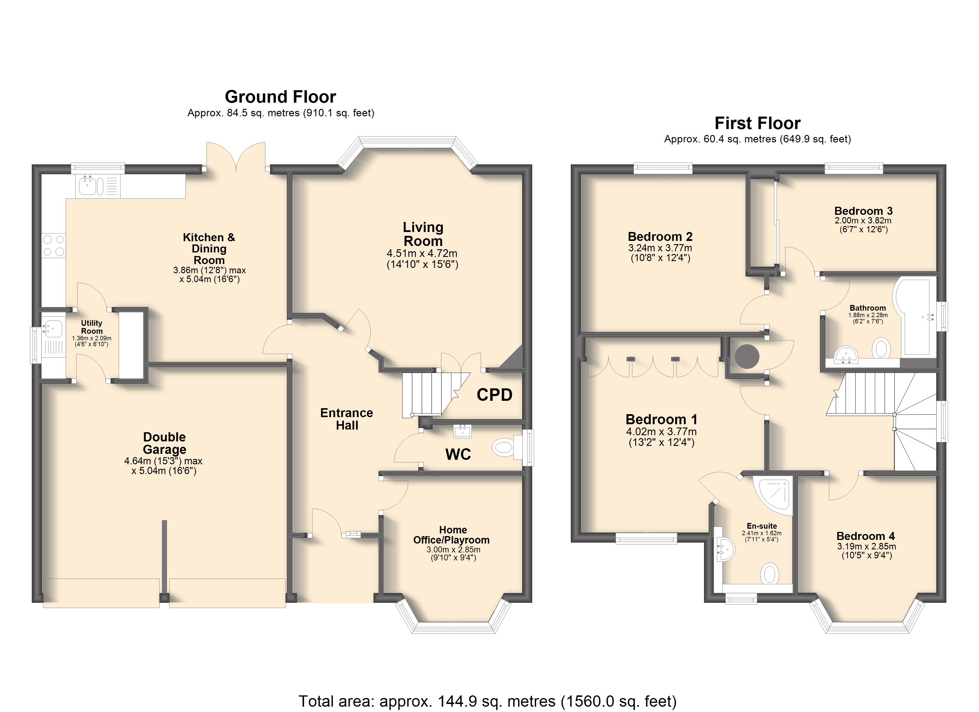 Ascending to the first floor, a bright and airy landing leads to four well-appointed bedrooms. The principal bedroom is enhanced by fitted wardrobes and an elegant en-suite shower room. The remaining bedrooms are all excellent in size, providing plenty of room for both fitted and freestanding furniture, while a superbly finished family bathroom with a contemporary three-piece suite serves the household.