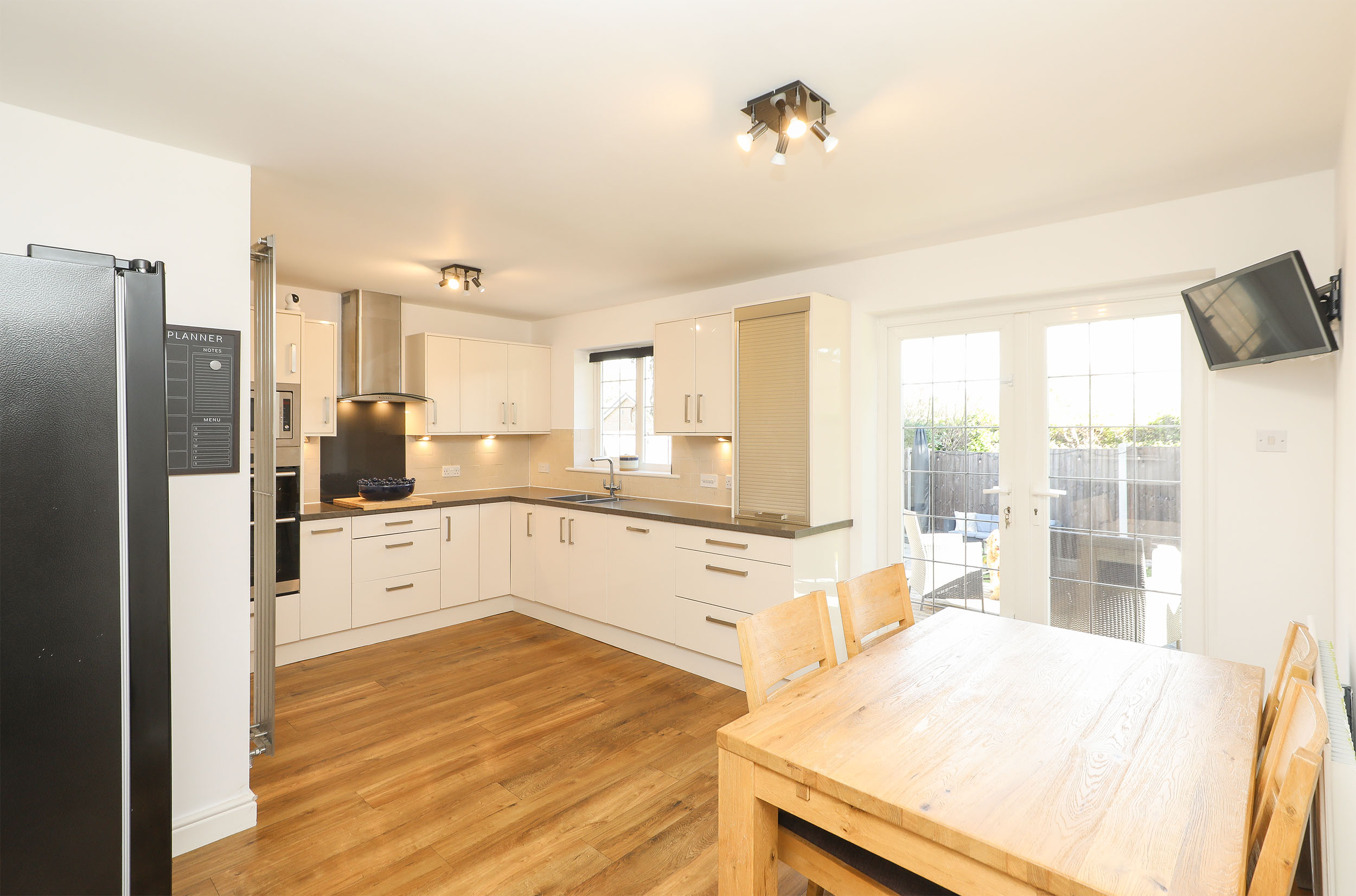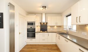 A welcoming entrance hall, filled with natural light, sets the tone for the home and provides an inviting flow into each of the living spaces. The open-plan kitchen and dining area is a true highlight, designed with both style and functionality in mind. Featuring a comprehensive range of integrated appliances, sleek modern finishes, and ample workspace, the kitchen caters perfectly to the demands of everyday life. The adjoining dining space, complete with doors opening onto the landscaped rear garden, creates a superb setting for both family meals and entertaining guests. Adding further practicality, a separate utility room ensures the space remains perfectly organised for busy households.