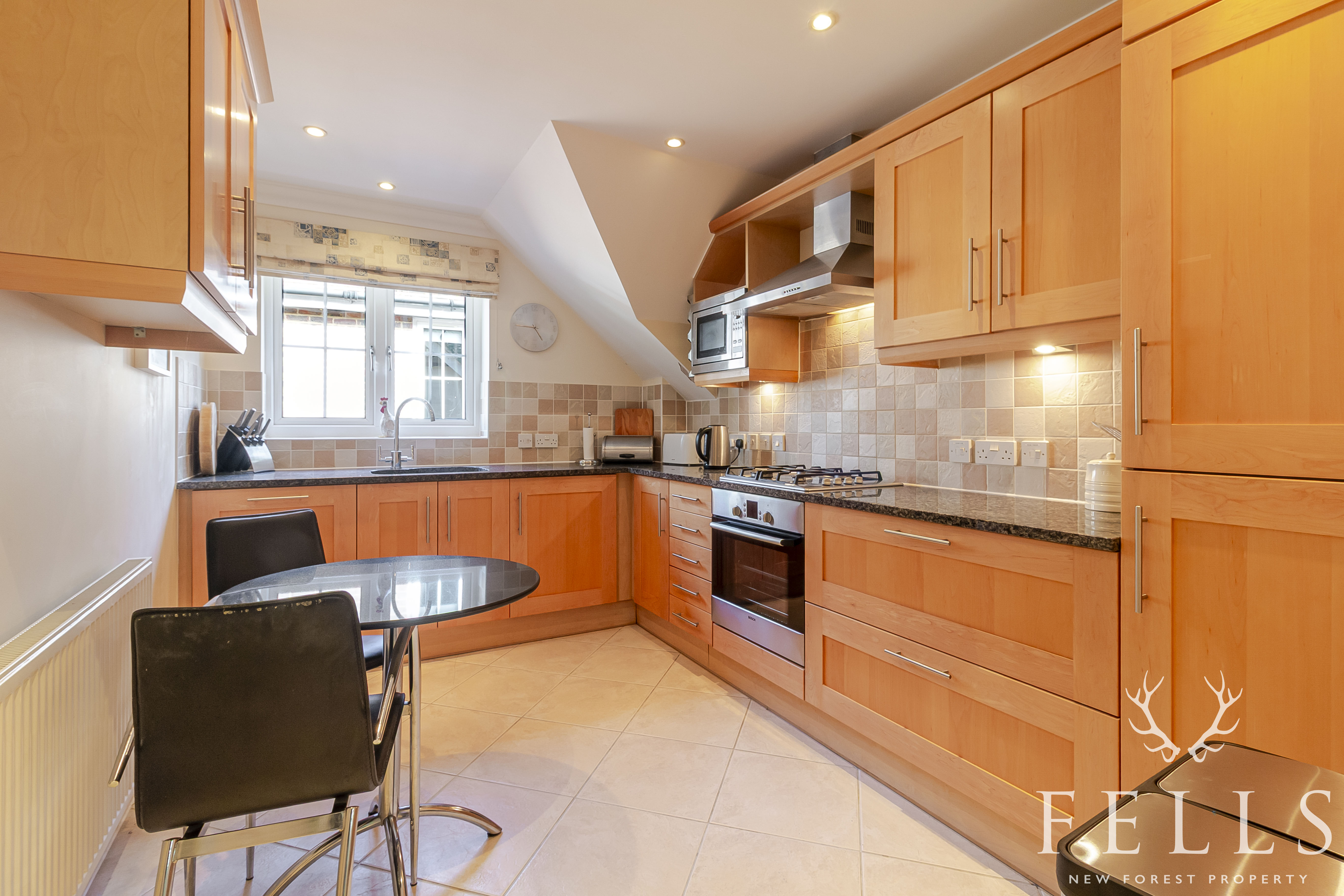The kitchen is both elegant and practical. Granite worktops complement a comprehensive range of base and wall cabinets, while integrated appliances include an electric oven, gas hob with extractor, microwave, dishwasher and upright fridge freezer. A one and a half bowl stainless steel sink sits beneath a side window, and there is space for a small breakfast table, perfect for morning coffee before the day begins.