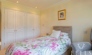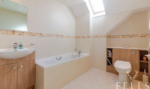 Both bedrooms are genuine doubles overlooking the front gardens. Bedroom one benefits from two built in double wardrobes and a fully tiled ensuite shower room with corner shower, vanity unit, heated towel rail and opaque side window. Bedroom two also enjoys a built in wardrobe and easy access to the fully tiled main bathroom, complete with panelled bath, vanity unit, heated towel rail and a Velux roof window that draws in soft natural light.