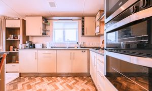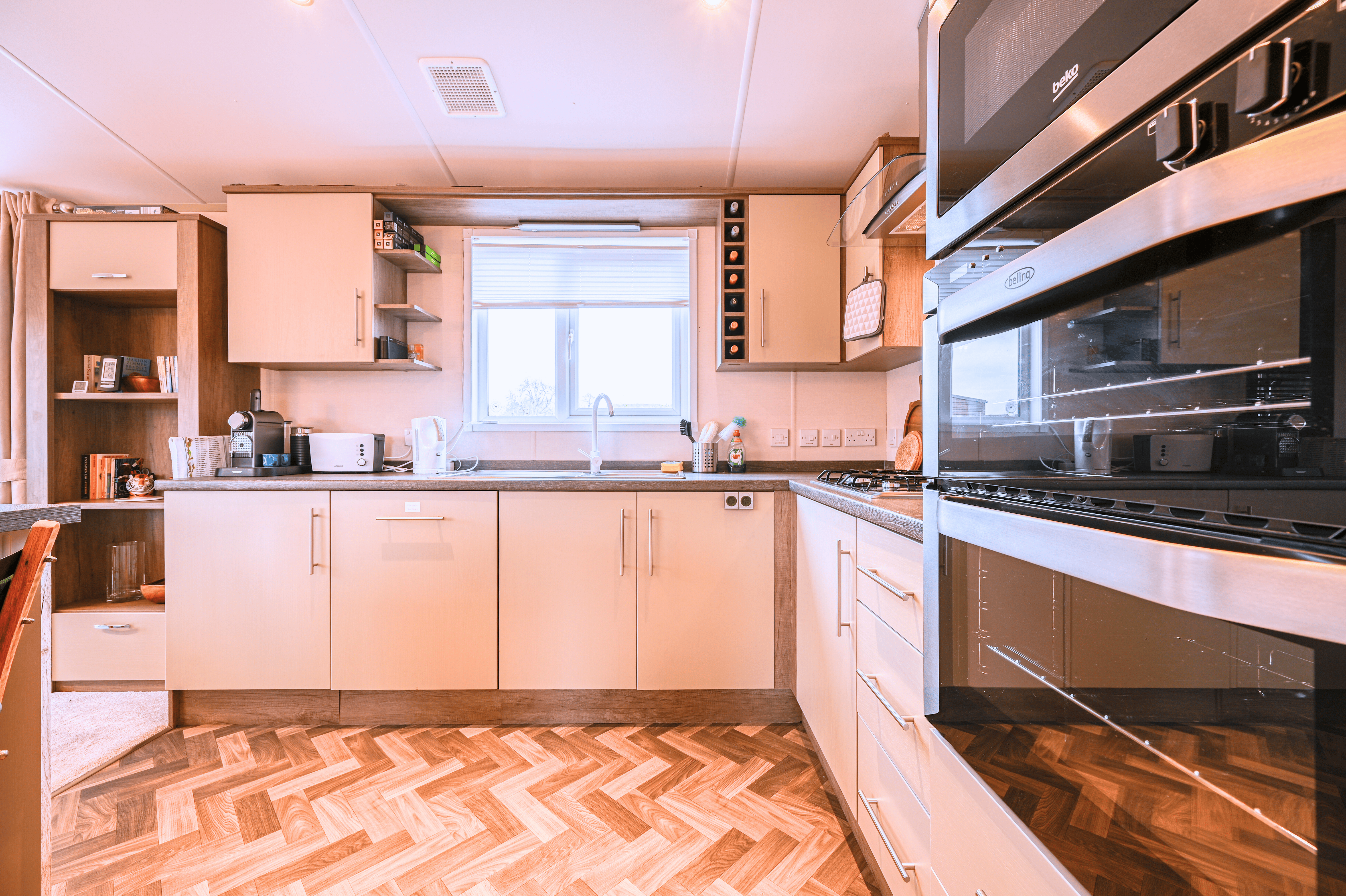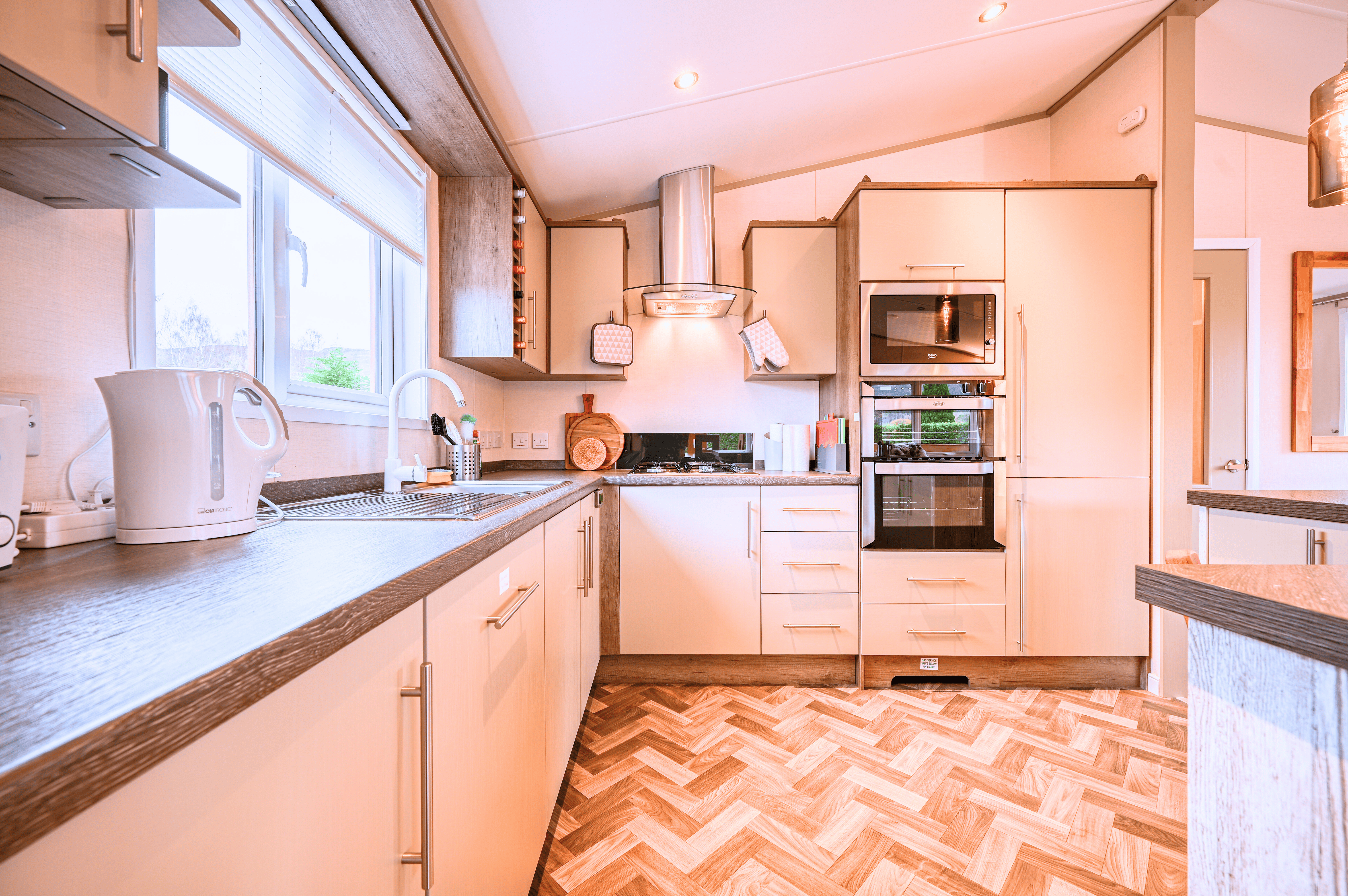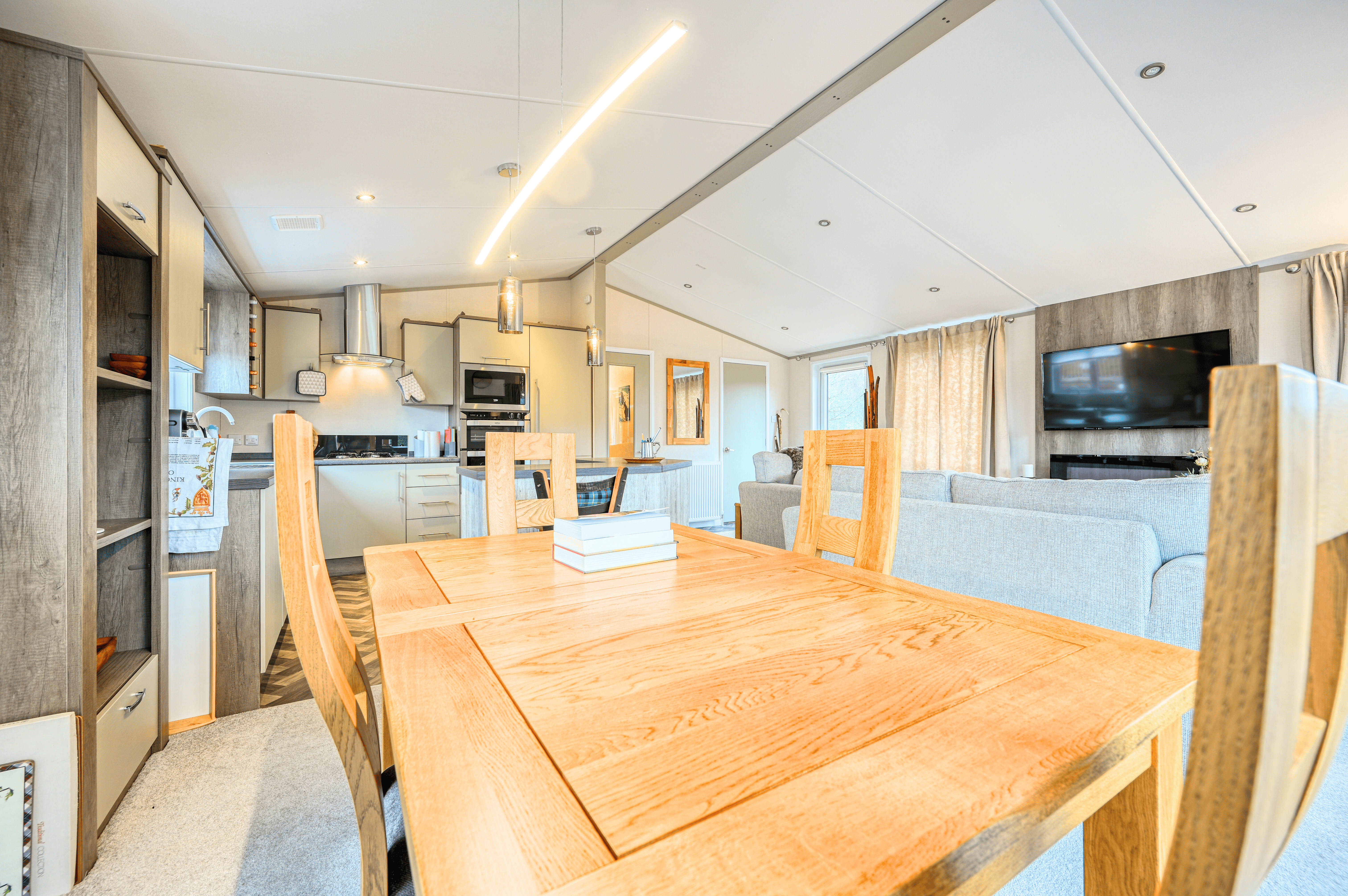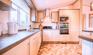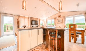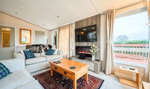 The open-plan living area exudes warmth and light, featuring freestanding furniture, a contemporary electric fire, and large patio doors that open onto the wraparound deck—inviting the outdoors in and creating a wonderful space to relax or entertain. The fully fitted kitchen is both sleek and practical, complete with integrated appliances including an oven, microwave, fridge-freezer, dishwasher, and washer/dryer, ensuring every modern convenience for a true home-from-home experience.