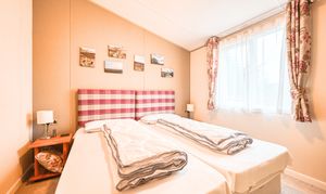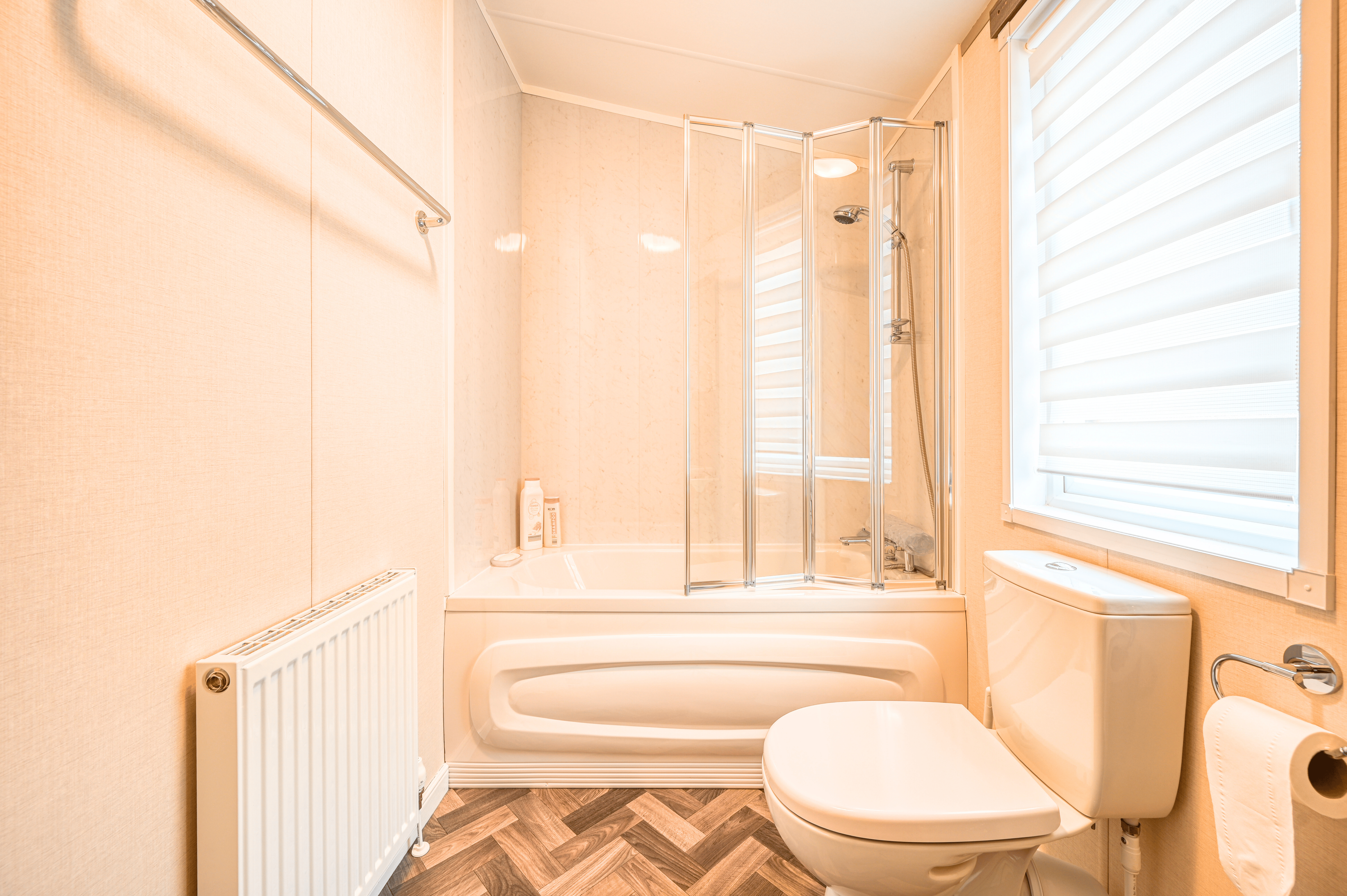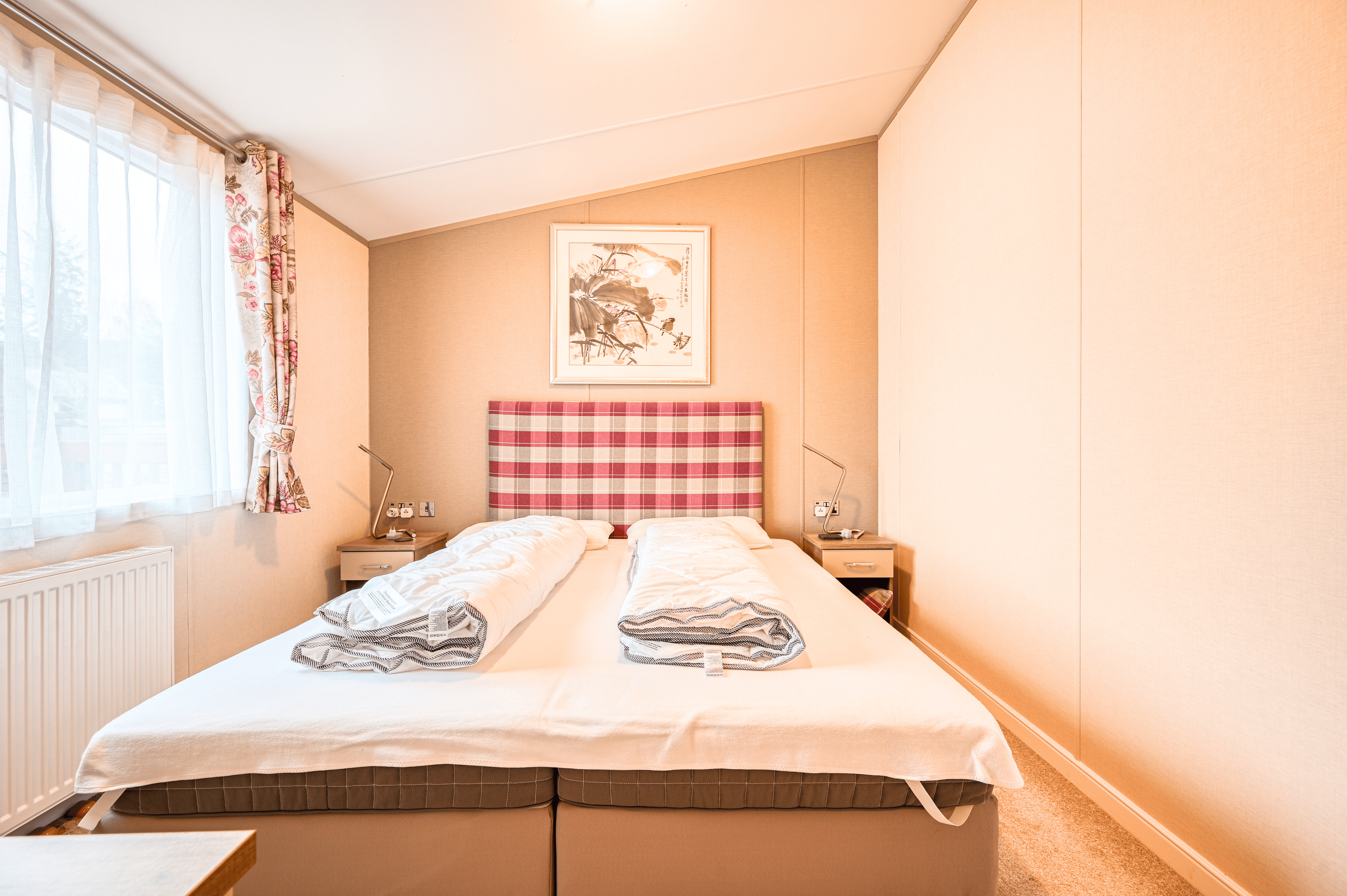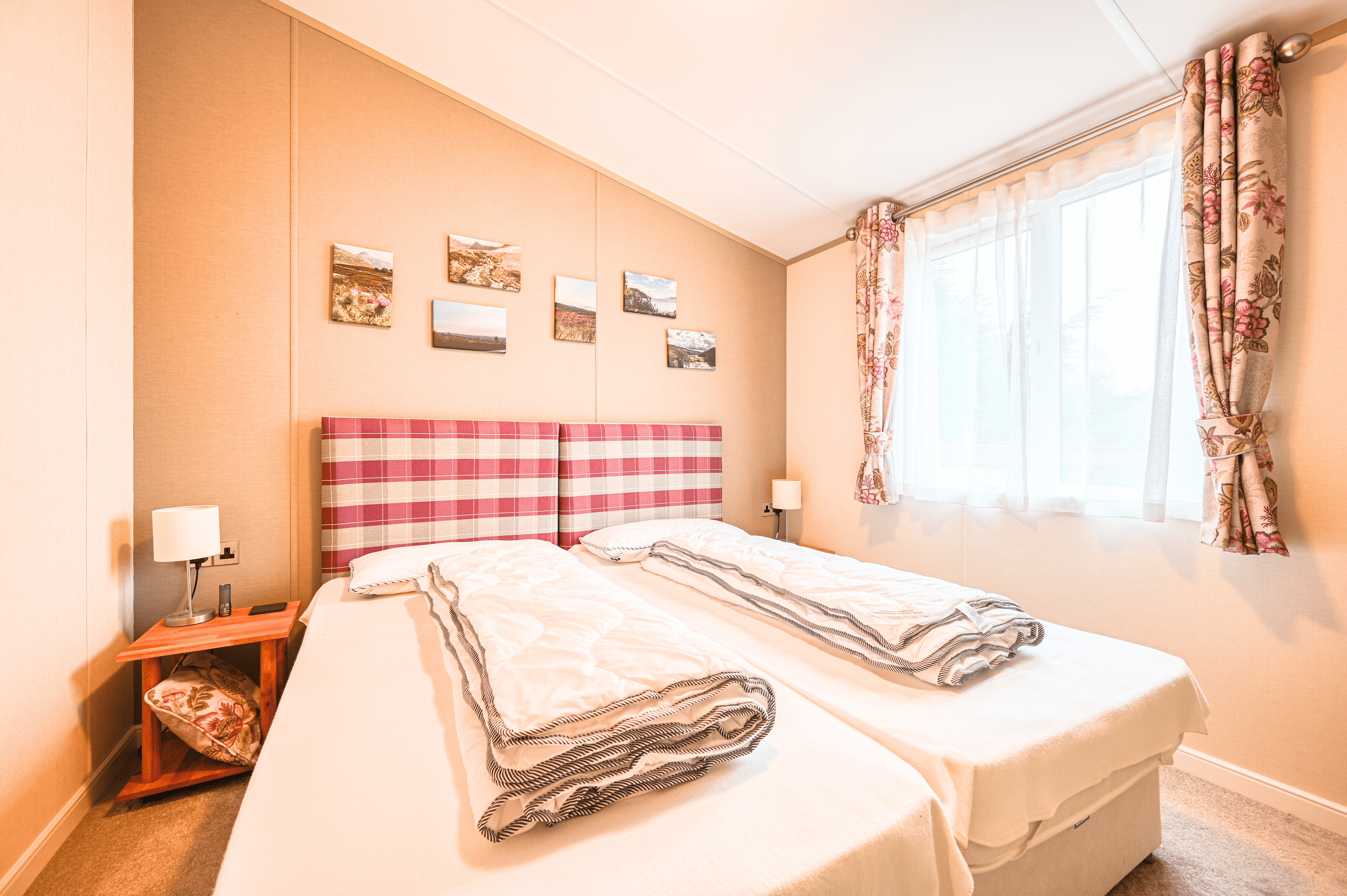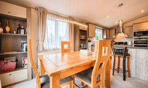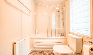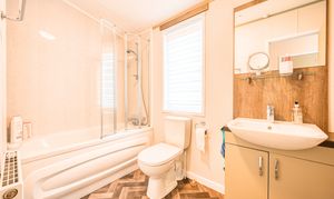 Both bedrooms have been thoughtfully designed to provide comfort and versatility. The generous master suite includes a private en-suite bathroom, while the stylish twin bedroom offers flexibility for guests or family. The bathrooms are finished to an excellent standard, featuring a full-sized bath, a walk-in shower, and elegant contemporary fittings. With double glazing and central heating throughout, this lodge guarantees year-round comfort whatever the weather.