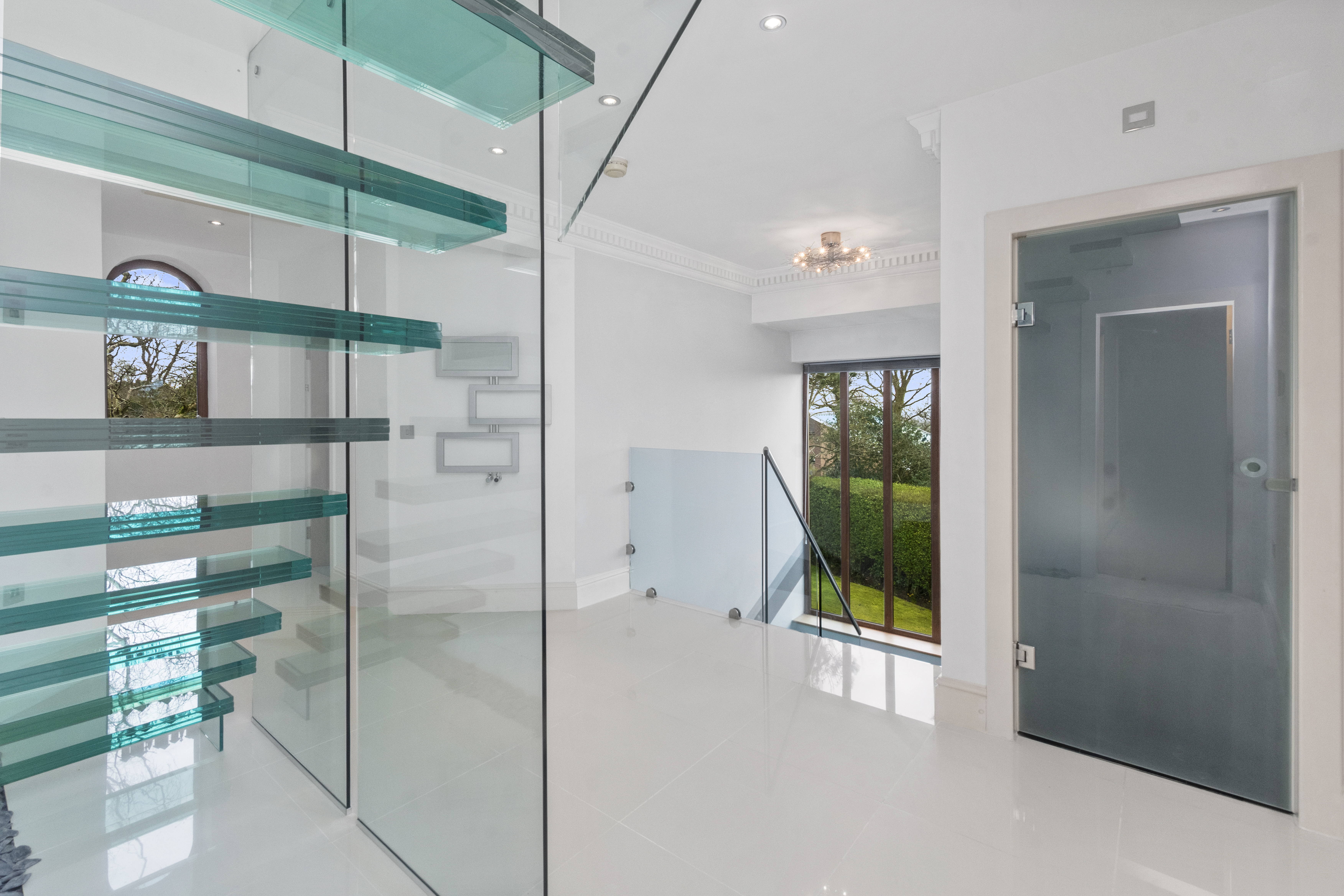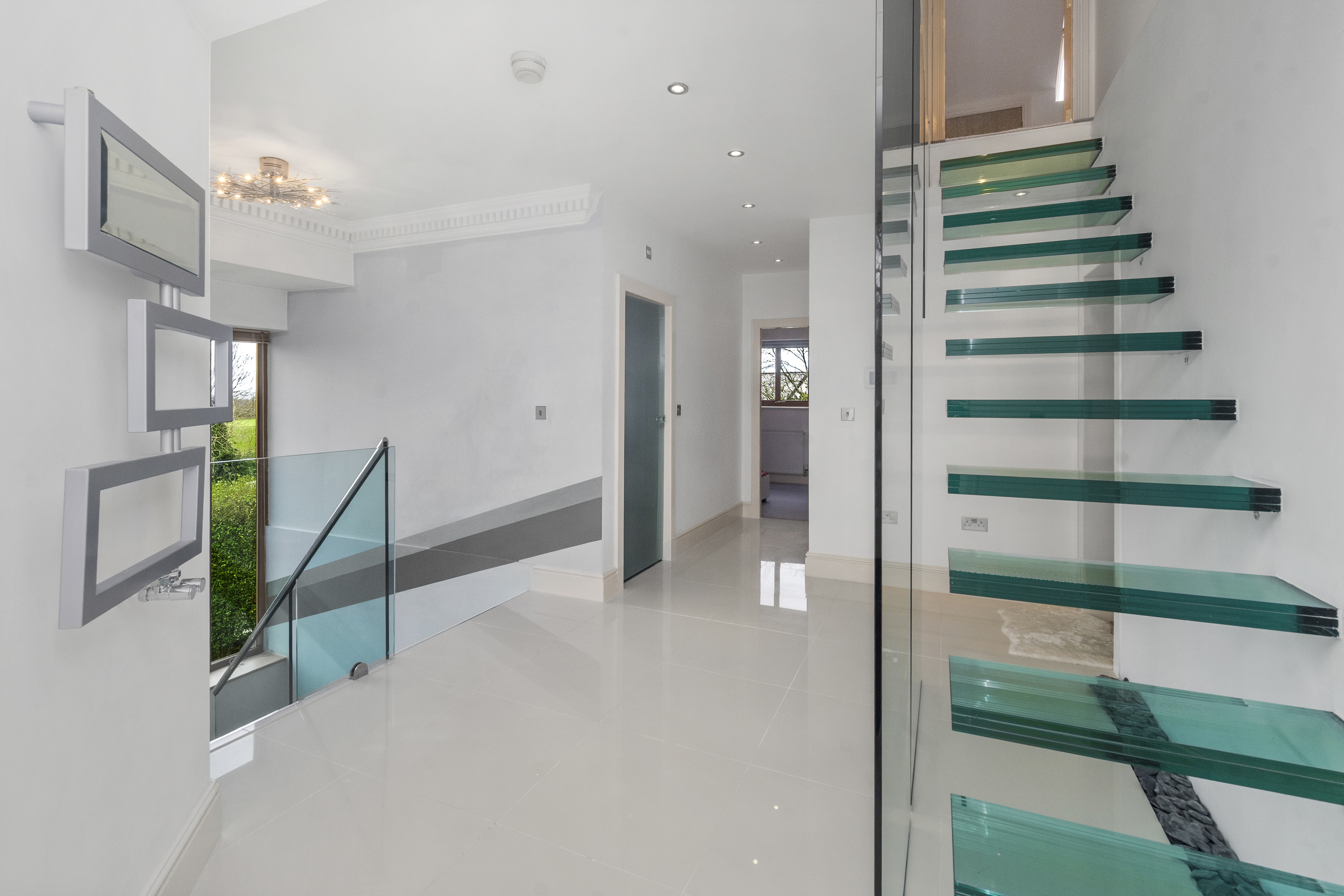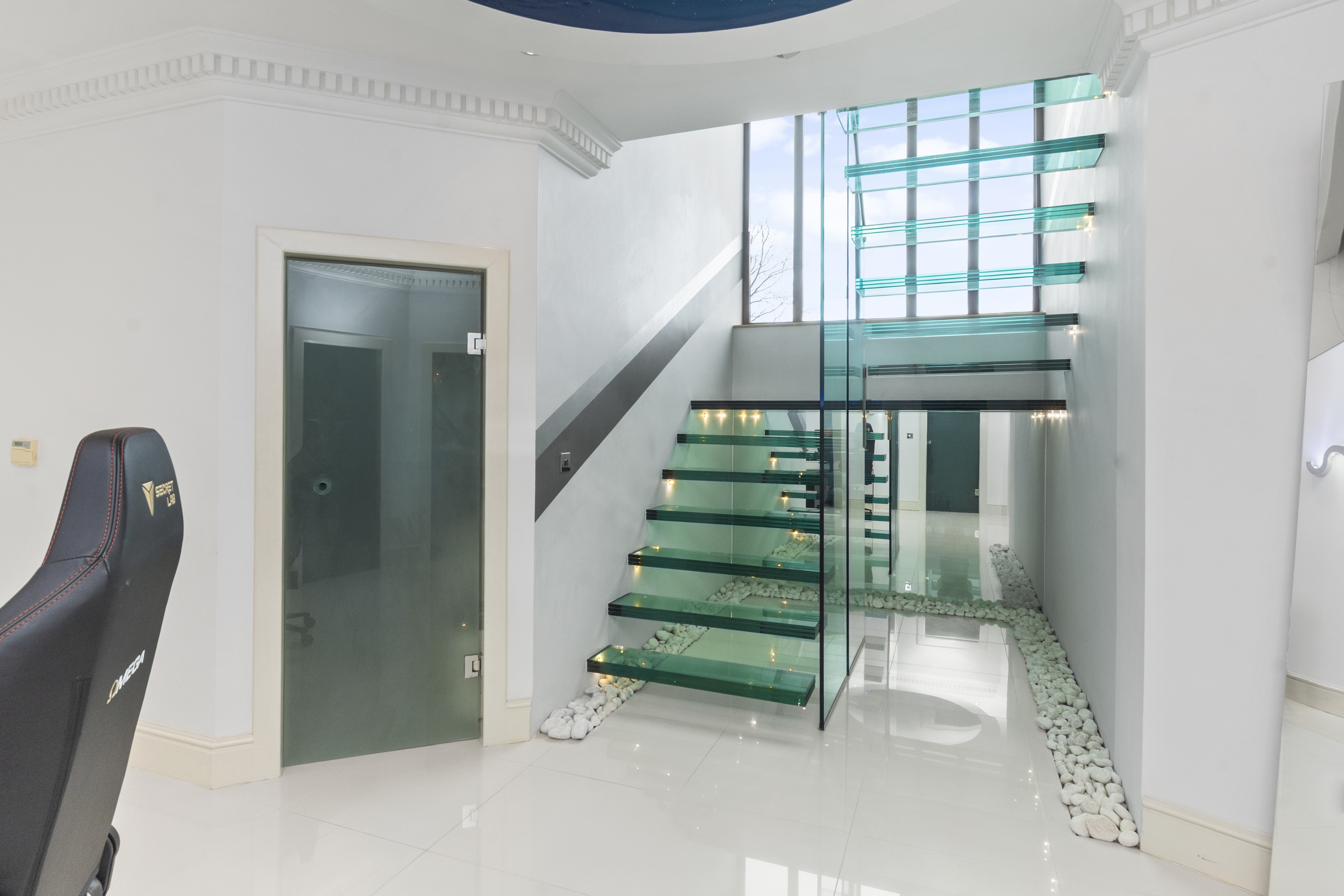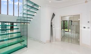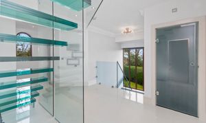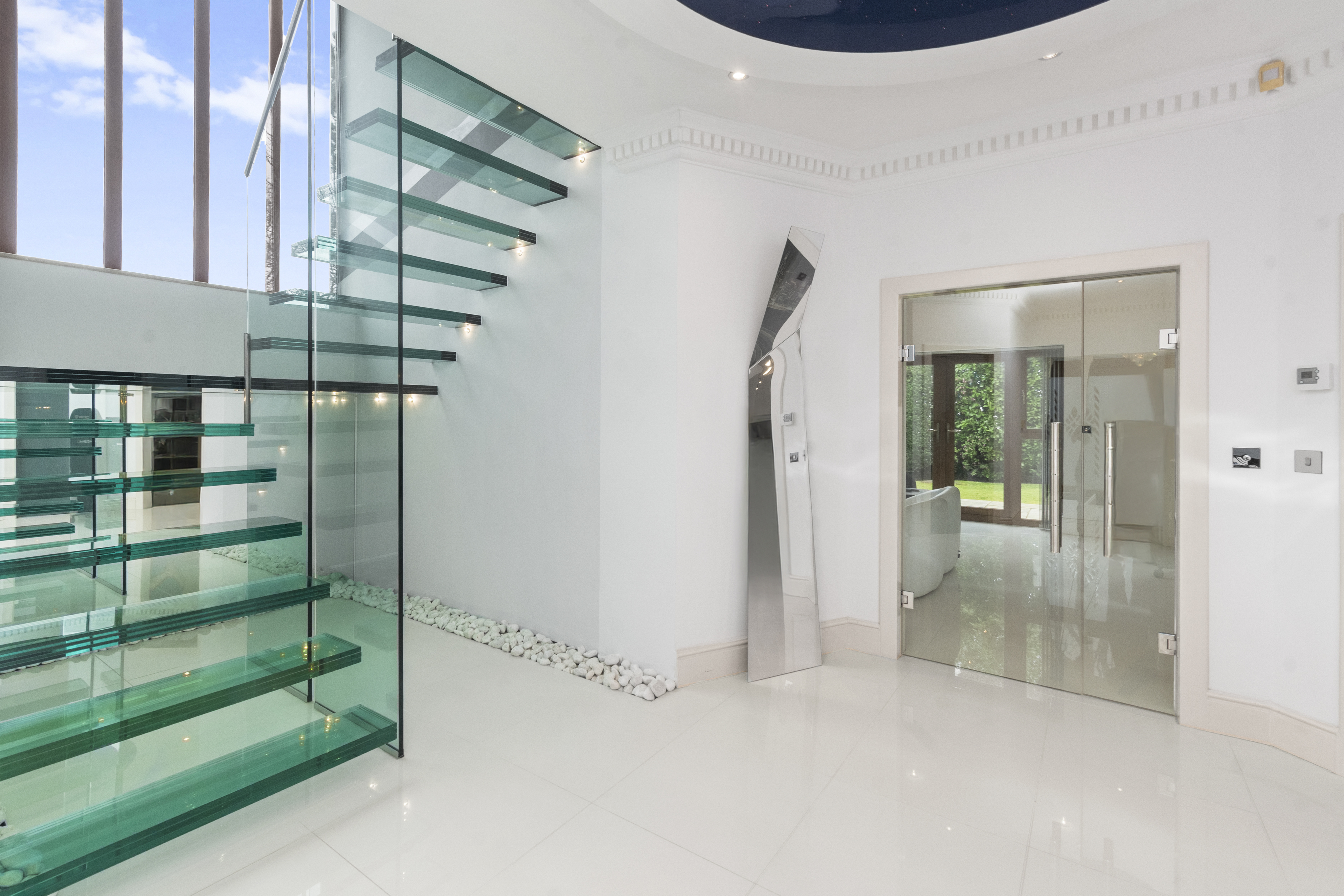 Upon arrival, the property is accessed via secure electric gates, opening onto a generous driveway and double garage, providing both convenience and peace of mind. The home immediately captivates with its grand entrance hall, featuring a striking glass staircase that rises elegantly through the property to the third floor, creating a stunning architectural focal point and an immediate sense of space and light.