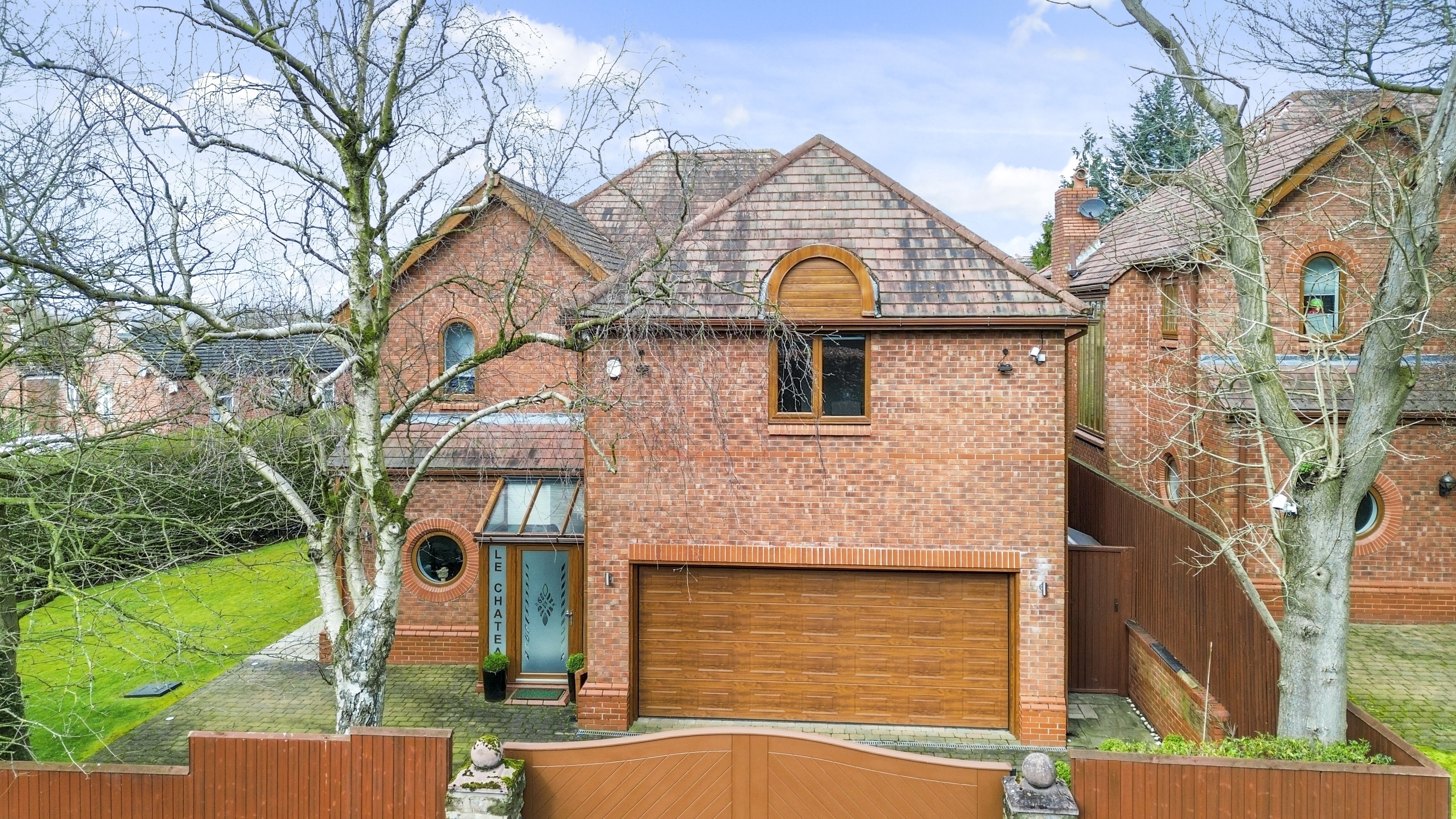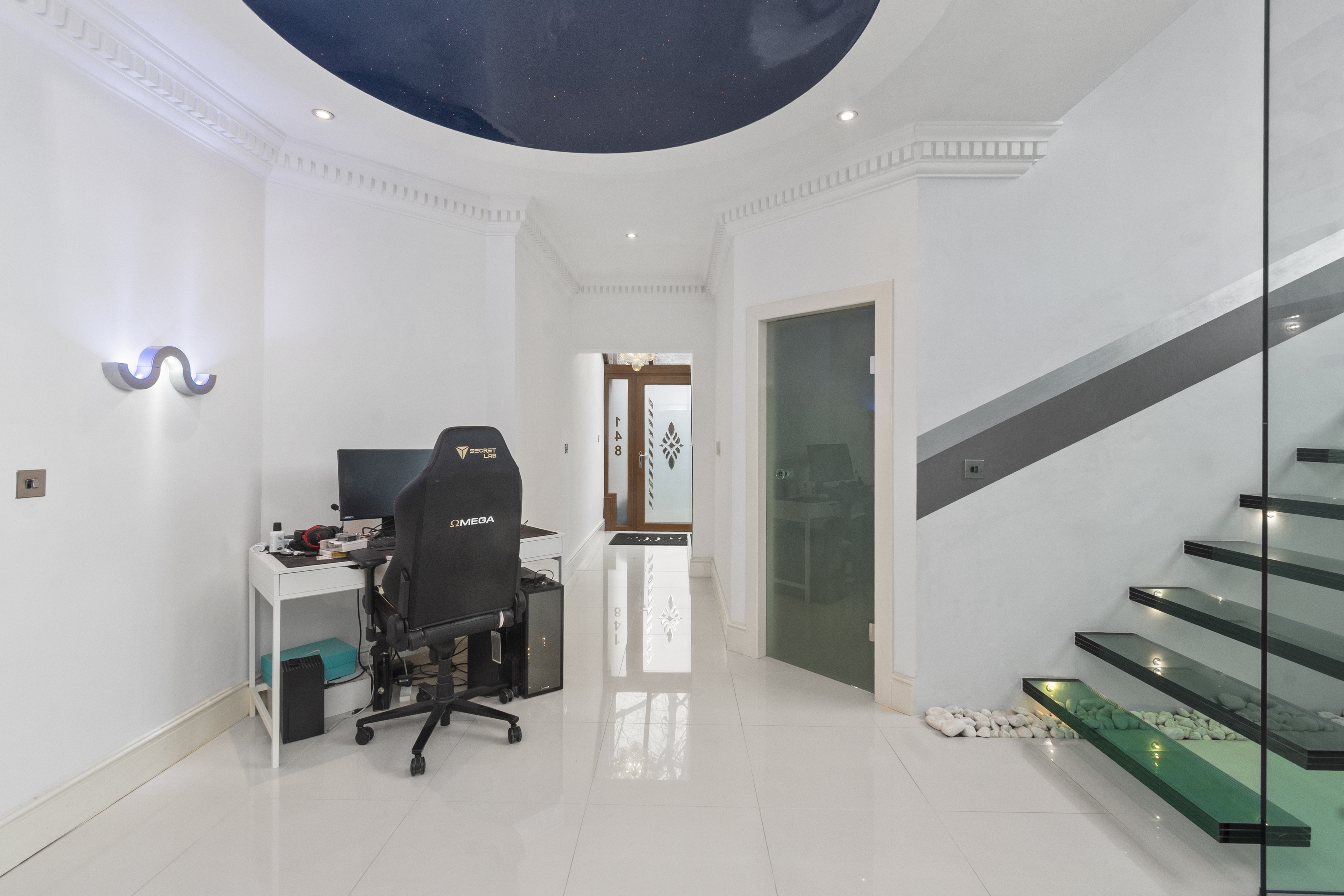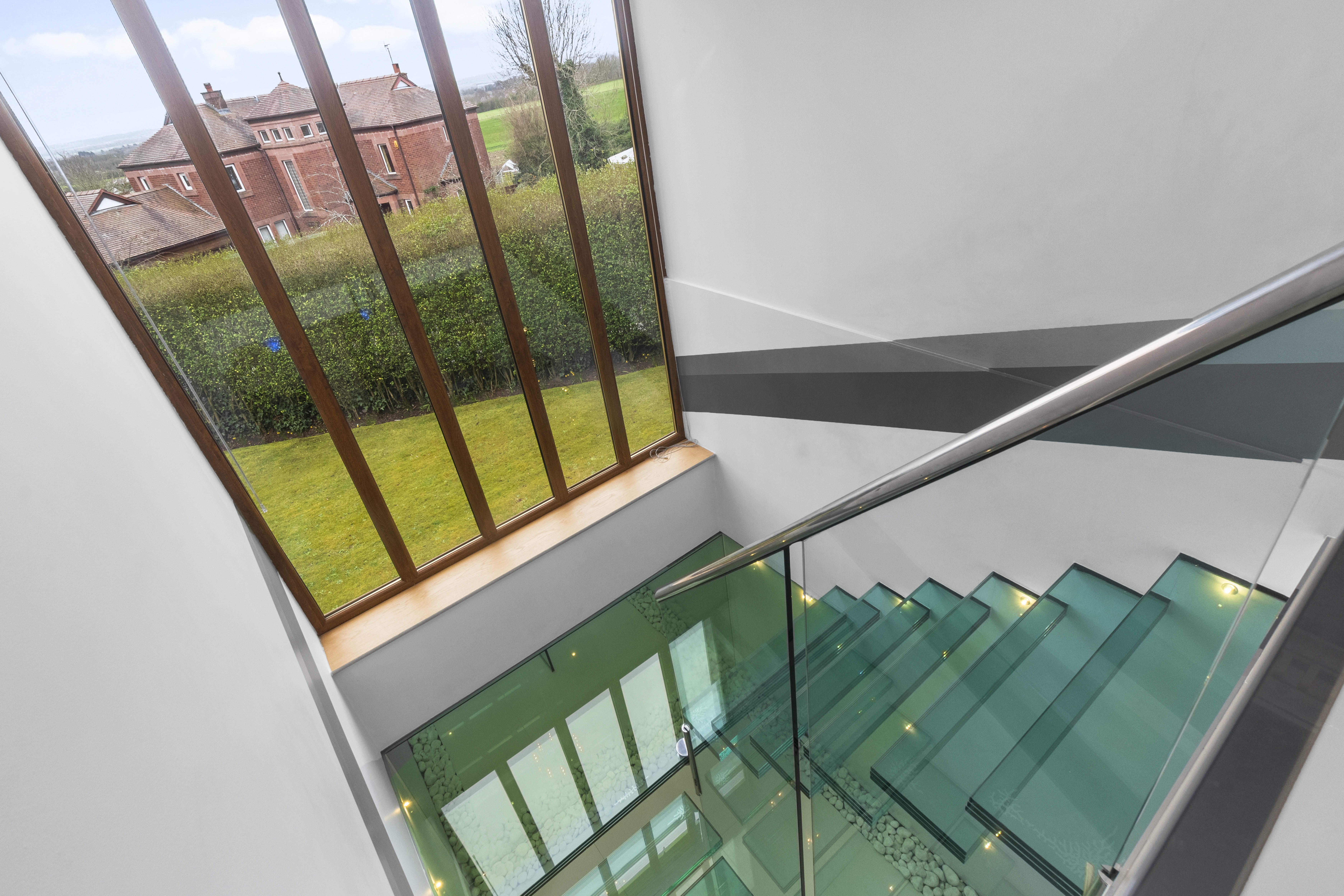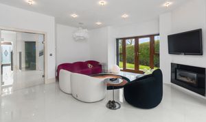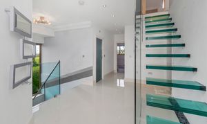 Upon arrival, the property is accessed via secure electric gates, opening onto a generous driveway and double garage, providing both convenience and peace of mind. The home immediately captivates with its grand entrance hall, featuring a striking glass staircase that rises elegantly through the property to the third floor, creating a stunning architectural focal point and an immediate sense of space and light.