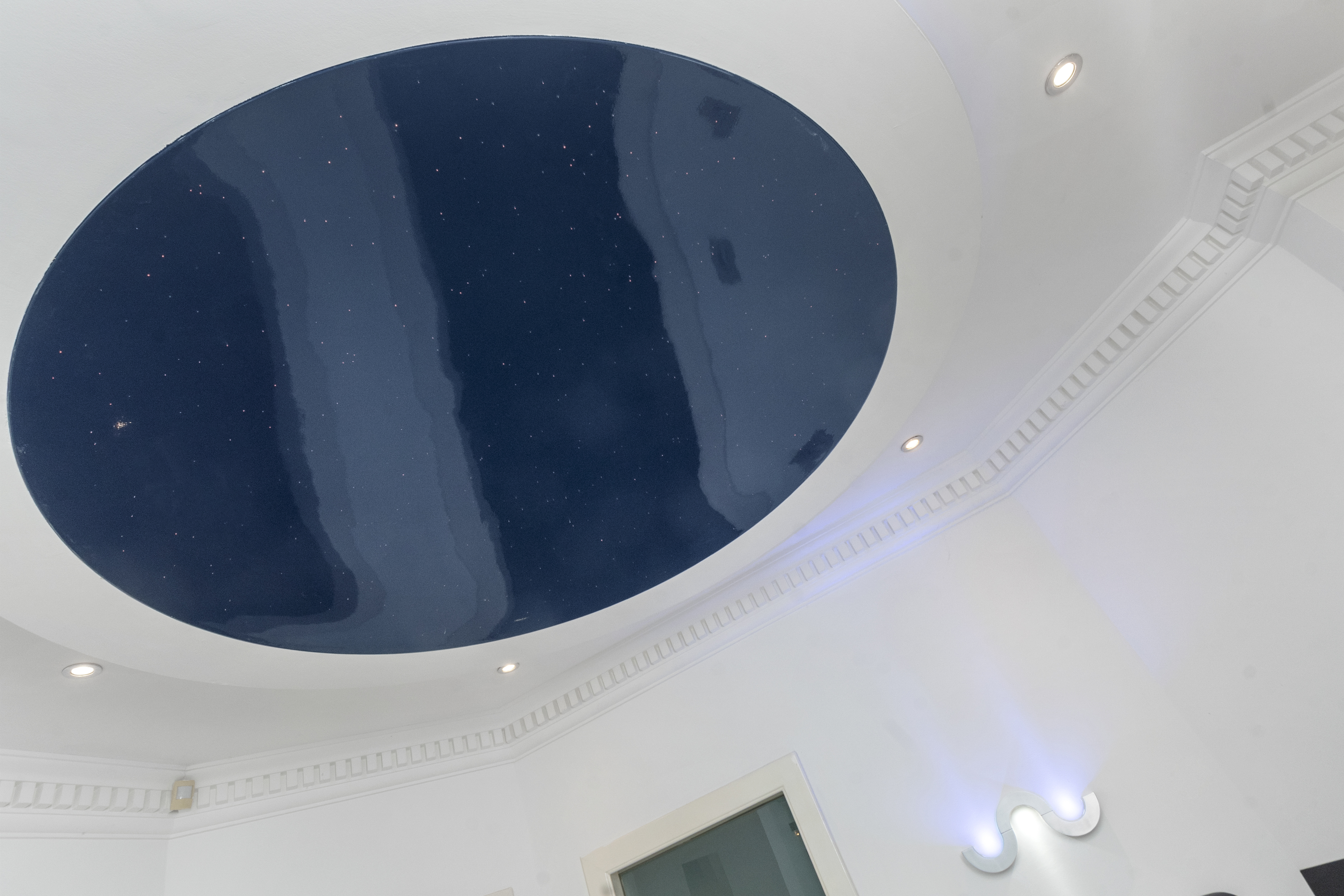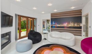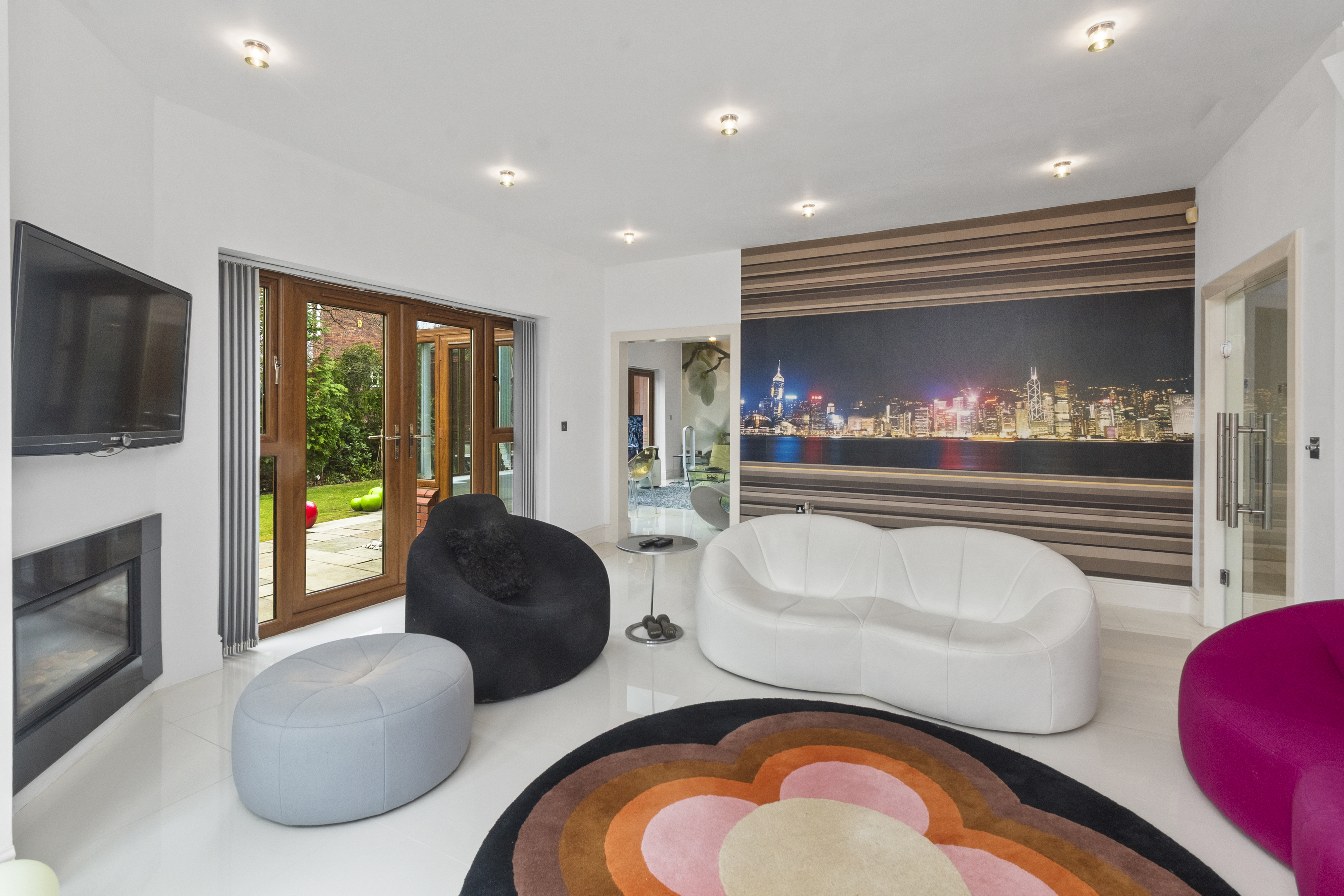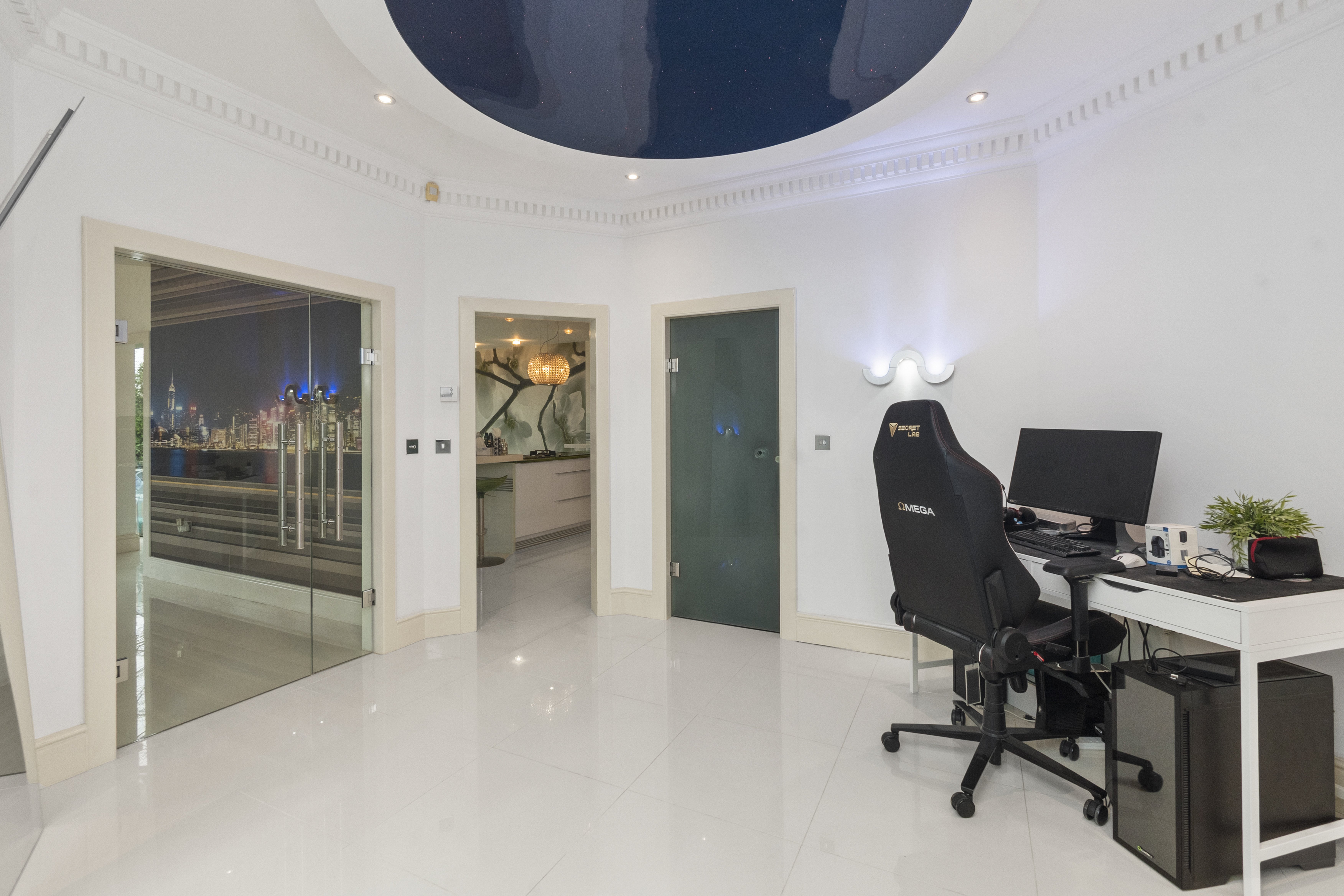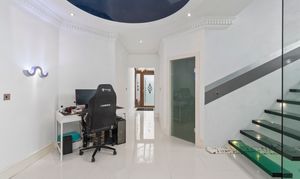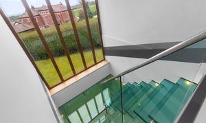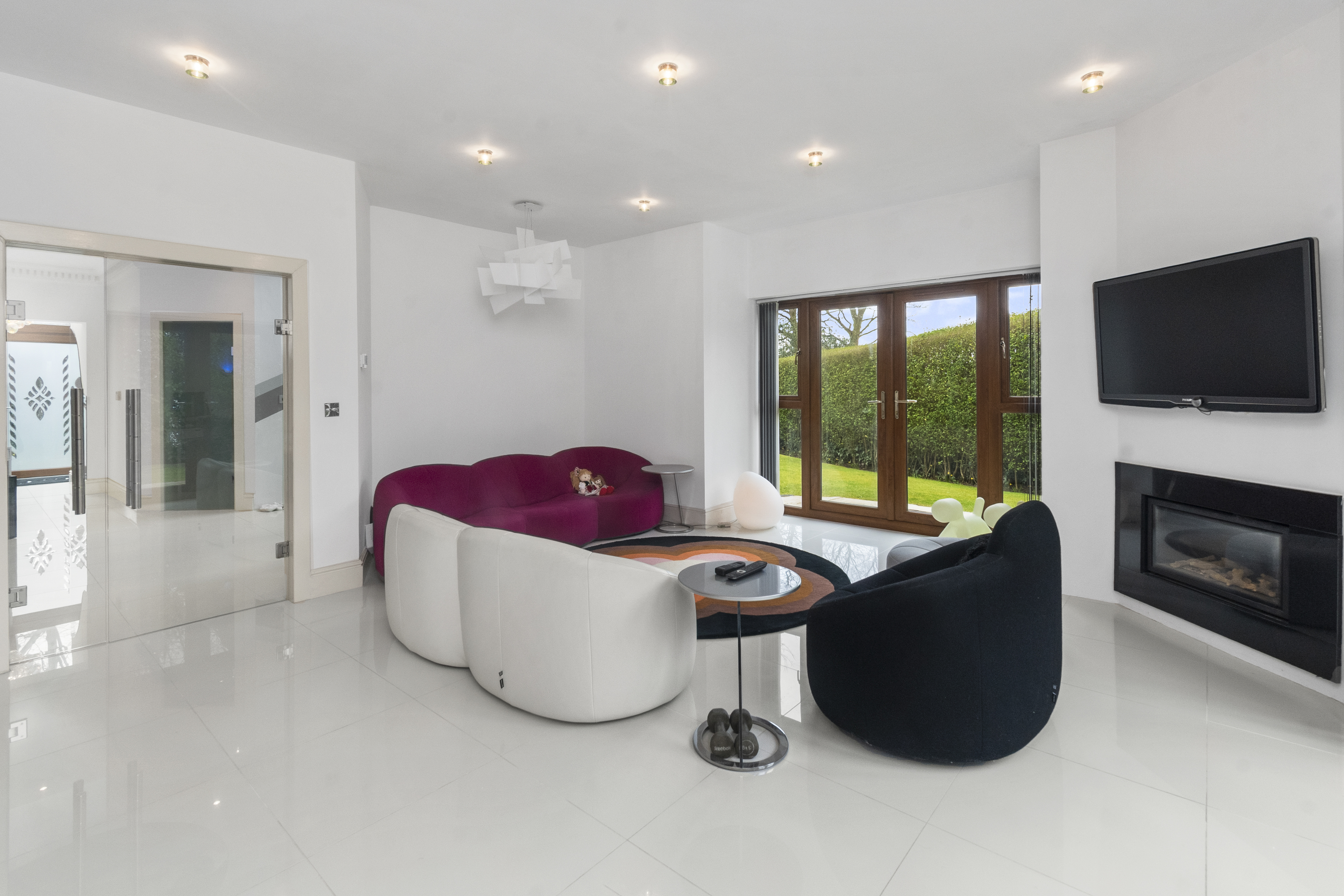 Upon arrival, the property is accessed via secure electric gates, opening onto a generous driveway and double garage, providing both convenience and peace of mind. The home immediately captivates with its grand entrance hall, featuring a striking glass staircase that rises elegantly through the property to the third floor, creating a stunning architectural focal point and an immediate sense of space and light.