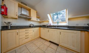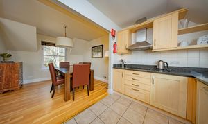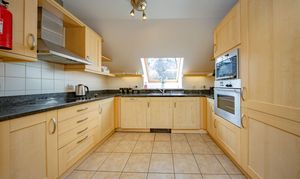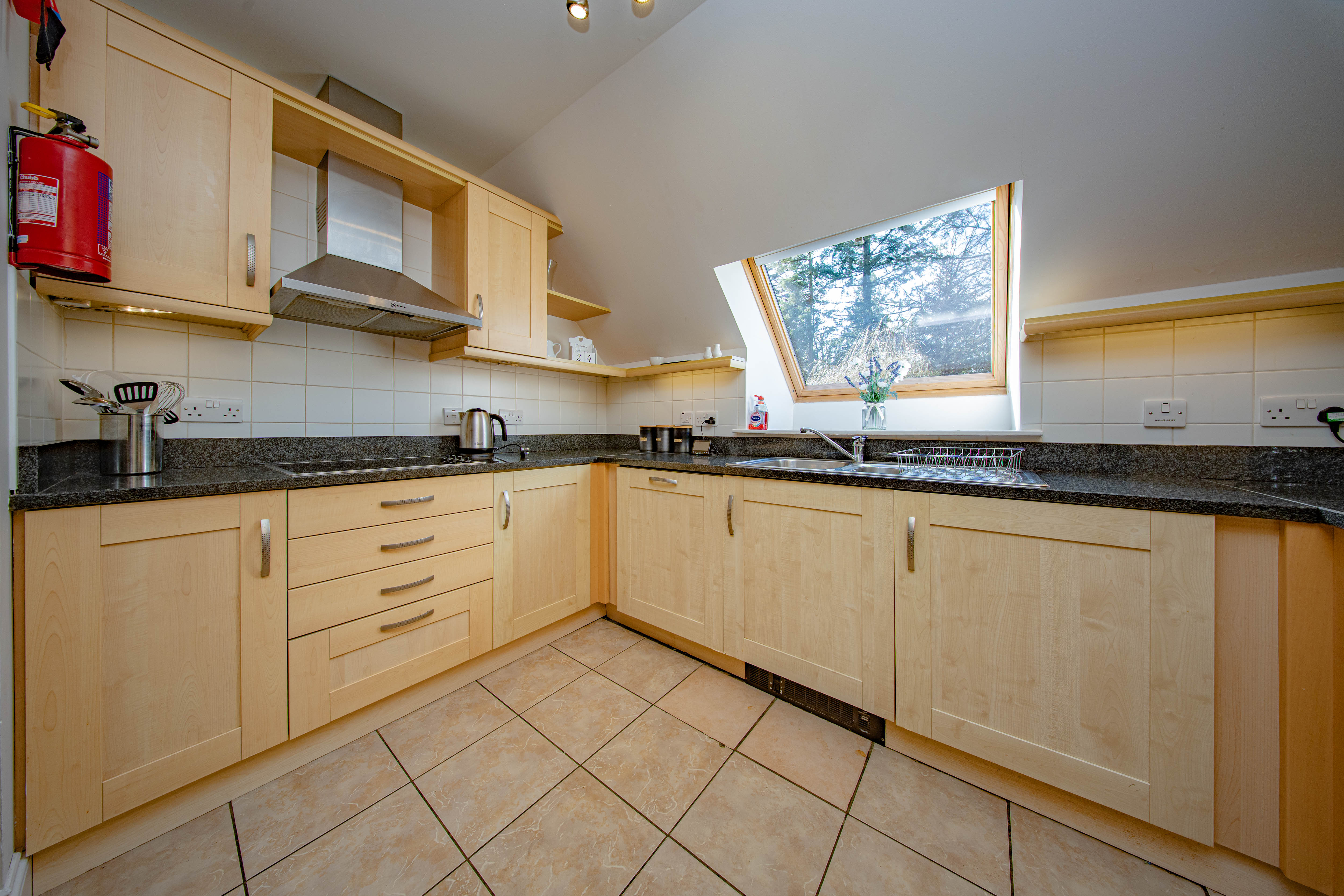 Accessed from the dining area, the kitchen benefits from a rear-facing velux window allowing for plenty of natural light. The room is fitted with a range of matching wall and base units complemented by coordinated worktops and tiled splashbacks. Features include a stainless-steel sink with drainer, a built-in Neff ceramic hob with stainless-steel extractor hood, electric oven with integrated microwave. Additional integrated appliances include a dishwasher, washing machine and fridge freezer.
