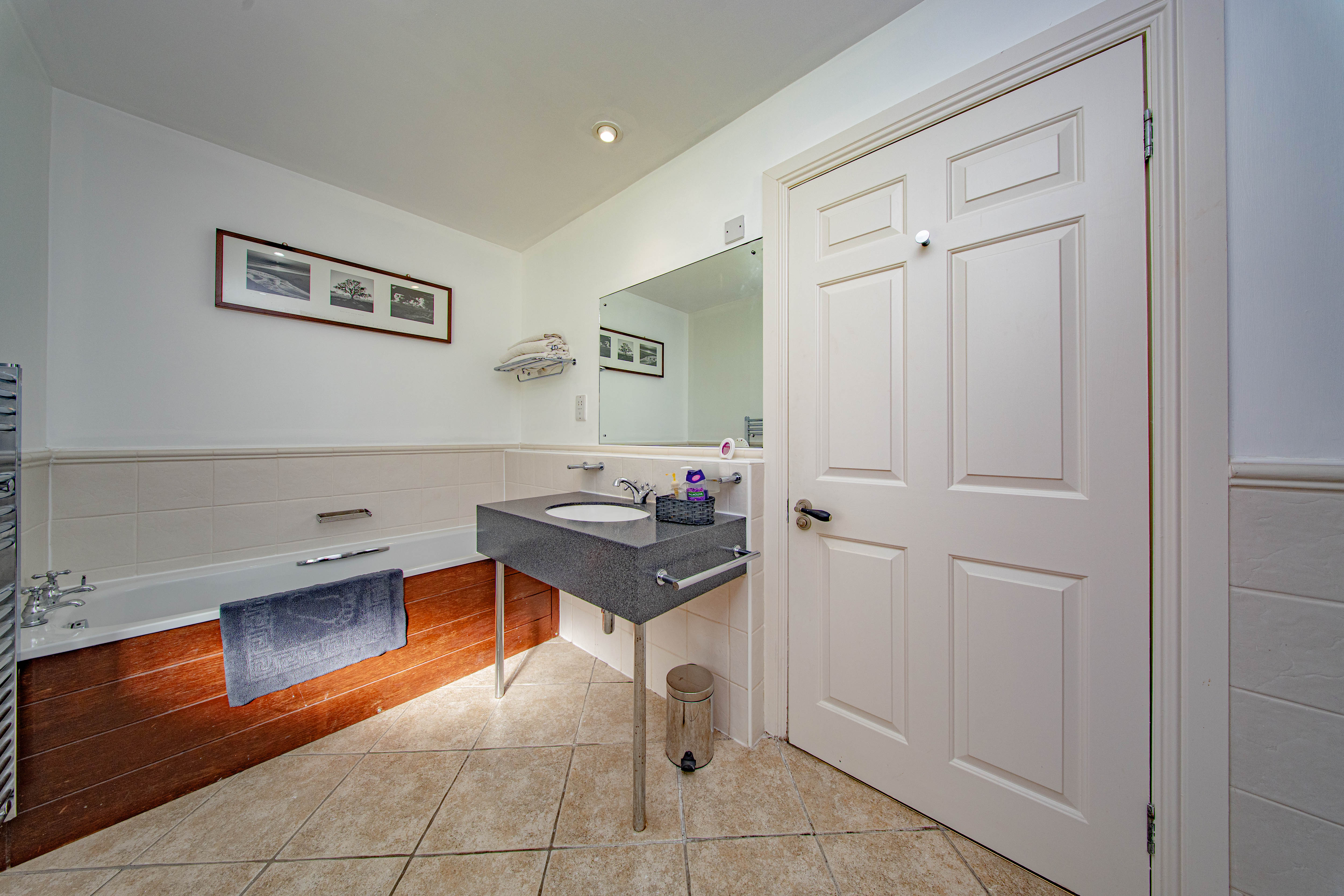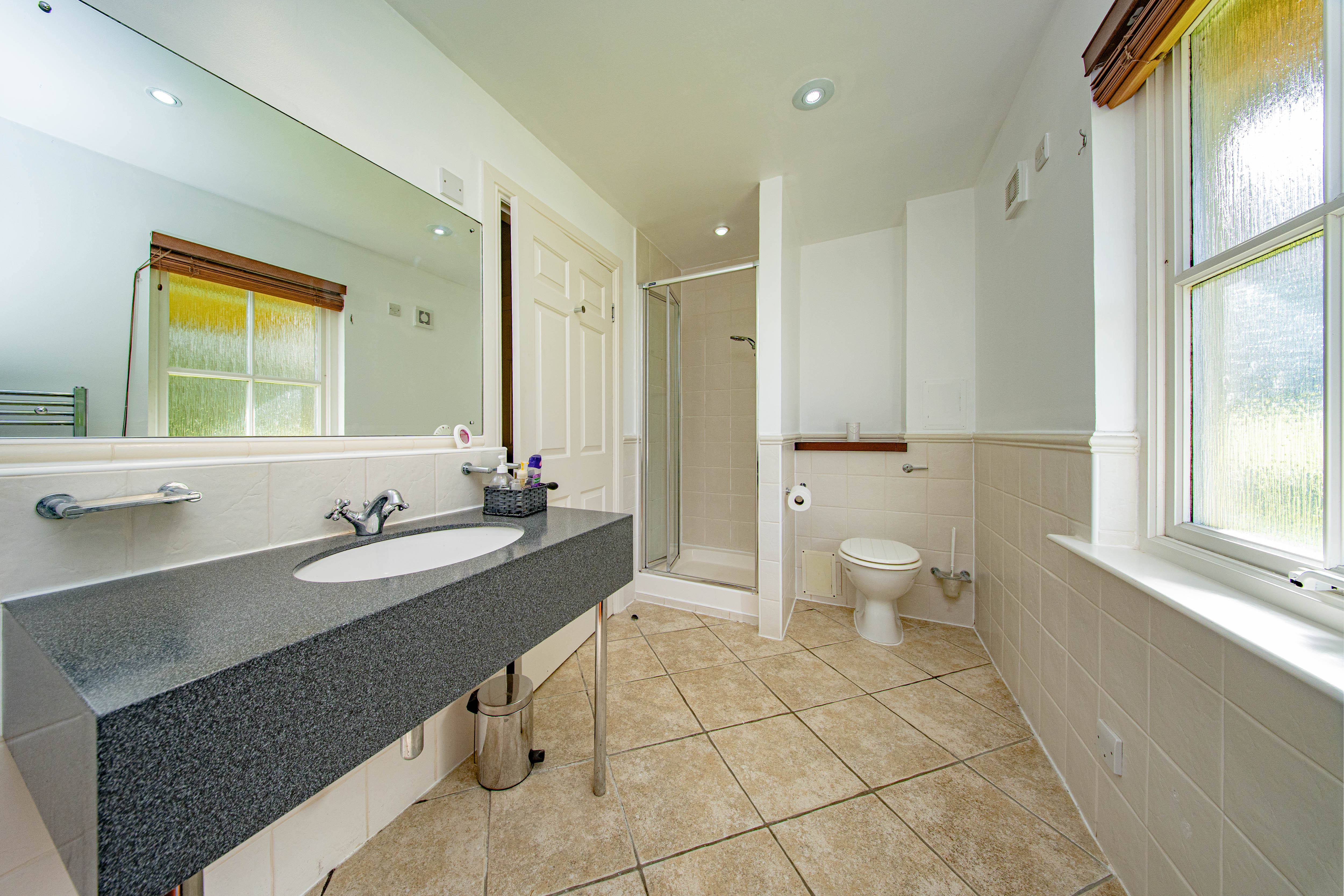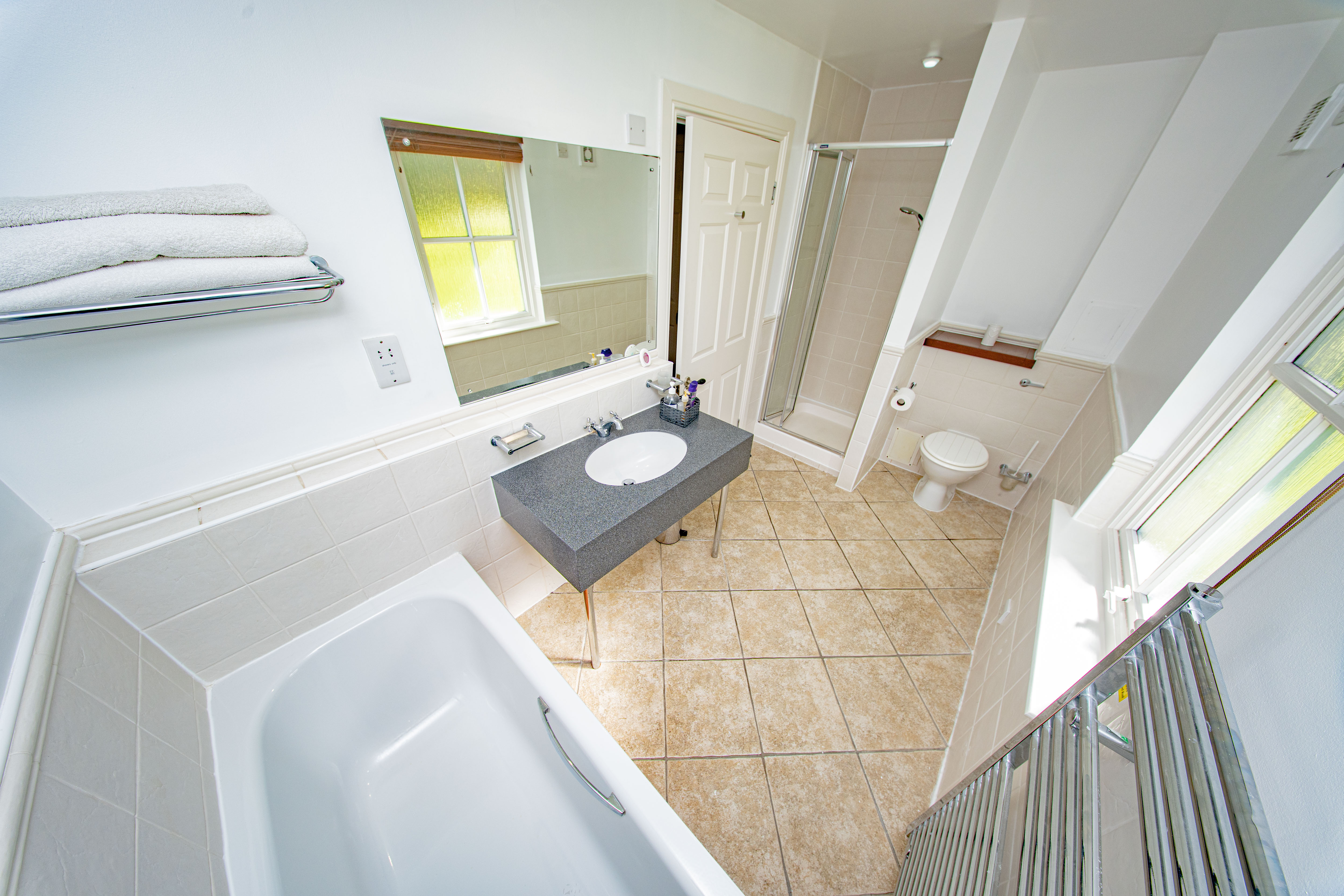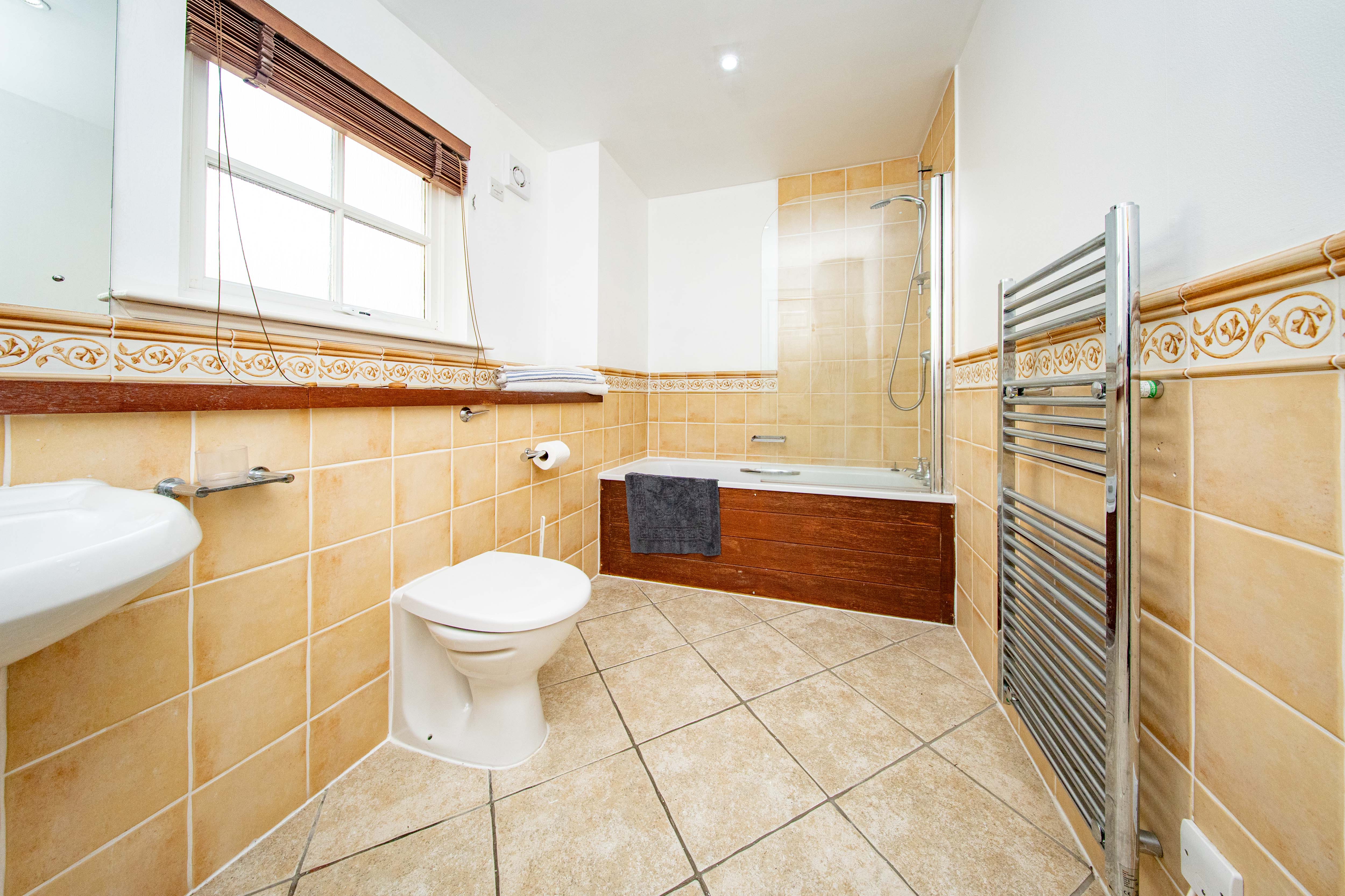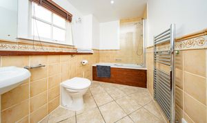 The essential En-Suite with a rear-facing window, separate bath and shower cubicle, WC and wash hand basin, complemented by a heated towel radiator and tiled flooring.