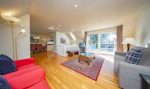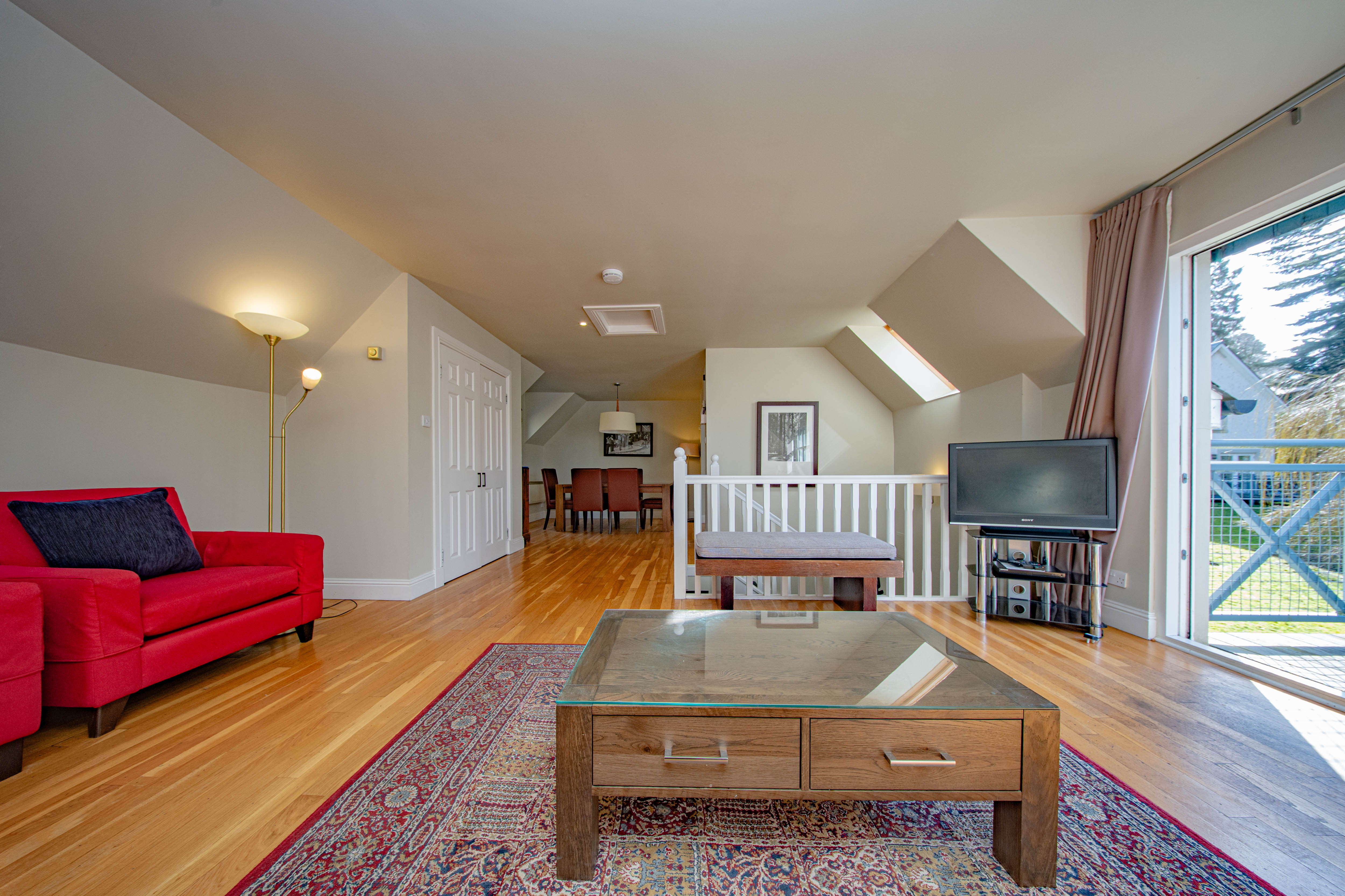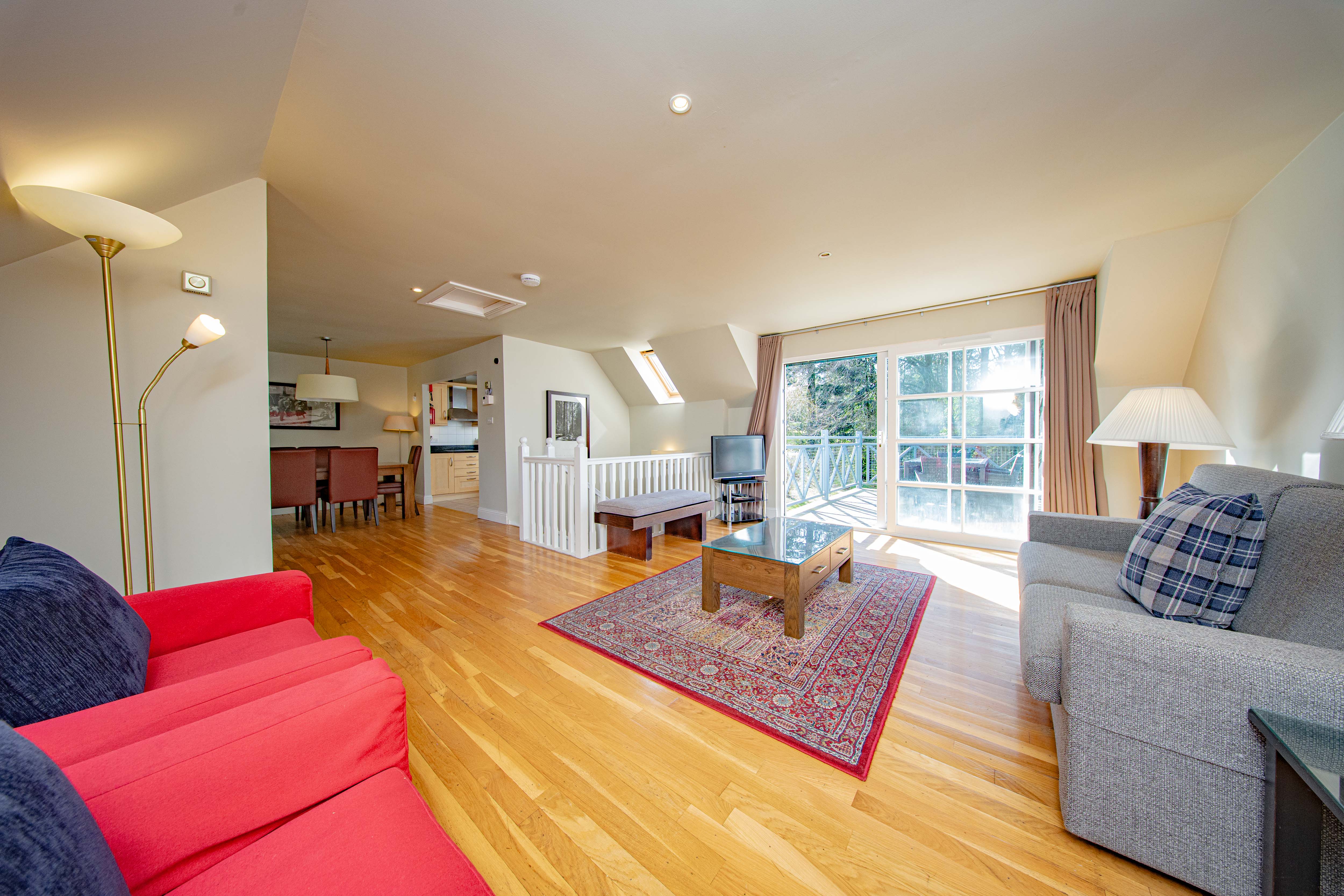 The upper level offers a striking and spacious lounge/dining area featuring attractive wooden flooring and a tasteful neutral décor, creating a bright and welcoming living space. Dual-aspect windows to the front and rear allow for an abundance of natural light, while double patio doors open out onto a beautiful balcony, offering delightful views over a tranquil woodland setting.