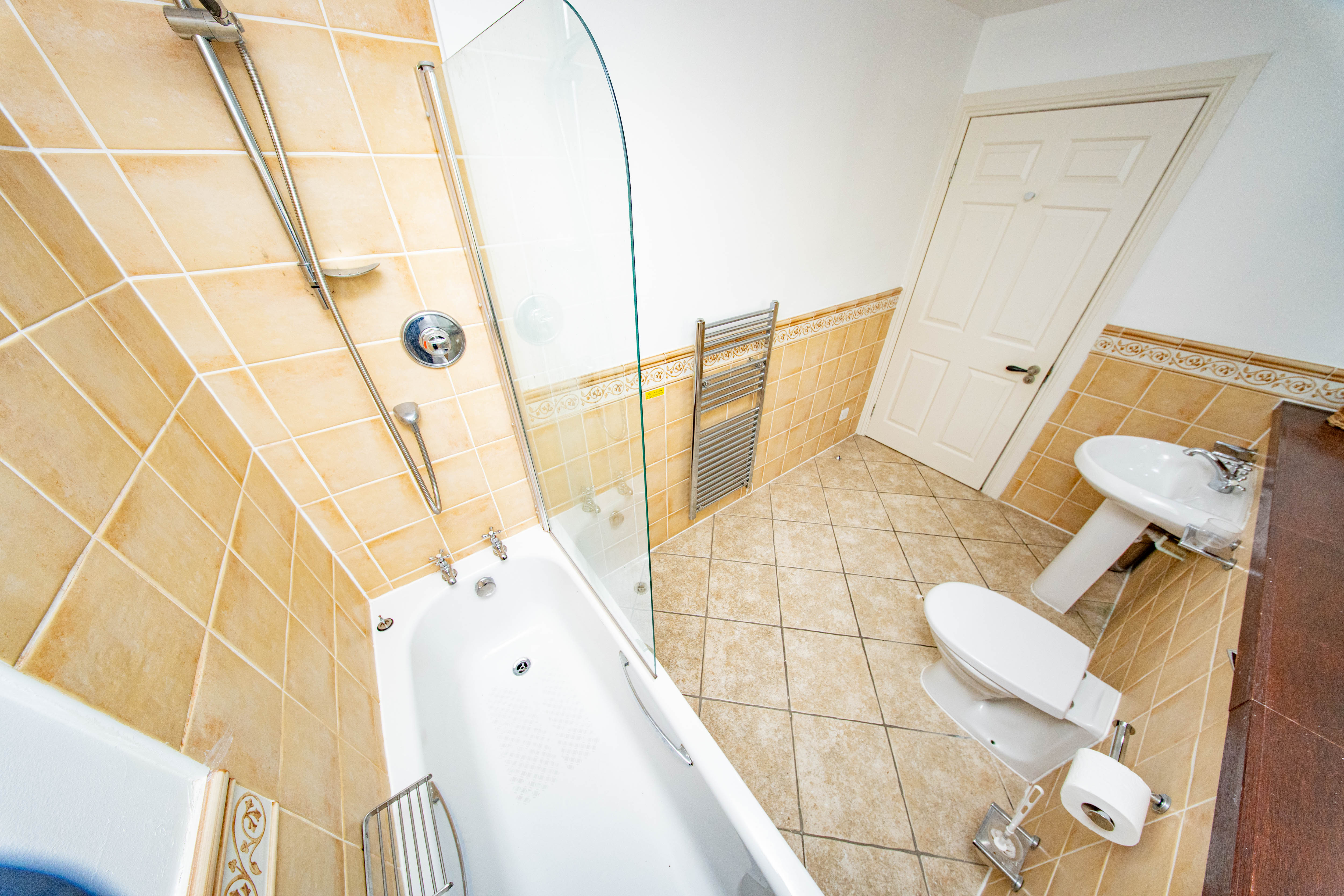 Spacious bathroom with a front-facing window, comprising of a bath and overhead electric Mira shower with glass screen, WC and wash hand basin. Partially tiled walls, neutral décor, tiled flooring, heated towel rail and extractor fan.