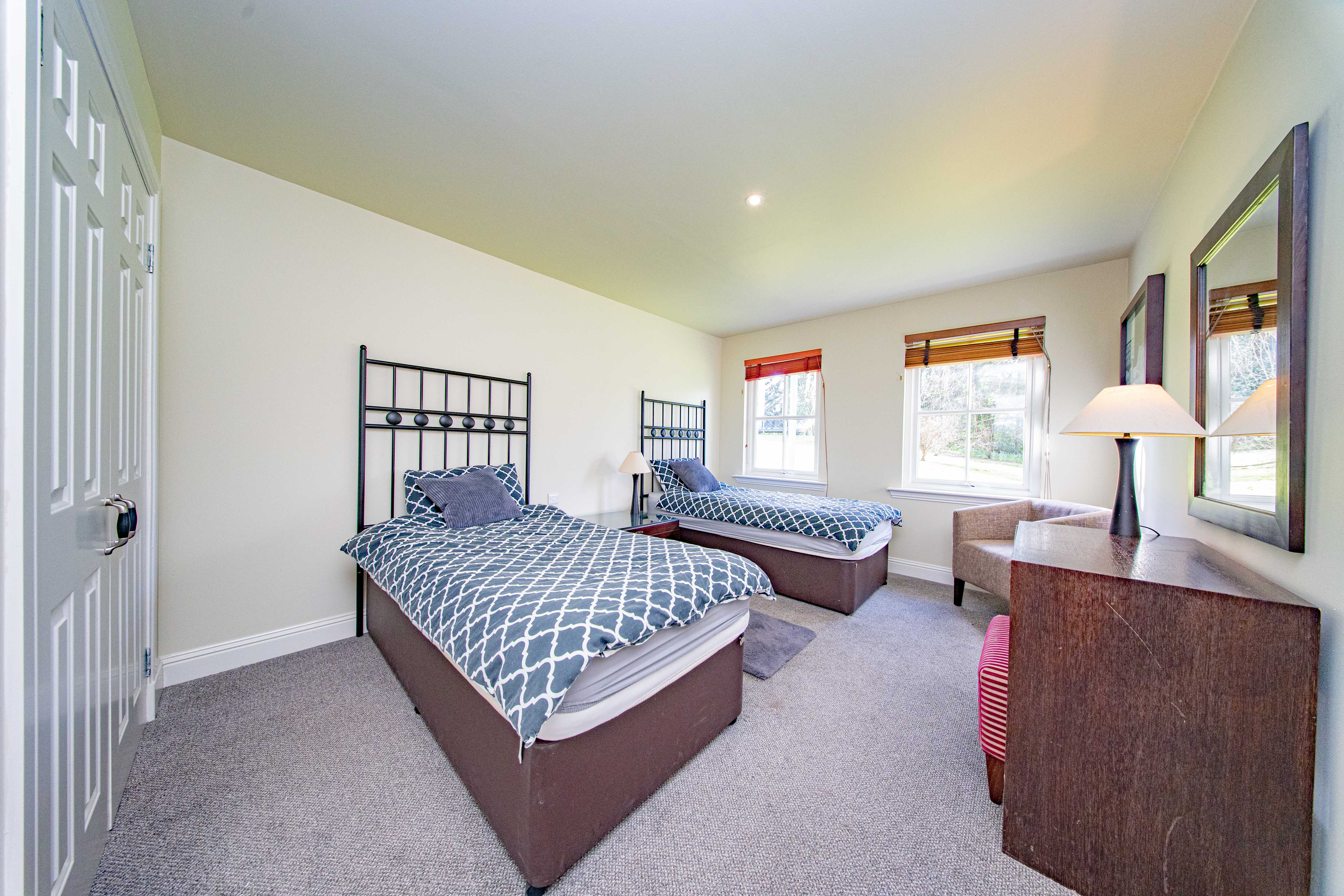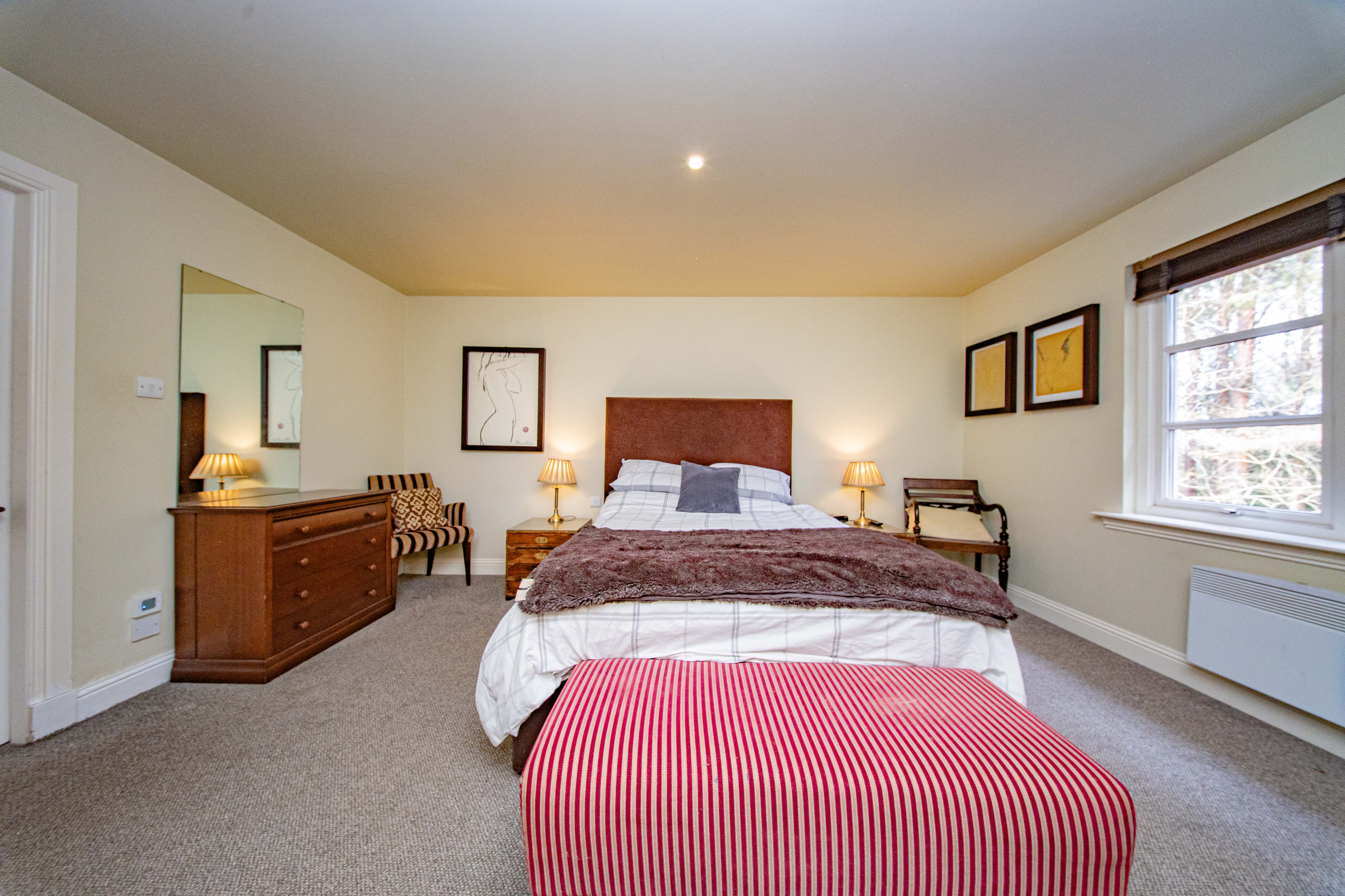 A generously sized double bedroom featuring neutral décor and carpeted flooring, along with an internal double cupboard providing useful storage. Dual-aspect rear-facing windows fill the room with natural light and offer picturesque views over the stunning woodland.