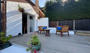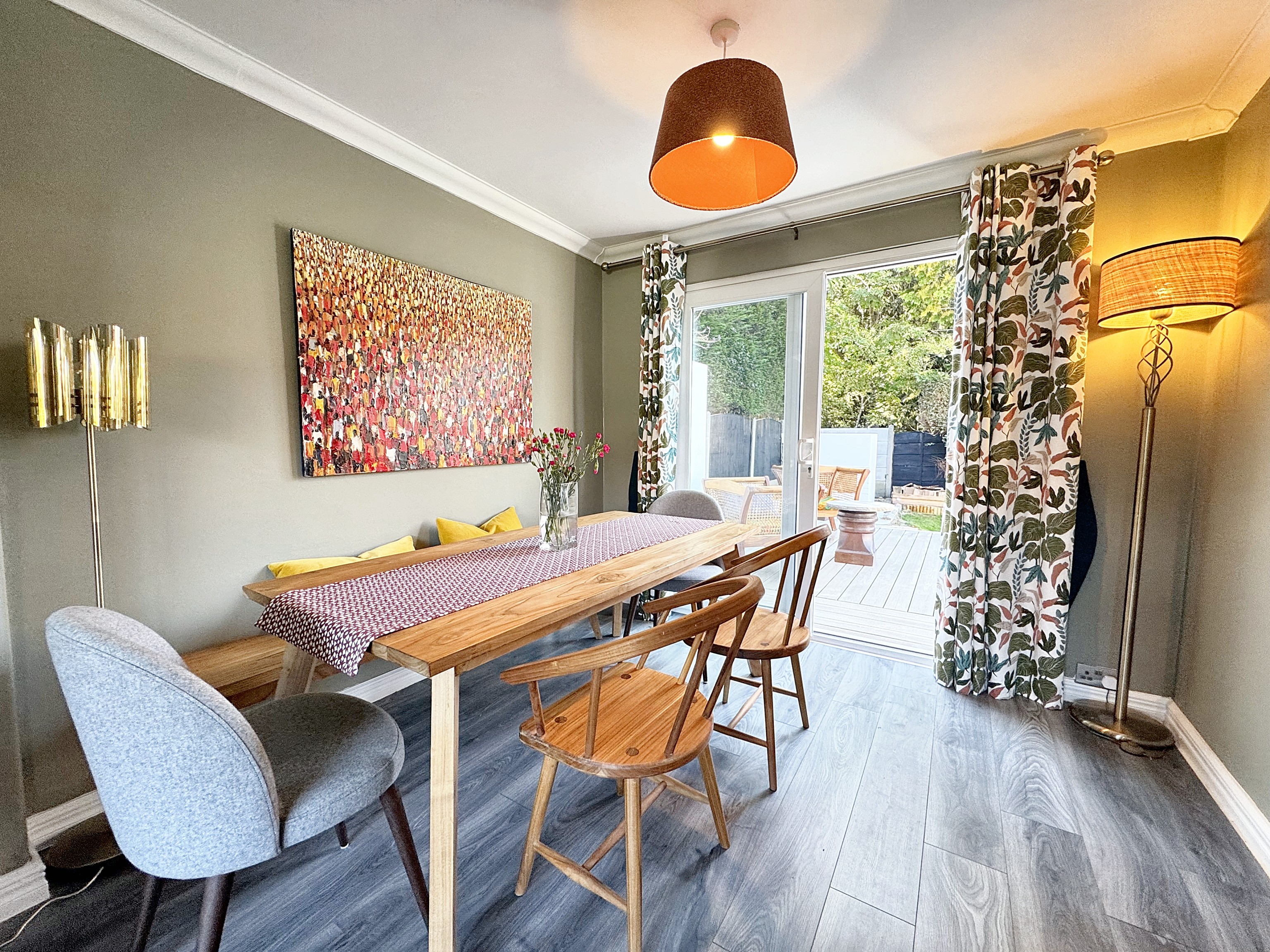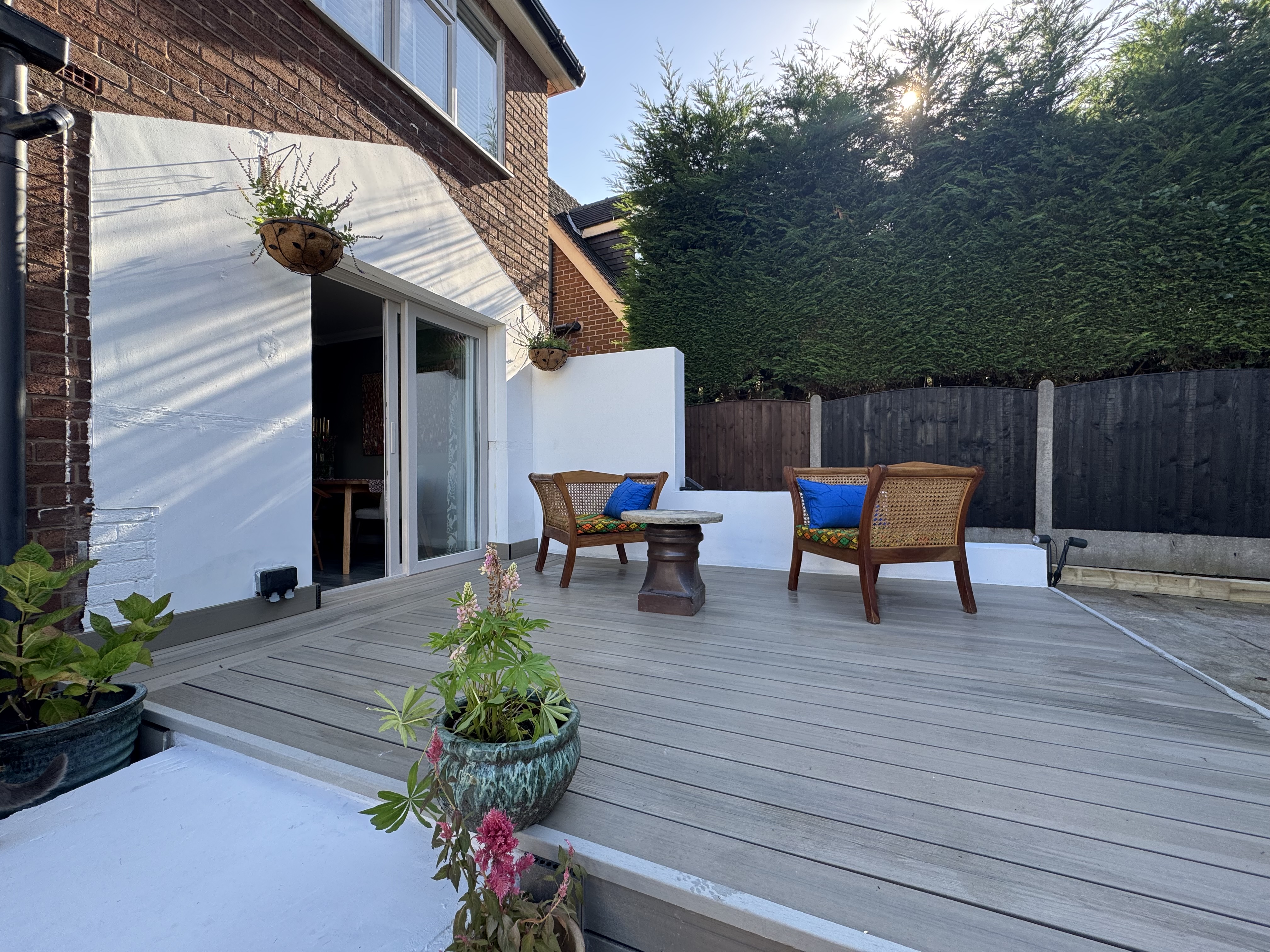 Sliding doors lead to the composite decked patio area. Ceiling coving. Internal door leads through to the kitchen.