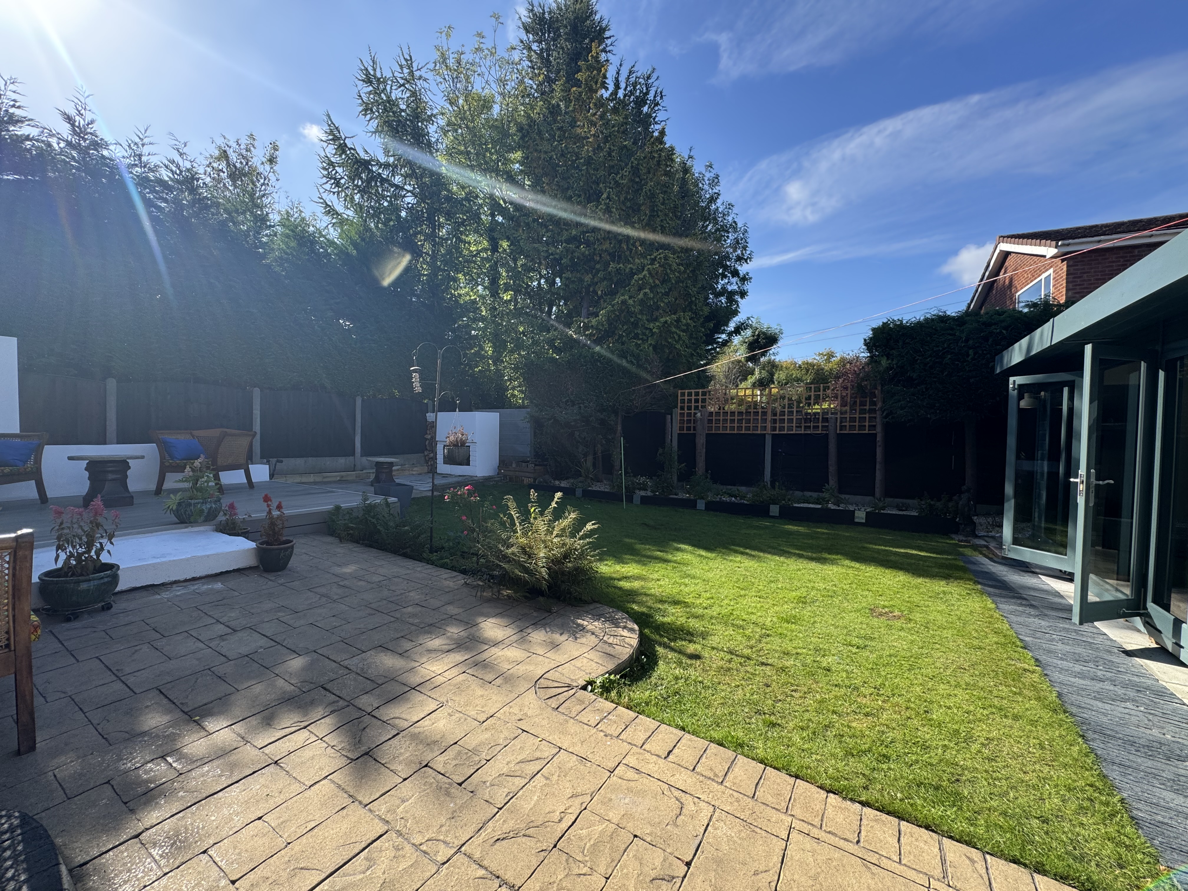 To the rear is a private South West facing garden with a neatly laid lawn with well stocked planted borders, a paved patio area and a composite decked patio with a built in outdoor fireplace and BBQ, ideal for summer entertaining or alfresco dining. Outdoor power sockets and additional 6x6ft wood shed.
