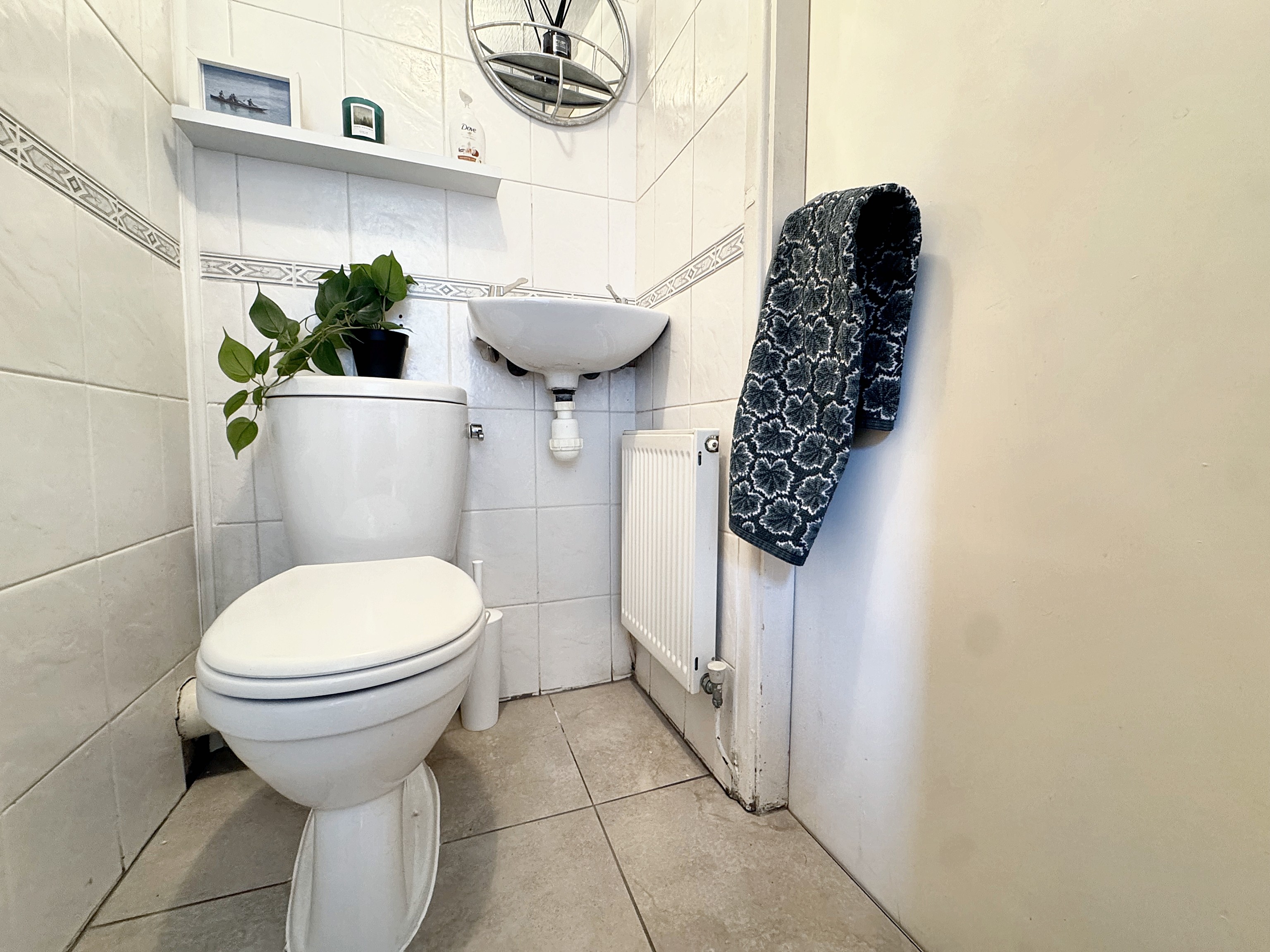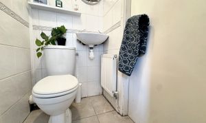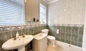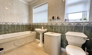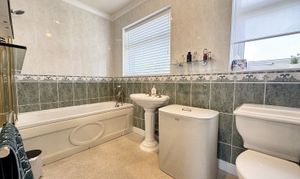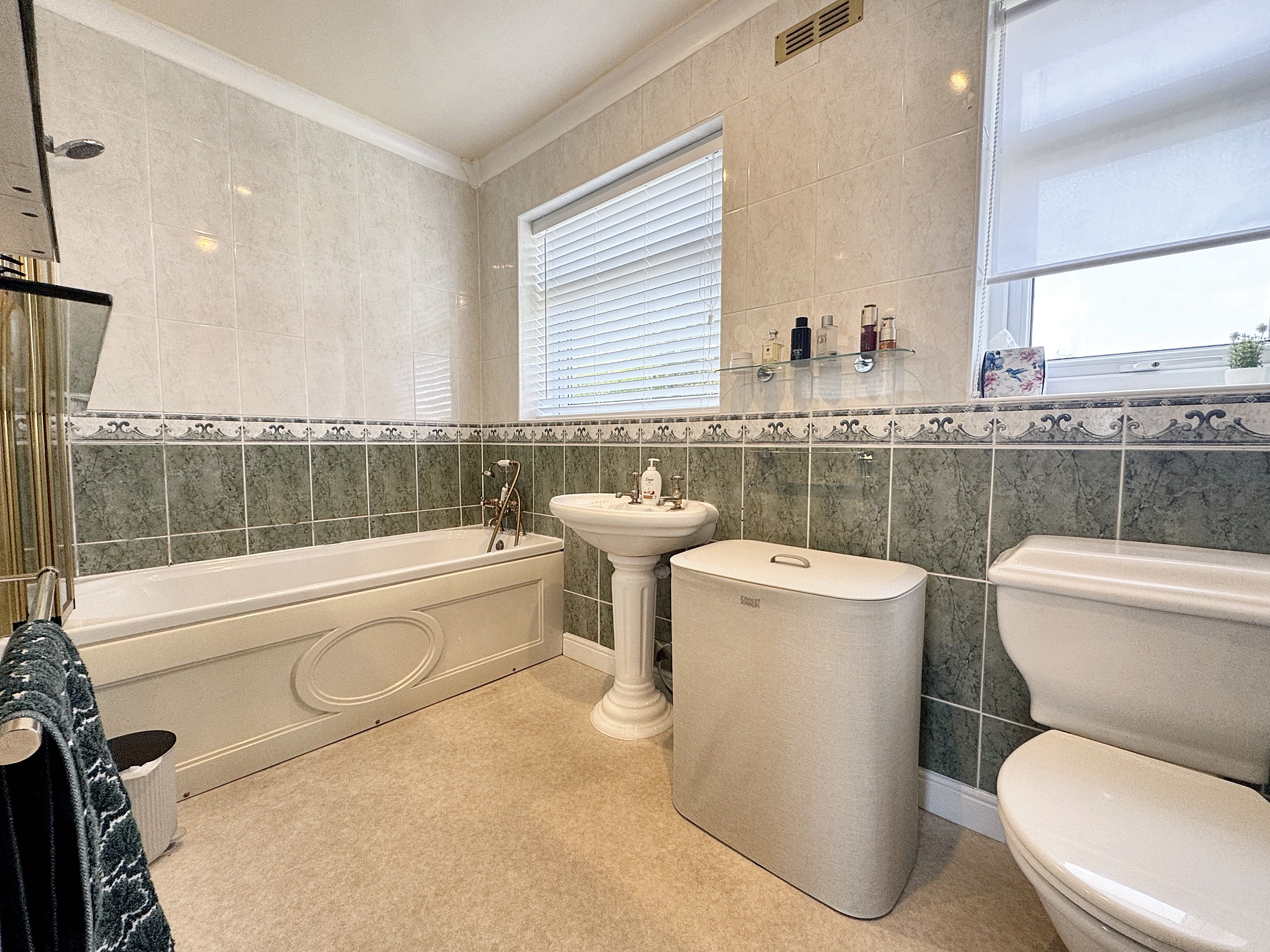 Dual windows to the rear elevation. Fully tiled walls. Ceiling coving. Inset spotlights. Fitted with a bath and electric shower, pedestal had wash basin and low level W.C.