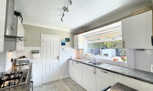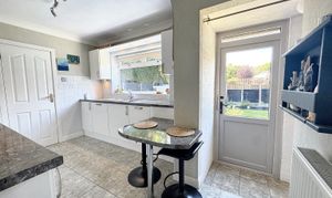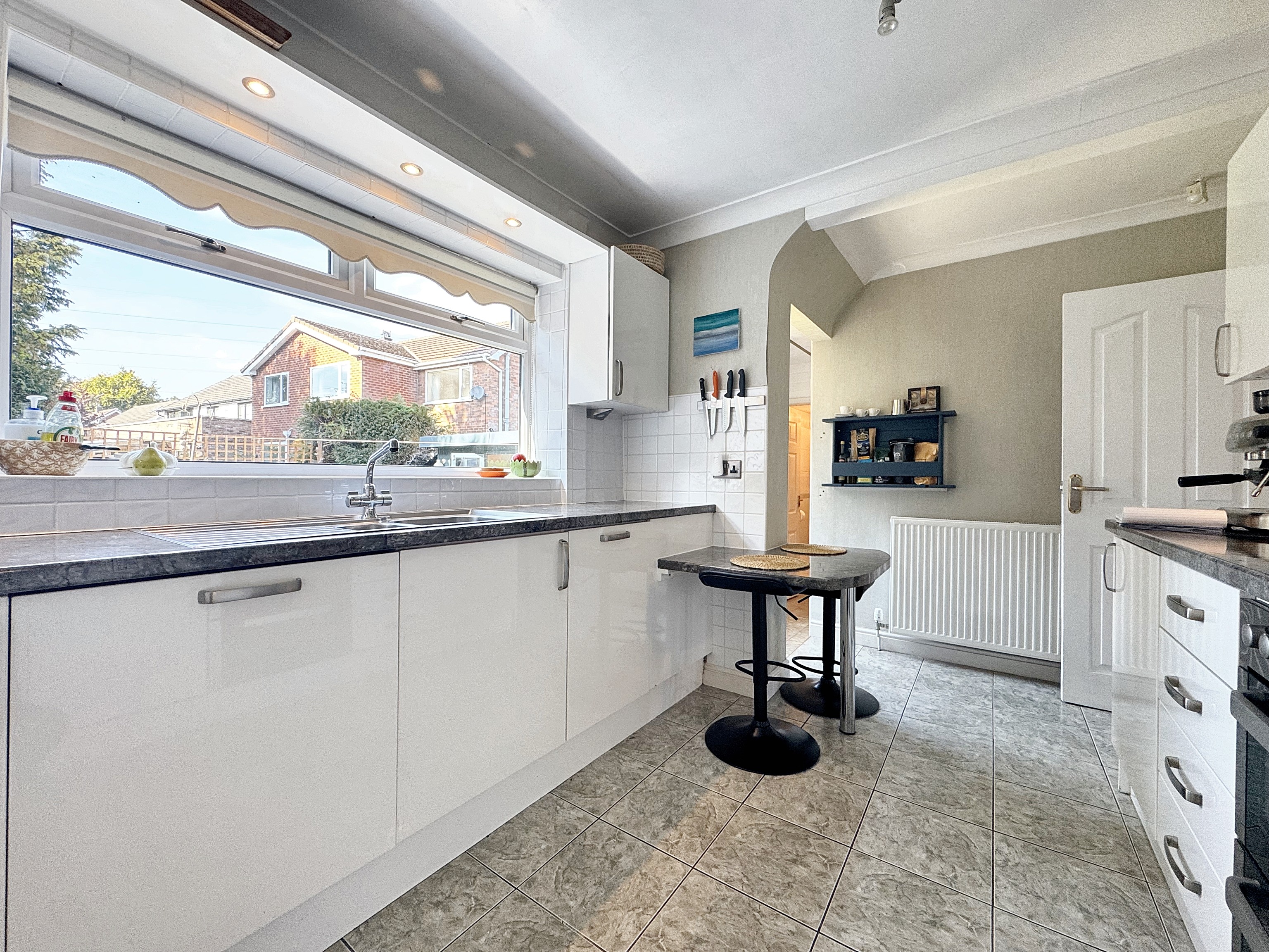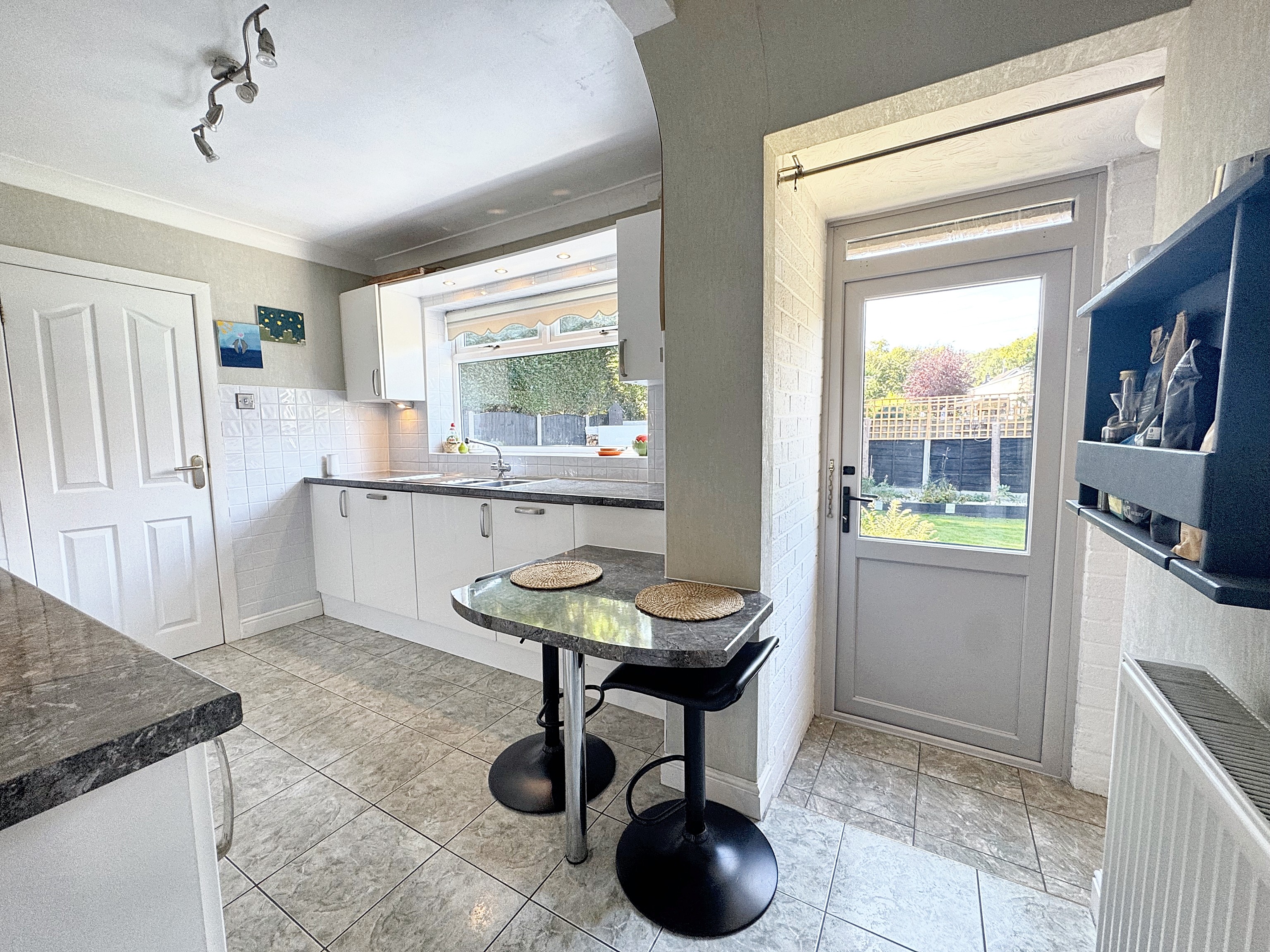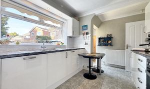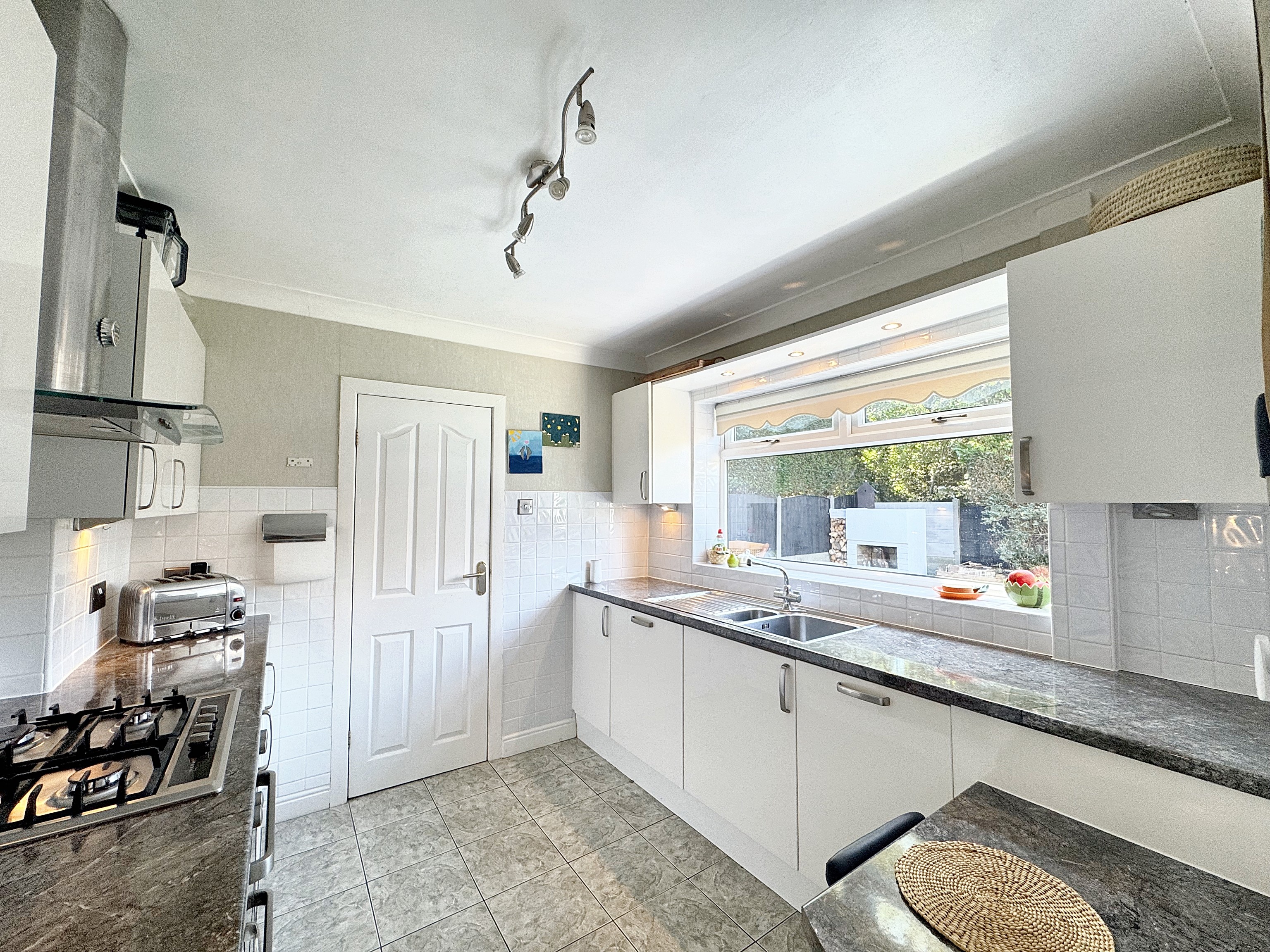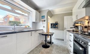 Window to the rear elevation. Fitted with a range of wall and base units complete with coordinating work surfaces and integrated appliances including: oven, hob, extractor hood, fridge, freezer and a dishwasher. Tiled floor. Ceiling coving. Open to a rear hallway with external door to the rear elevation providing access to the rear garden, under stairs store.