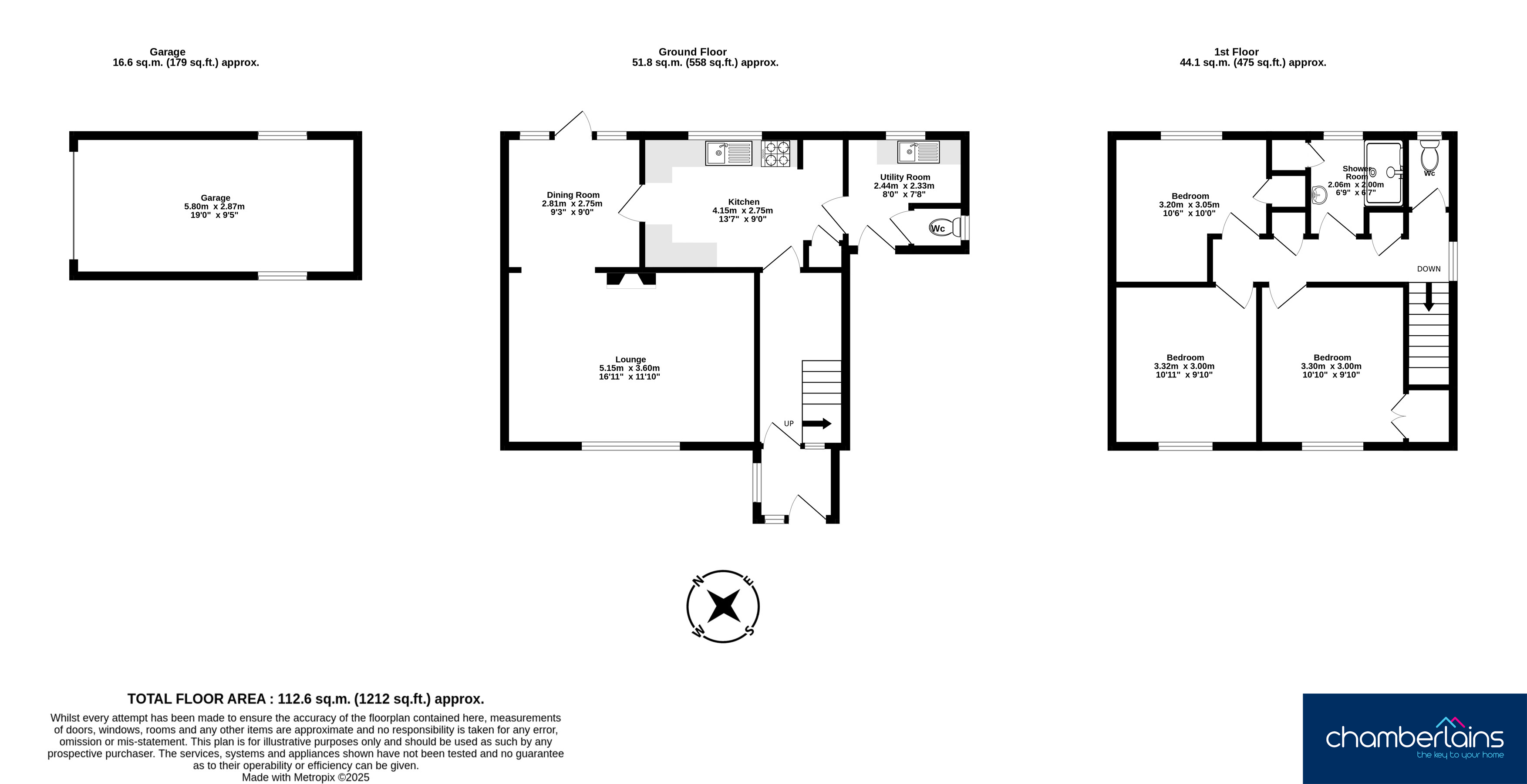 MEASUREMENTS: Lounge 5.15m x 3.60m (16’11” x 11’10”), Kitchen 4.15m x 2.75m (13’07” x 9’00”), Dining Room 2.81m x 2.75m (9’03” x 9’00”), Bedroom 3.20m x 3.05m (10’06” x 10’00”), Bedroom 3.32m x 3.00m (10’11” x 9’10”), Bedroom 3.30m x 3.00m (10’10 × 9’10”), Garage 5.80m x 2.87m (19’00” x 9’05”).