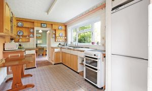 The kitchen has a lovely outlook onto the rear garden and is fitted with a range of wall and base mounted units with space for a cooker and fridge/freezer, double drainer stainless steel sink and a useful storage cupboard.