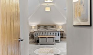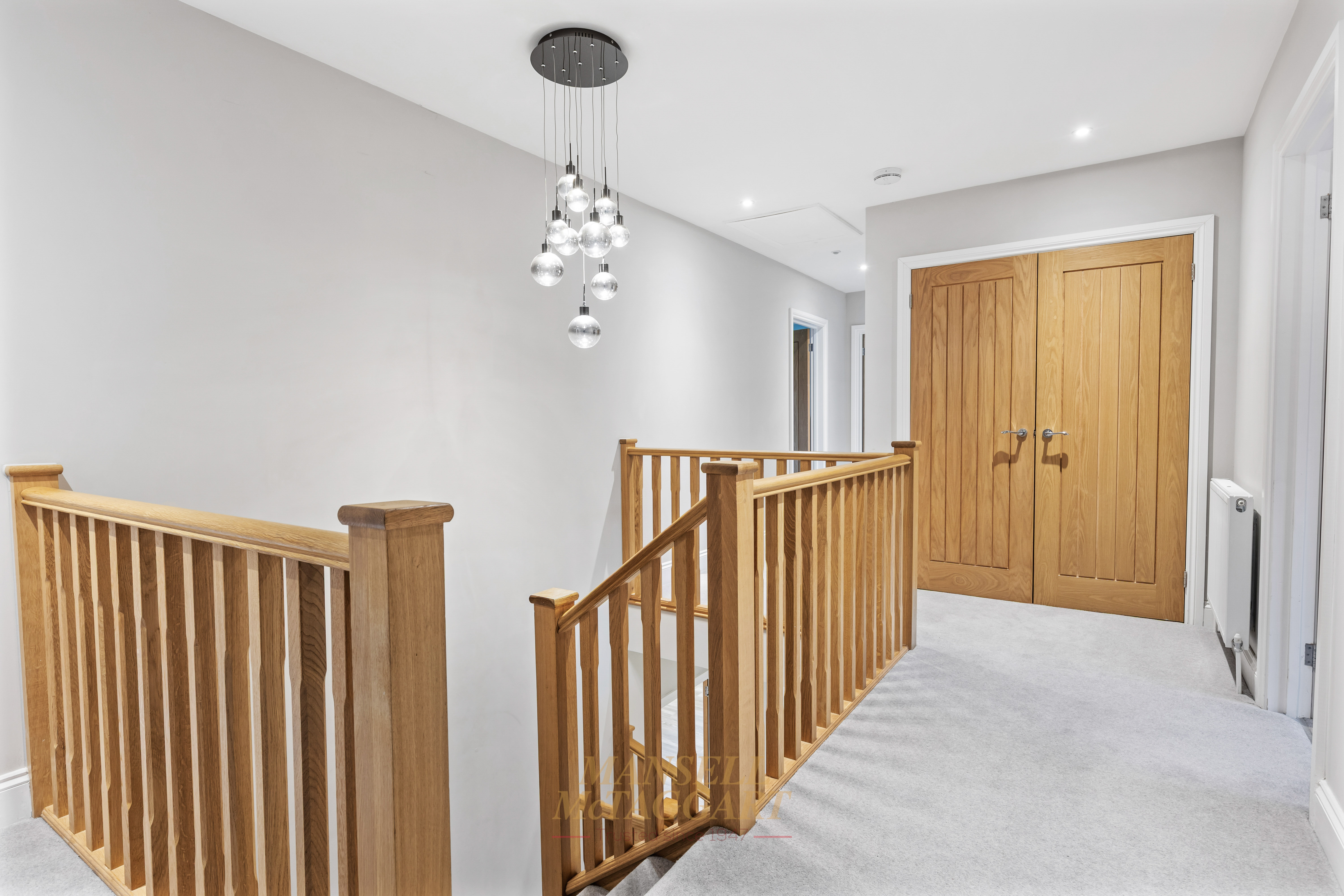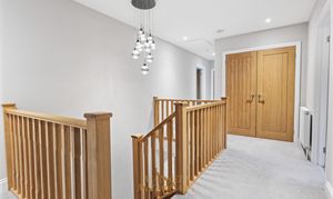 The ground floor benefits from underfloor heating throughout, bespoke window shutters, and an oak staircase rising to the first-floor galleried landing.