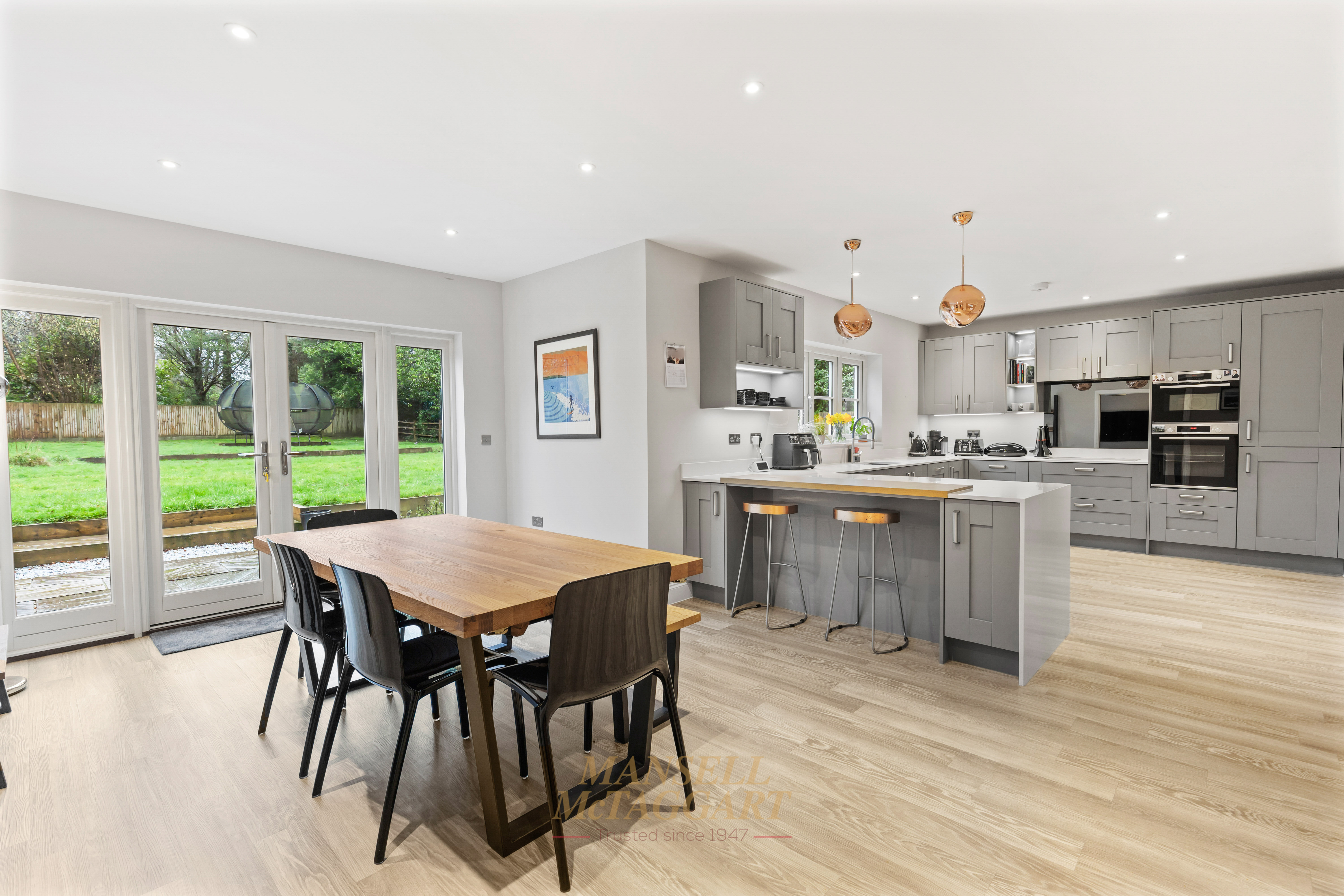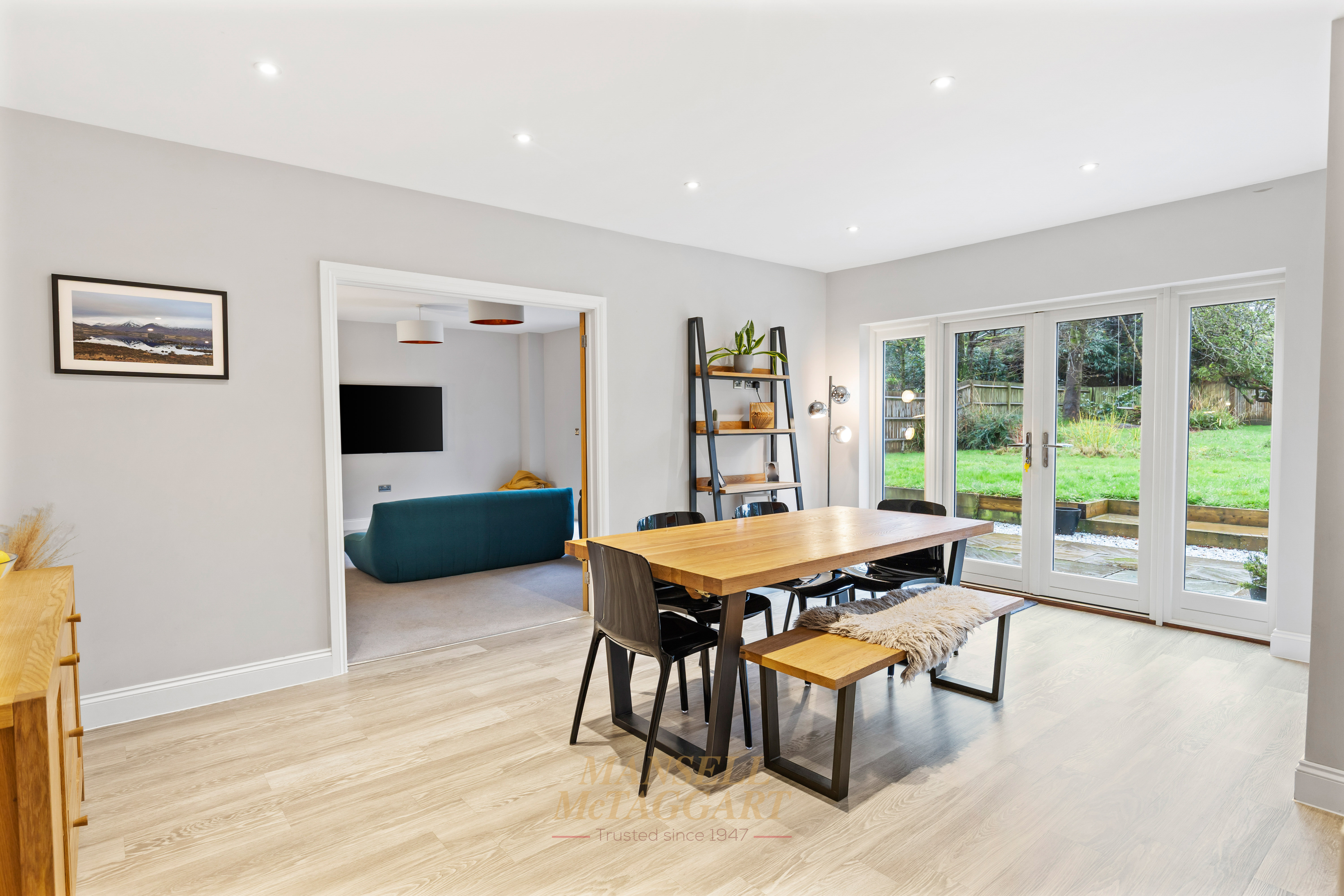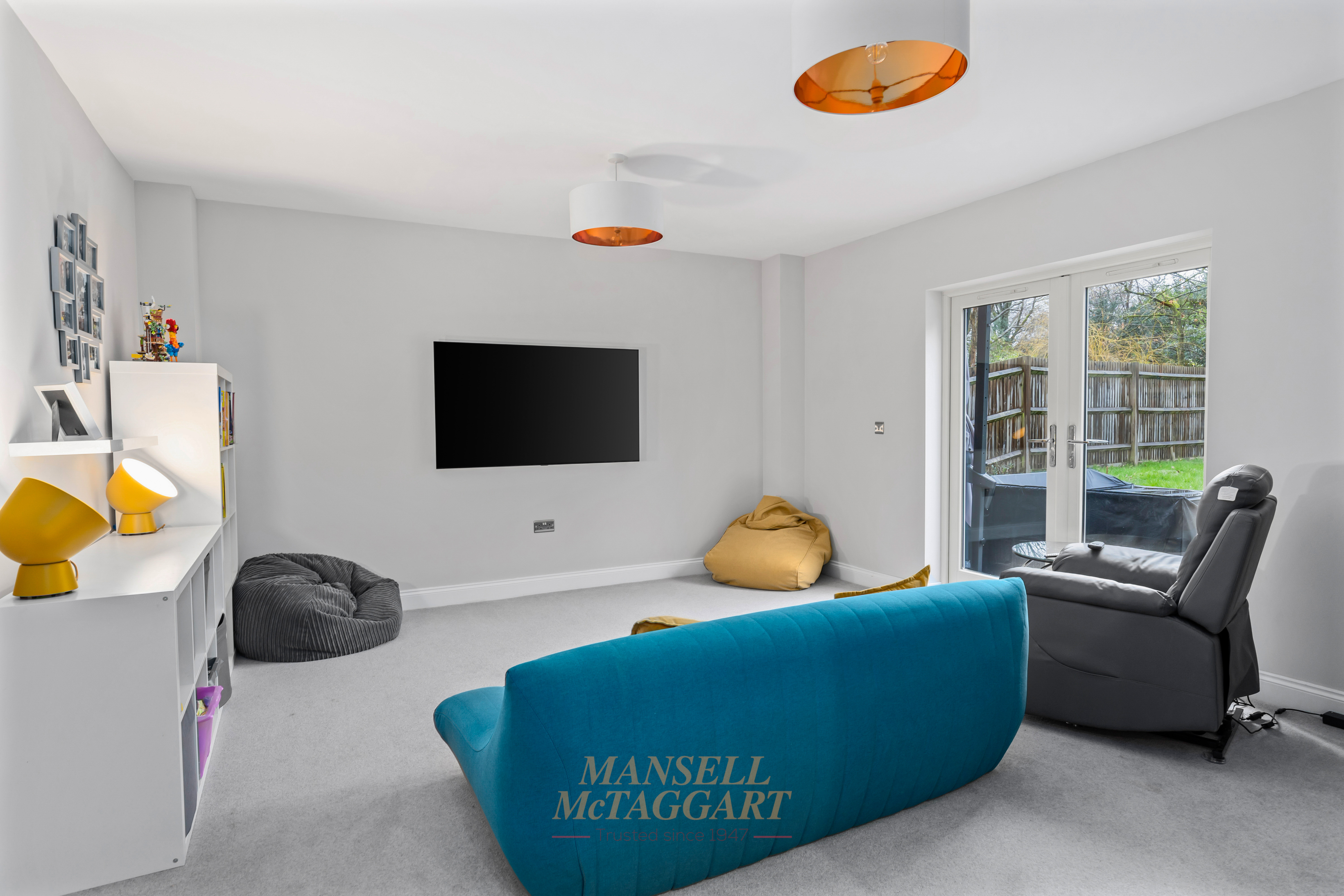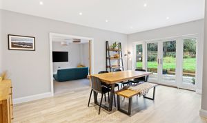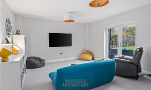 The dining area offers ample space for a 12-seater table and benefits from double doors opening into the family room. This versatile space overlooks the rear garden and is currently used as a cinema room.