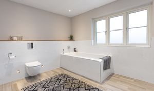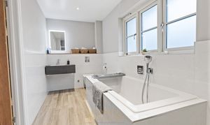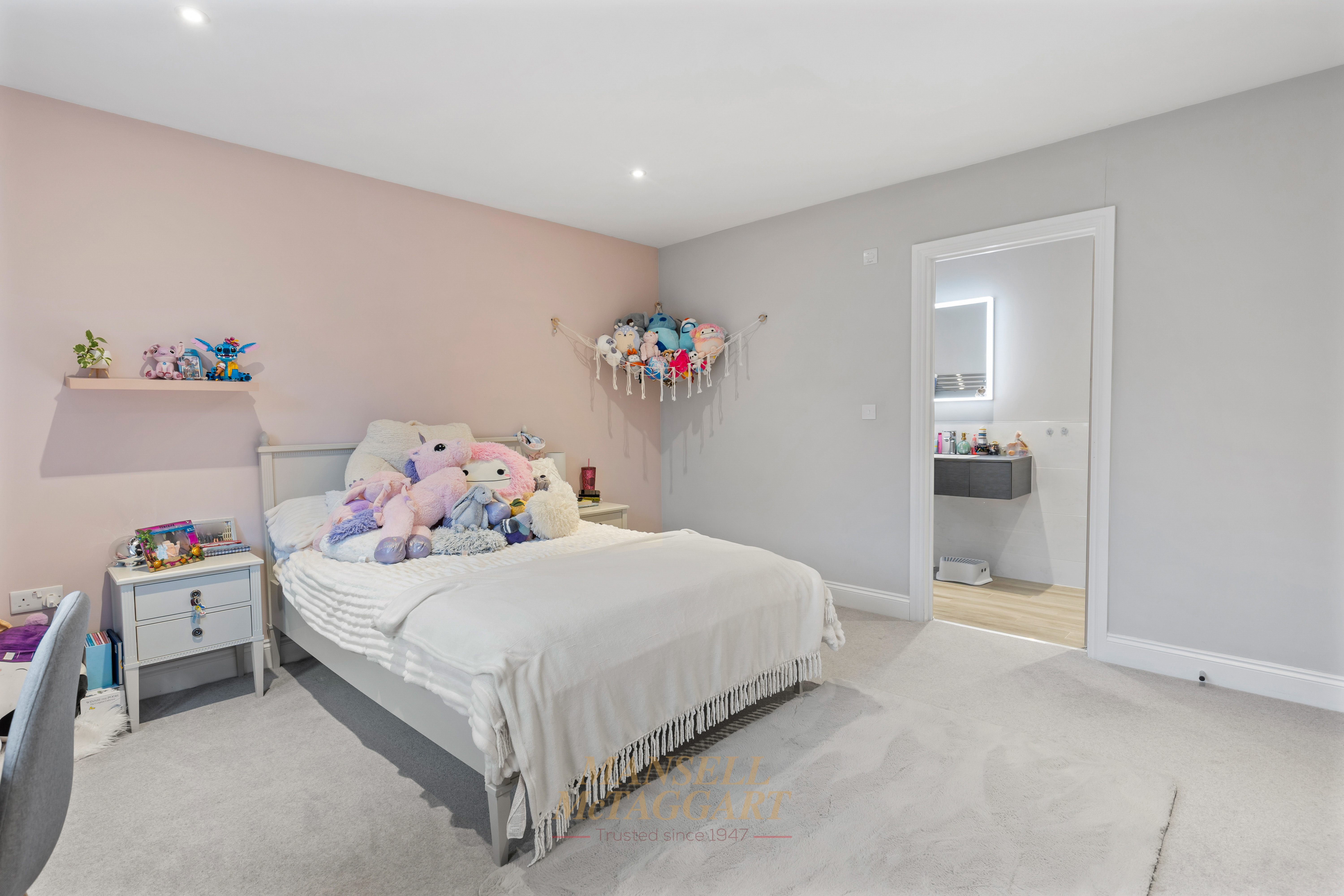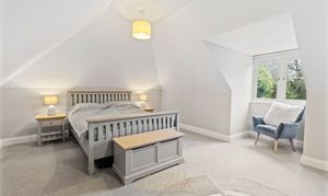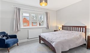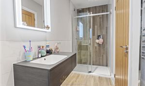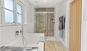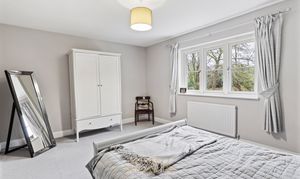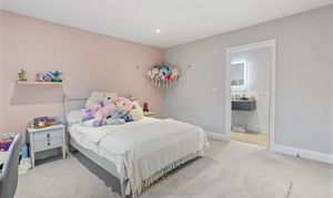 The second bedroom is also a spacious double and benefits from its own en-suite shower room, fitted with a frameless sliding shower door, Hansgrohe shower set, WC, and wall-hung vanity unit. There are three further well-proportioned double bedrooms, all served by a contemporary family bathroom.
