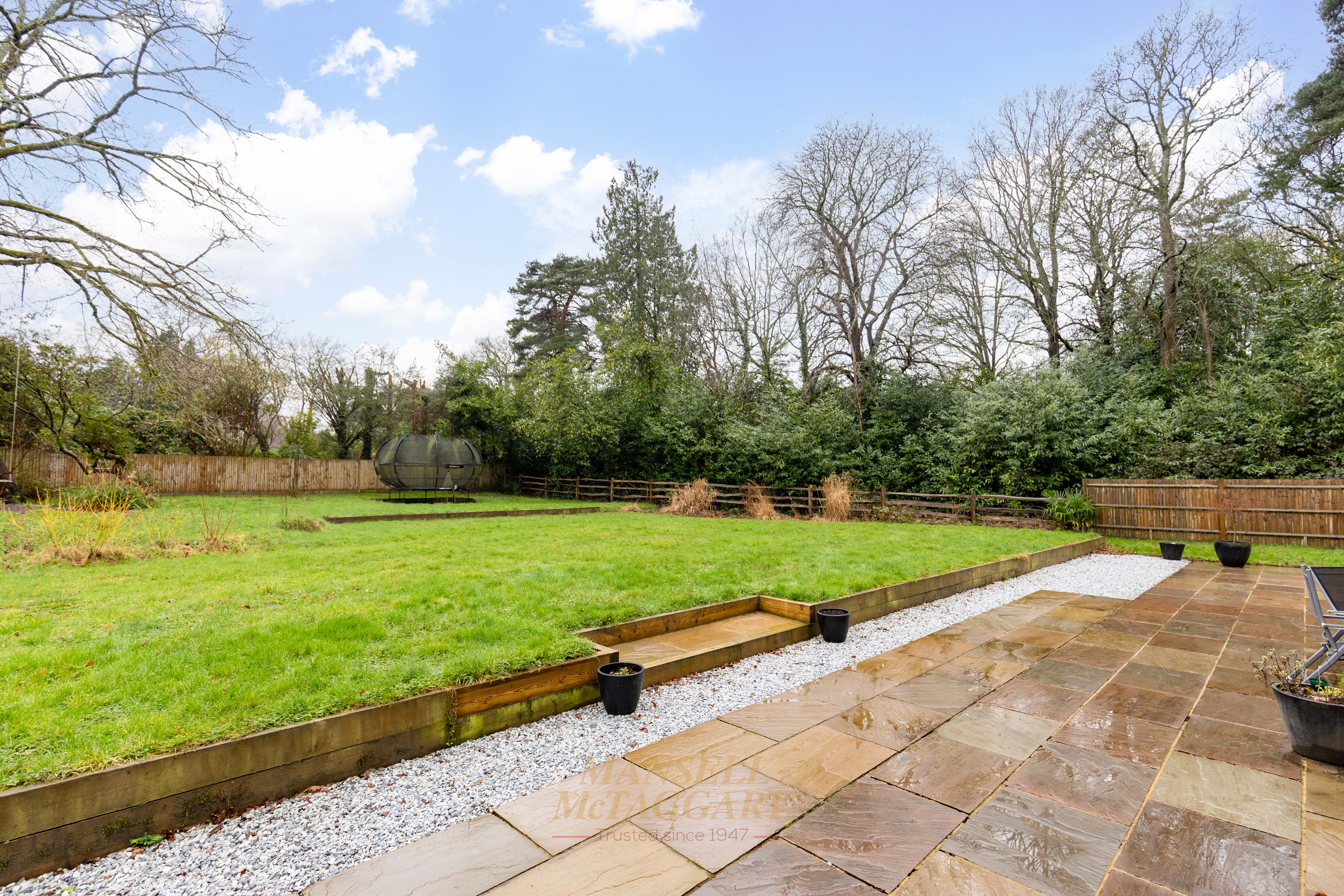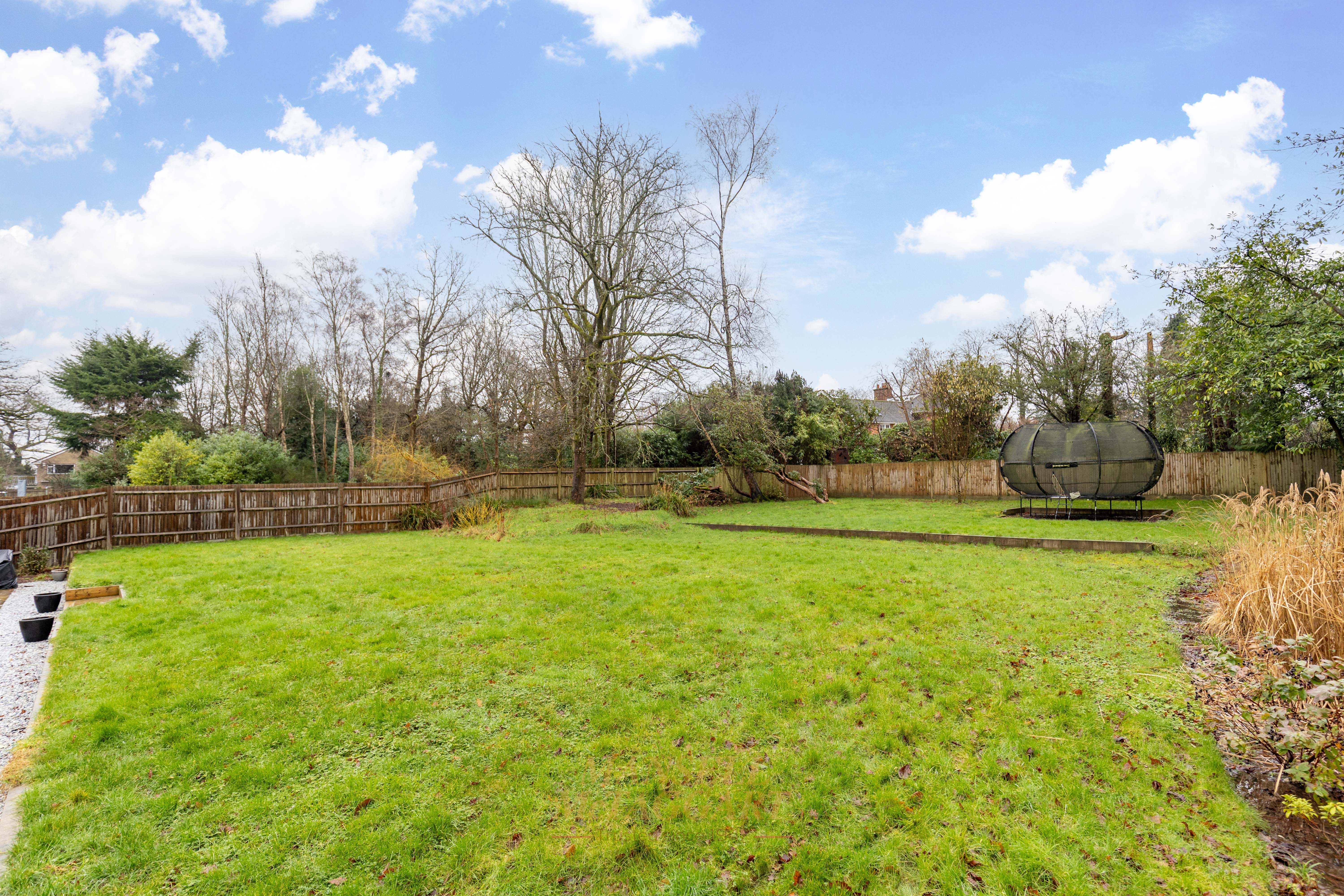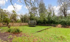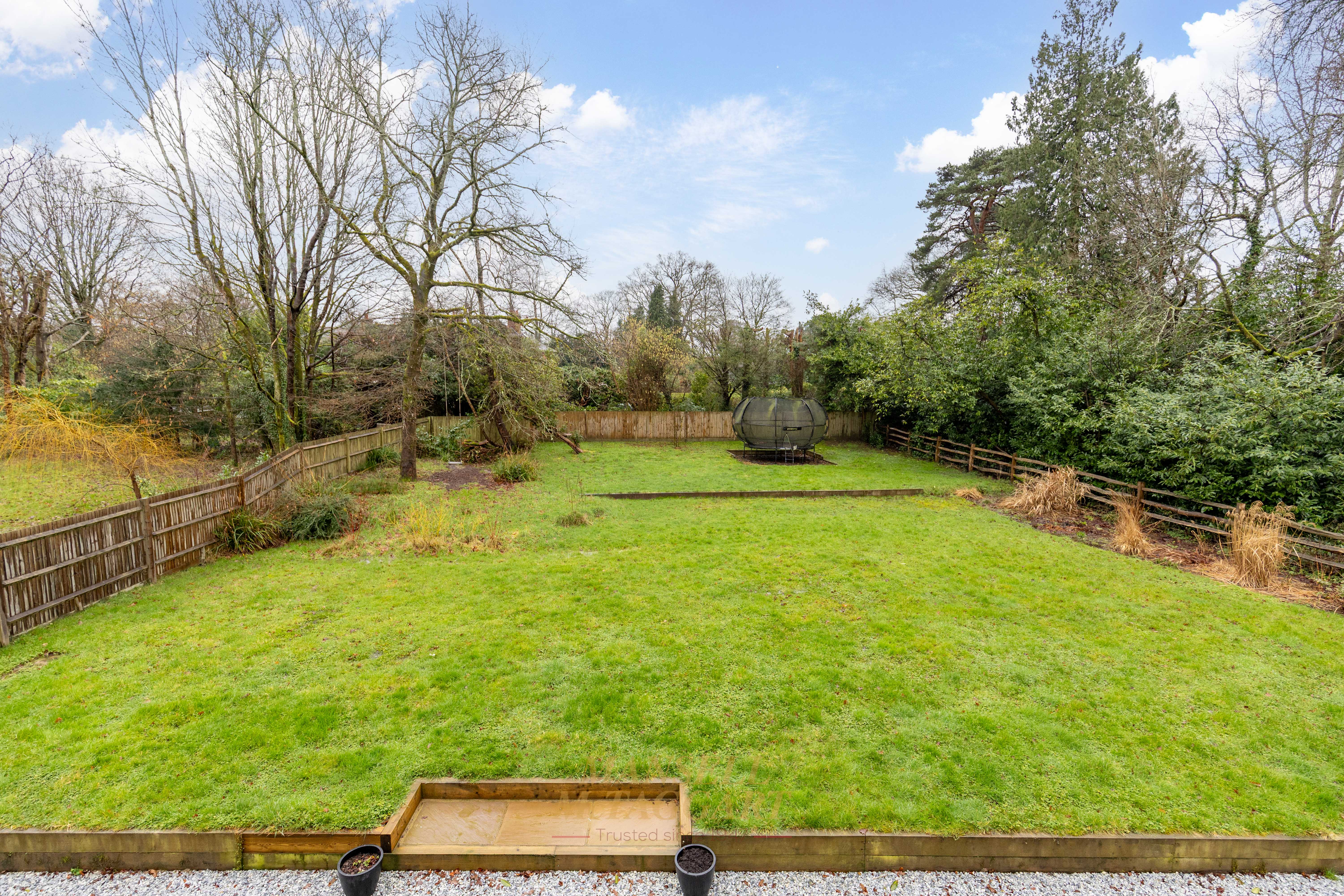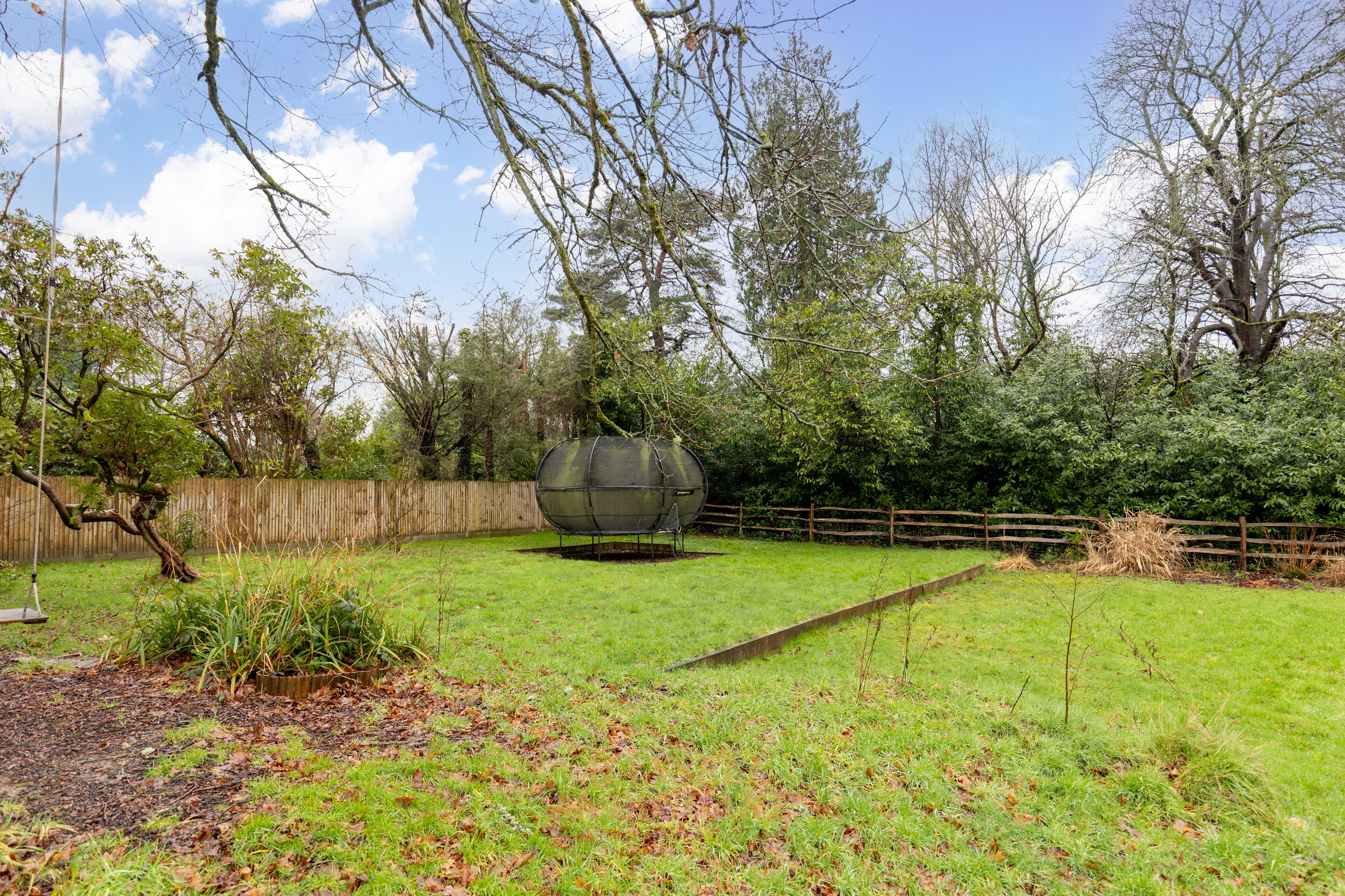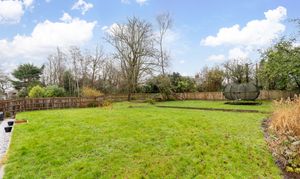 The rear garden is predominantly laid to a sandstone patio, with the remainder laid to lawn. Beyond the garden lies attractive woodland, and the entire space is enclosed by part post-and-rail fencing, creating a peaceful and private outdoor setting.